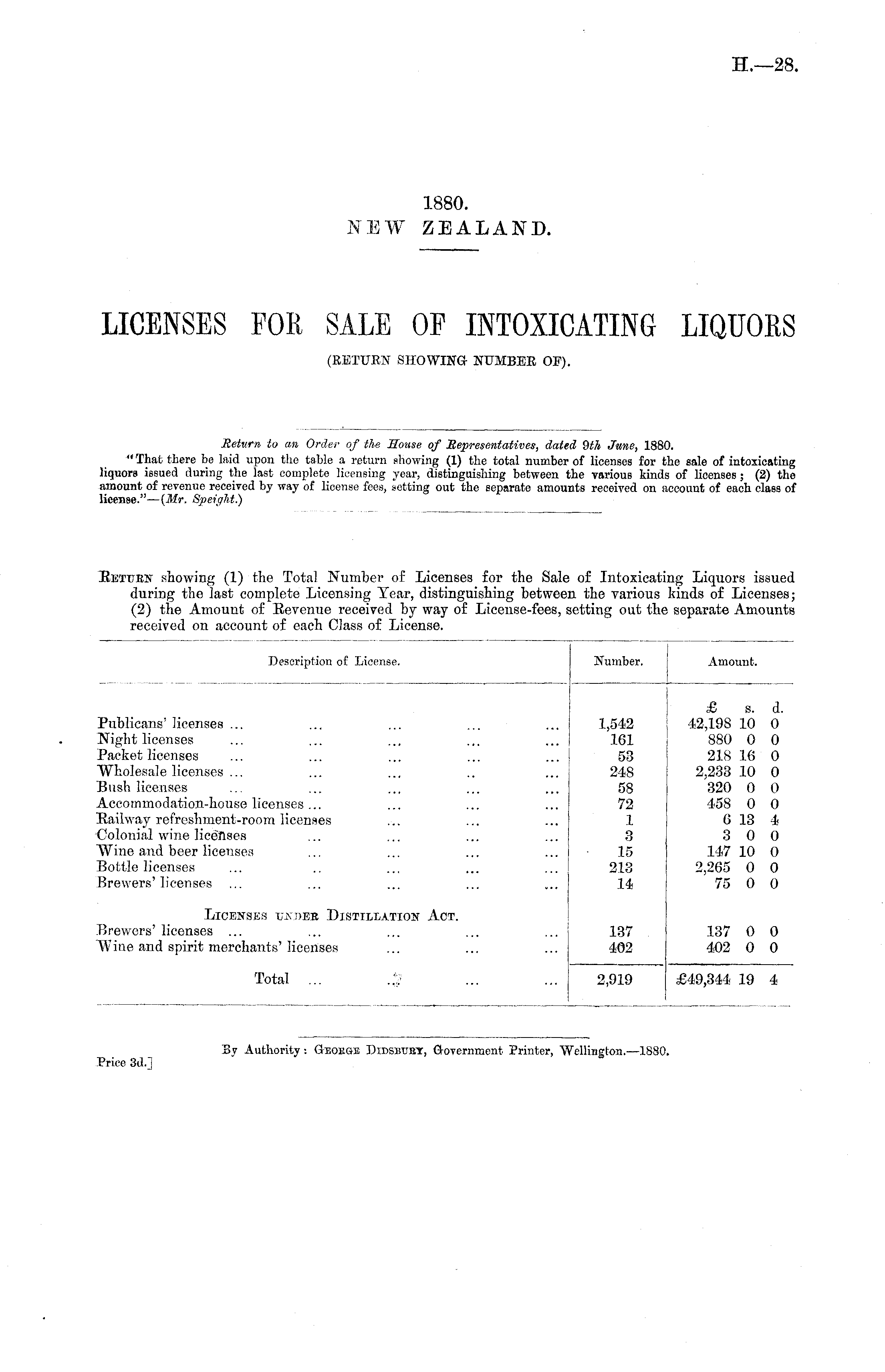Return to an Order of the Souse of Representatives, dated 9th, June, 1880. " That there be laid upon the table a return showing (1) the total number of licenses for the sale of intoxicating liquors issued during the last complete licensing year, distinguishing between the various kinds of licenses ; (2) the amount of revenue received by way of license fees, setting out the separate amounts received on account of each class of license." — (Mr. Speight.)