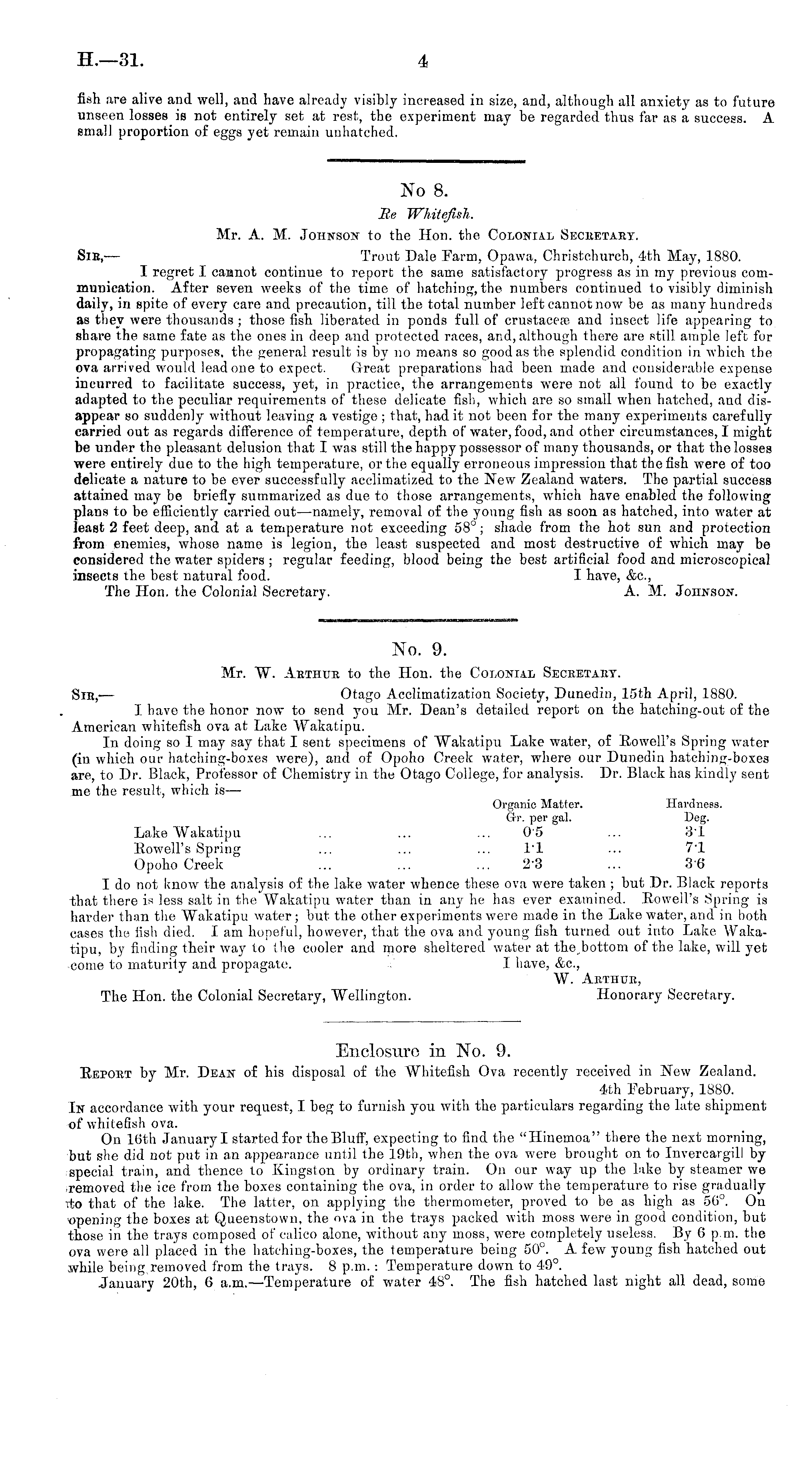 Enclosure in No. 9. Eepoet by Mr. Dean of his disposal of the Whitefish Ova recently received in New Zealand. 4th February, 1880. In accordance with your request, I beg to furnish you with the particulars regarding the late shipment of whitefish ova. On 16th January I started for the Bluff, expecting to find the "Hinemoa" there the next morning, but she did not put in an appearance until the 19th, when the ova were brought on to Invercargill by special train, and thence to Kingston by ordinary train. On our way up the Like by steamer we -removed the ice from the boxes containing the ova, in order to allow the temperature to rise gradually tfco that of the lake. The latter, on applying the thermometer, proved to be as high as 50°. On opening the boxes at Queenstown, the ova in the trays packed with moss were in good condition, but those in the trays composed of calico alone, without any moss, were completely useless. By 6 p.m. the ova were all placed in the hatching-boxes, the temperature being 50°. A few young fish hatched out while being removed from the trays. 8 p.m.: Temperature down to -19°. January 20th, 6 a.m. —Temperature of water 48°. The fish hatched last night all dead, some
