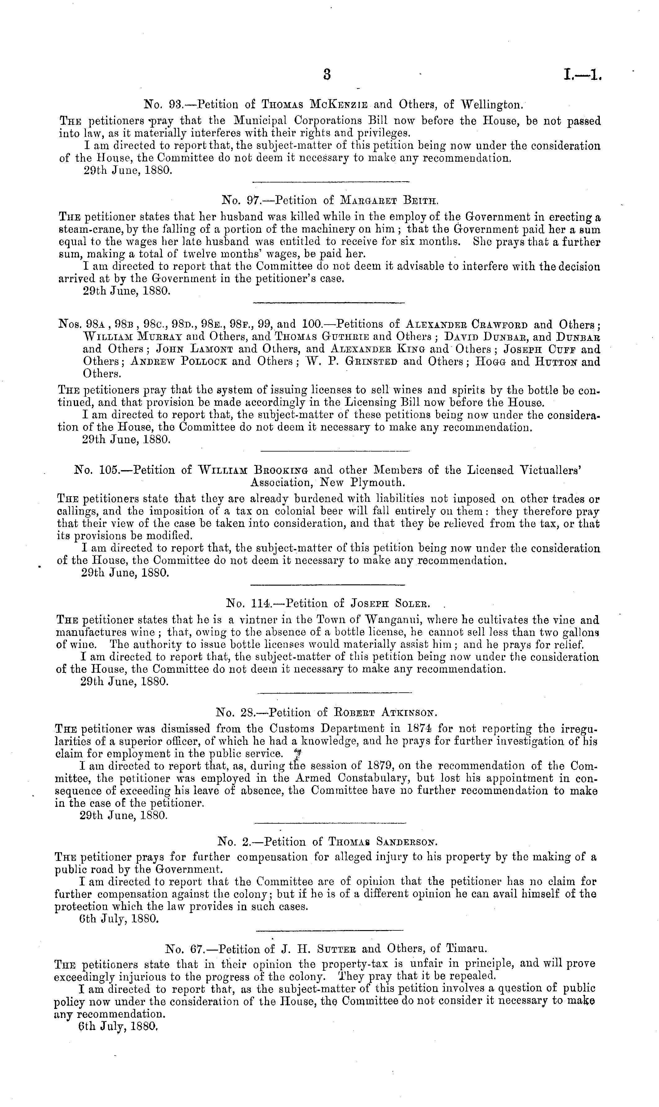 No. 93. —Petition of Thomas McKenzie and Others, of Wellington. The petitioners "pray that the Municipal Corporations Bill now before the House, be not passed into law, as it materially interferes with their rights and privileges. I am directed to report that, the subject-matter of this petition being now under the consideration of the House, the Committee do not deem it necessary to make any recommendation. 29th June, 1880.