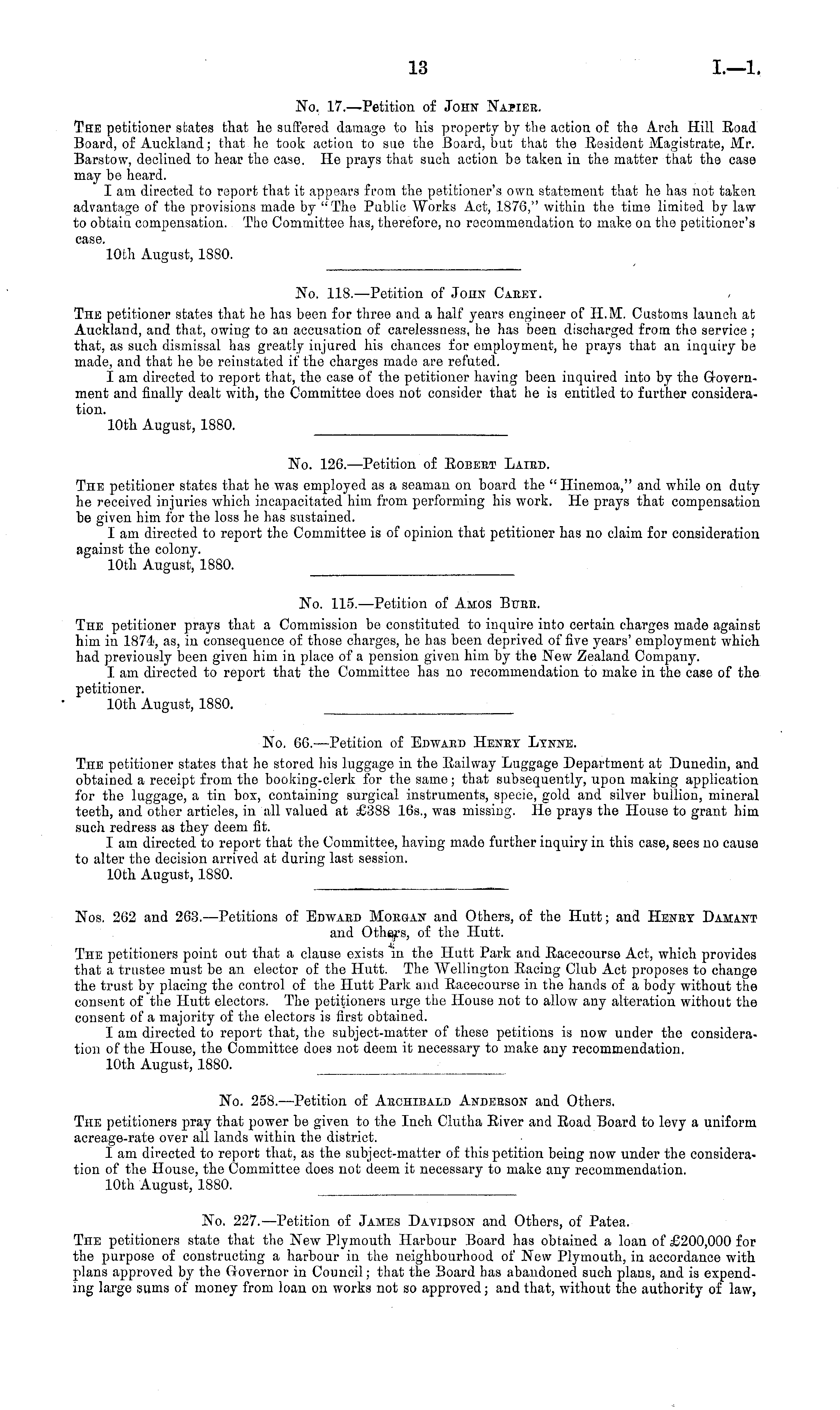 No. 17.—Petition of John Napiee. The petitioner states that he suffered damage to his property by the action of the Arch Hill Road Board, of Auckland; that he took action to sue the Board, but that the Resident Magistrate, Mr. Barstow, declined to hear the case. He prays that such action be taken in the matter that the case may be heard. I am directed to report that it appears from the petitioner's own statsment that he has not taken advantage of the provisions made by "The Public Works Act, 187G," within the time limited by law to obtain compensation. The Committee has, therefore, no recommendation to make on the petitioner's case. 10th August, 1880.