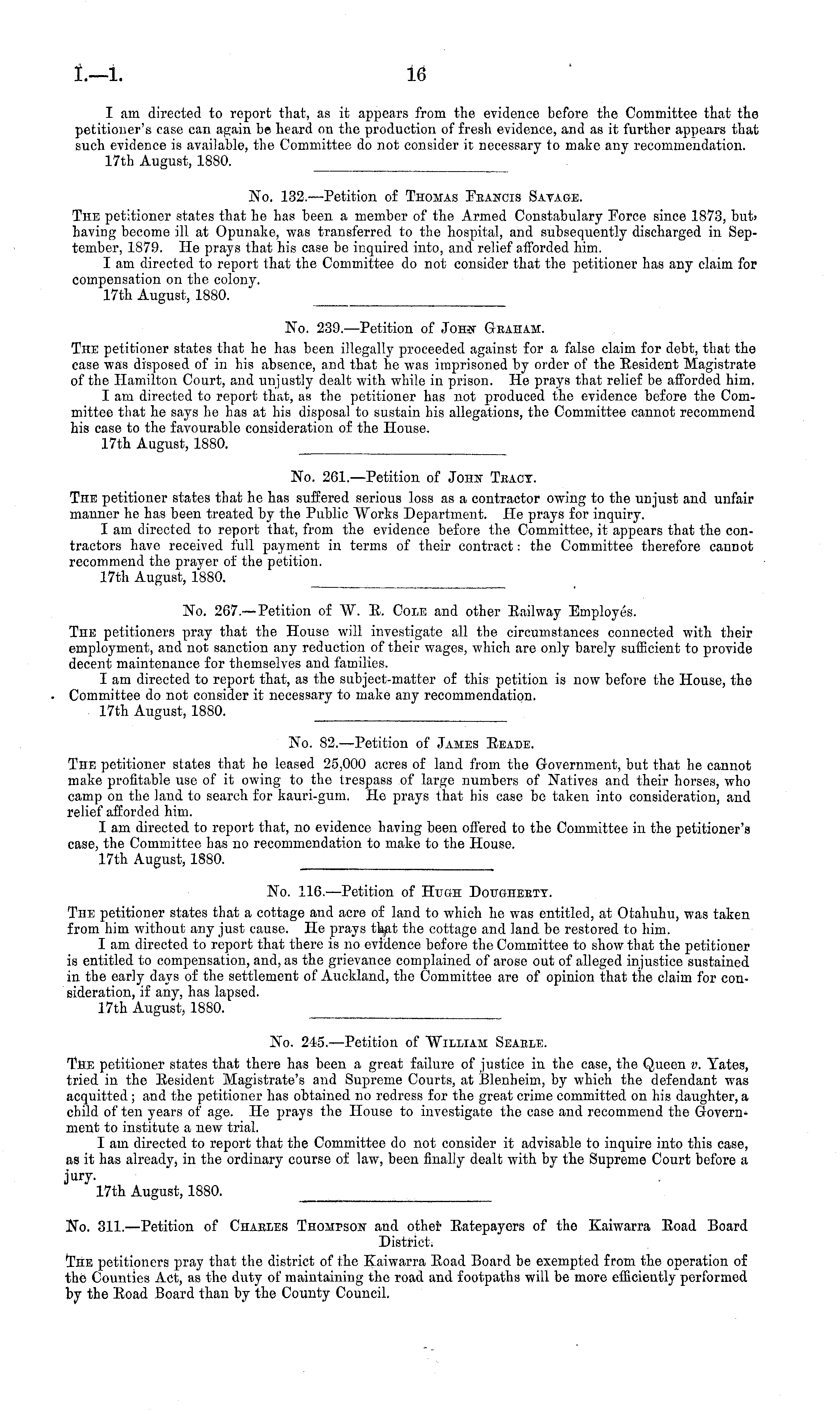 No. 116.—Petition of Hugh Dottghebty. The petitioner states that a cottage and acre of land to which he was entitled, at Otahuhu, was taken from him without any just cause. He prays that the cottage and land be restored to him. I am directed to report that there is no evidence before the Committee to show that the petitioner is entitled to compensation, and, as the grievance complained of arose out of alleged injustice sustained in the early days of the settlement of Auckland, the Committee are of opinion that the claim for consideration, if any, has lapsed. 17th August, 1880.