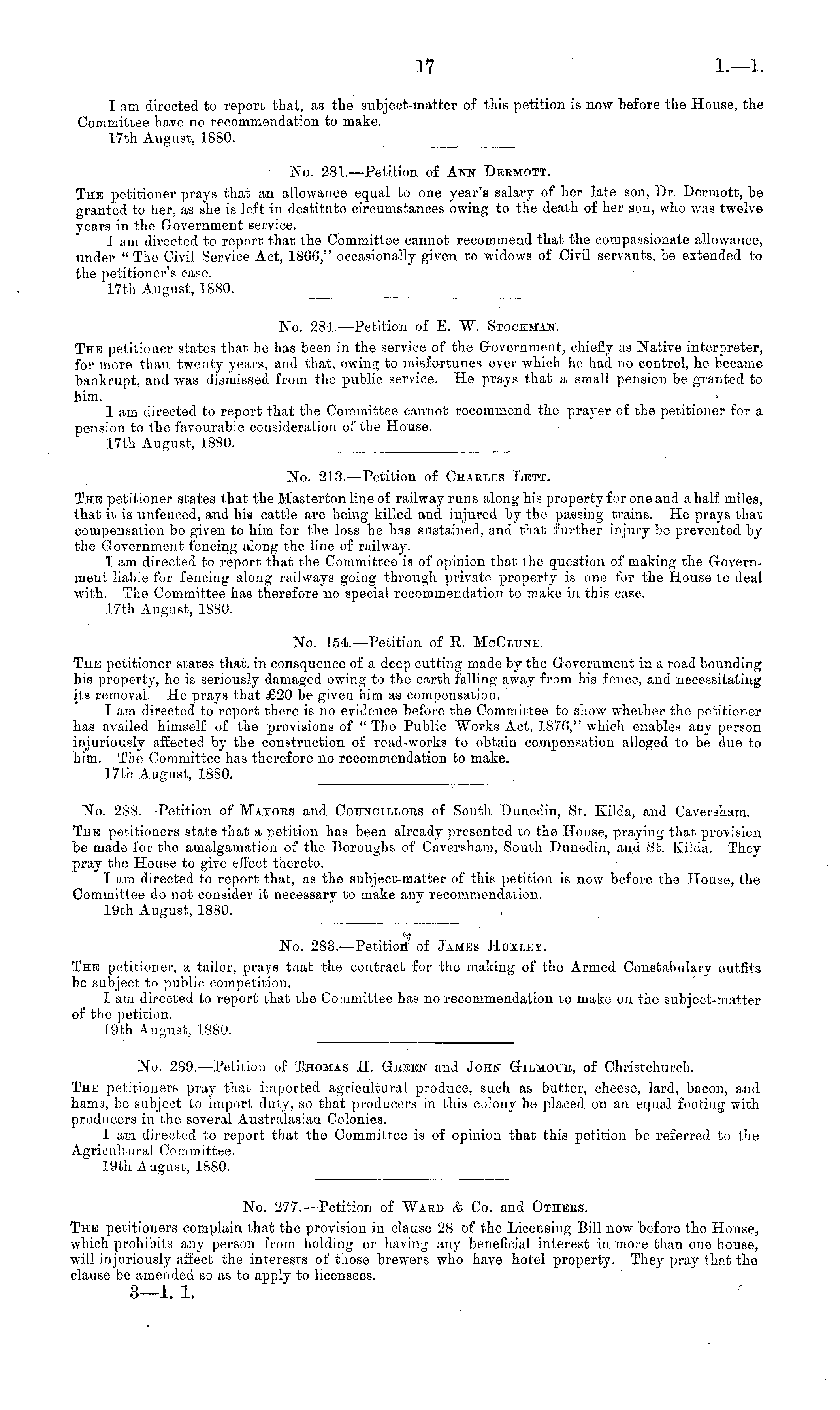 No. 283.—Petition' of James Huxley. The petitioner, a tailor, prays that the contract for the making of the Armed Constabulary outfits be subject to public competition. I am directed to report that the Committee has no recommendation to make on the subject-matter of the petition. 19th August, 1880.