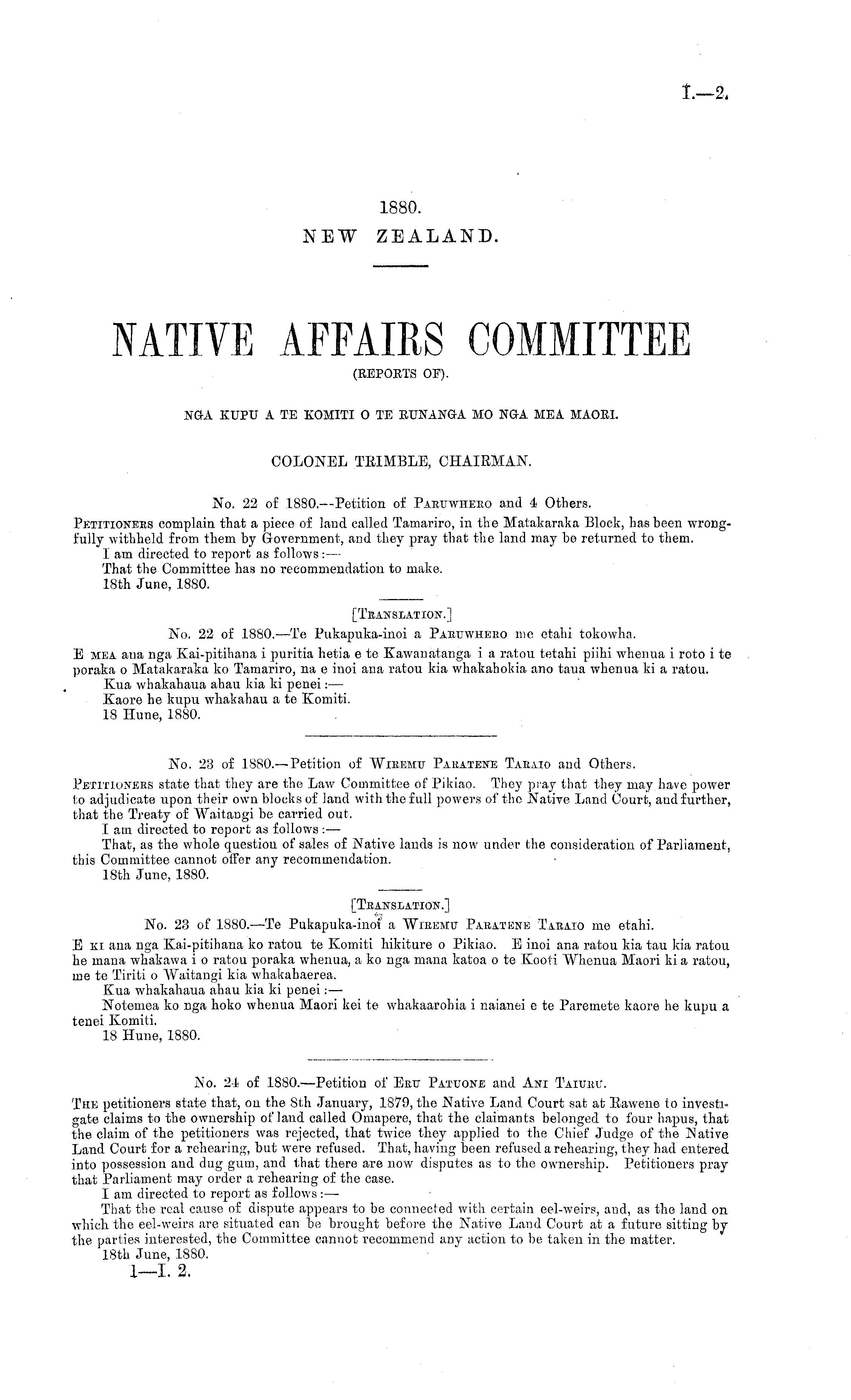 [TRANSLATION.] No. 22 of 1880. —Te Pukapuka-inoi a Pabuwheeo me etahi tokowha. E mea ana nga Kai-pitihana i puritia hetia c te Kawanatanga i a ratou tetahi piihi whenua i roto i te poraka o Matakaraka ko Tamariro, na c inoi ana ratou kia whakahokia ano taua whenua ki a ratou. Kua whakahaua ahau kia ki penei:— Kaore he kupu whakahau a te Komiti. 18 Hune, 1880.