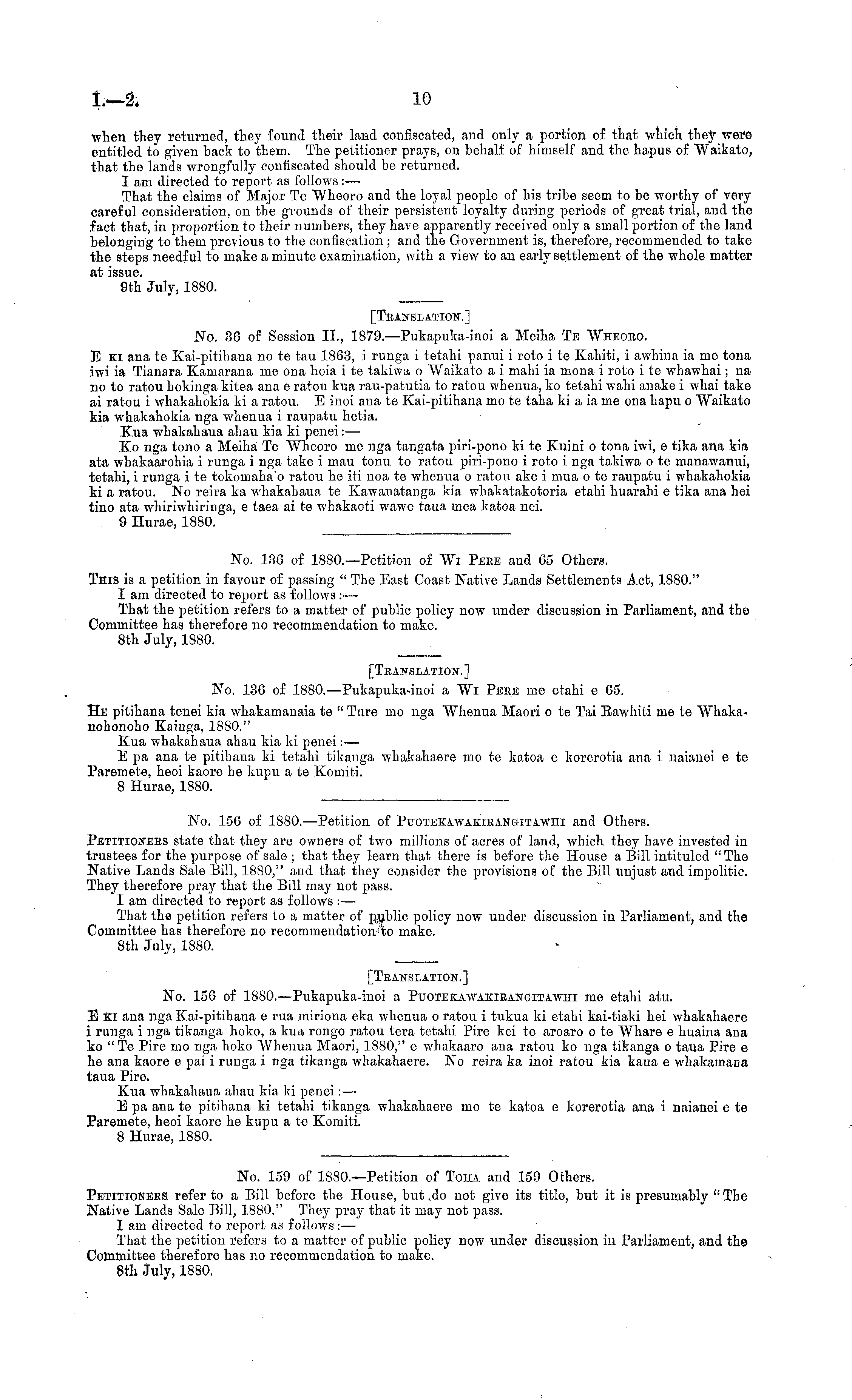 [Teanslation.] No. 36 of Session 11., 1879.—Pukapuka-inoi a Meiha Te Wheoeo. E Ei ana te Kai-pitihana no te tau 1863, i runga i tetahi panui i roto i te Kahiti, i awhina ia me tona iwi ia Tianara Kamarana me ona hoia ite takiwa o Waikato a i mahi ia mona i roto ite whawhai; na no to ratou hokinga kitea ana c ratou kua rau-patutia to ratou whenua, ko tetahi wahi anake i whai take ai ratou i whakahokia ki a ratou. E inoi ana te Kai-pitihana mo te taha ki aia me ona hapu o Waikato kia whakahokia nga whenua i raupatu hetia. Kua whakahaua ahau kia ki penei:— Ko nga tono a Meiha Te Wheoro me nga tangata piri-pono kite Kuini o tona iwi, c tika ana kia ata whakaarohia i runga i nga take i mau tonu to ratou piri-pono i roto i nga takiwa o te manawanui, tetahi, i runga i te tokomaha'o ratou he iti noa te whenua o ratou ake i mua o te raupatu i whakahokia ki a ratou. No reira ka whakahaua te Kawanatanga kia whakatakotoria etahi huarahi c tika ana hei tino ata whiriwhiringa, c taea ai te whakaoti wawe taua mea katoa nei. 9 Hurae, 1880.