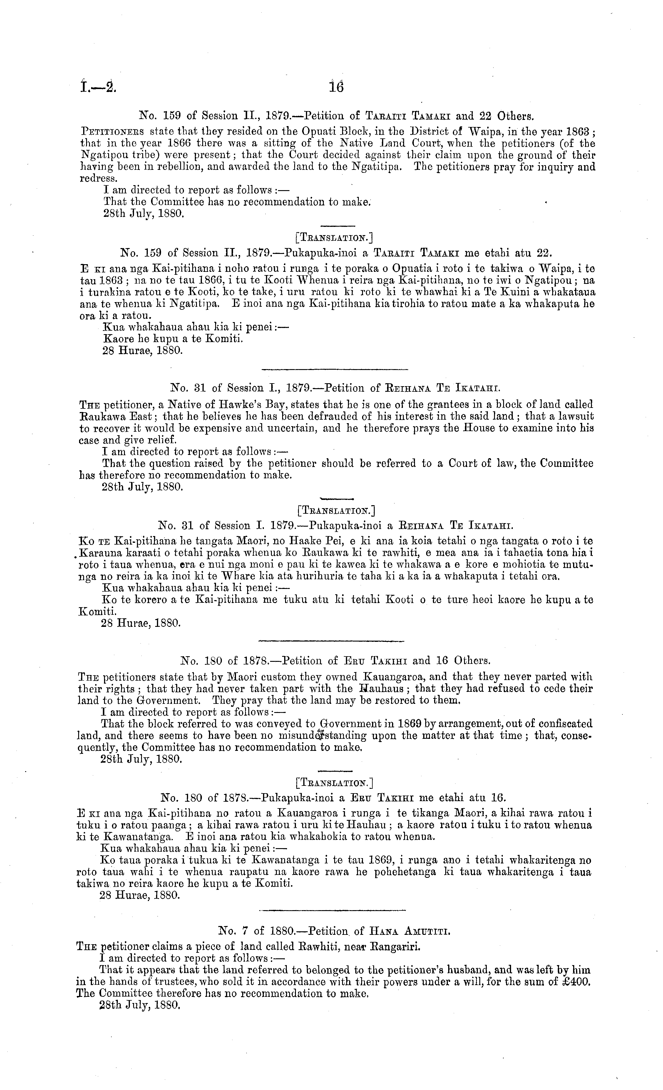 [Translation.] No. 180 of 1878.—Pukapuka-inoi a Ecu Takihi me etahi atu 16. E ki ana nga Kai-pitihana no ratou a Kauangaroa i runga i te tikanga Maori, a kihai rawa ratou i tuku i o ratou paanga ; a kihai rawa ratou i uru kite Hauhau ; a kaore ratou i tuku i to ratou whenua kite Kawanatanga. E inoi ana ratou kia whakahokia to ratou whenua. Kua whakahaua ahau kia ki penei :— Ko taua poraka i tukua kite Kawanatanga i to tau 1869, i runga ano i tetahi whakaritenga no roto taua wahi i te whenua raupatu na kaore rawa he pohehetanga ki taua whakaritenga i taua takiwa no reira kaore he kupu a to Komiti. 28 Hurae, 1880.