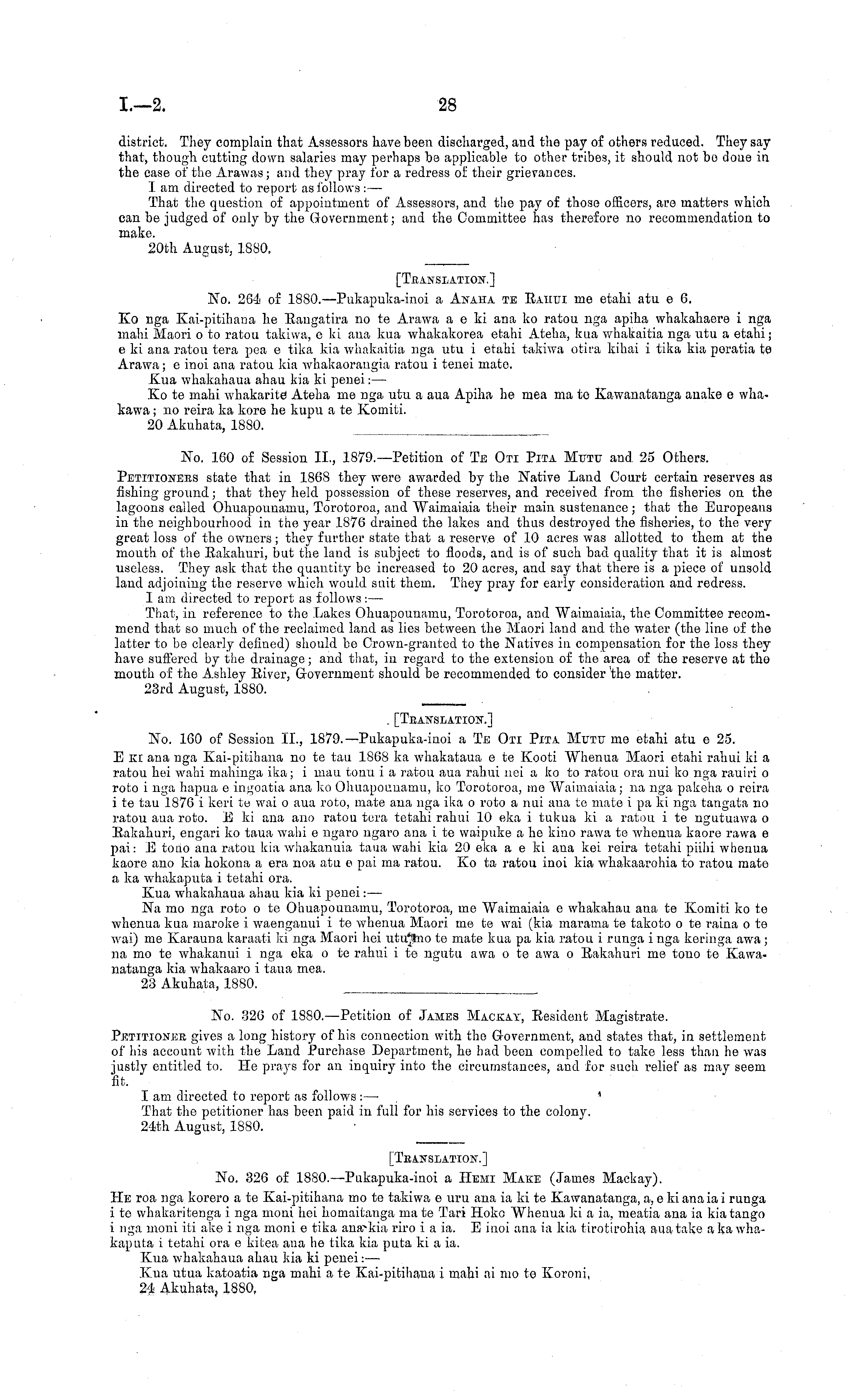 [Tbattslation.] No. 160 of Session 11., 1879.—Pukapuka-inoi a Te Oti Pita Mtjttt me etahi atu c 25. E ki ana nga Kai-pitihana no te tau 1868 ka whakataua c te Kooti Whenua Maori etahi rahui ki a ratou hei wahi mahinga ika; i mau tonu i a ratou aua rahui nei a ko to ratou ora nui ko nga rauiri o roto i nga h'apua c ingoatia ana ko Ohuapouuamu, ko Torotoroa, me Waiinaiaia; na nga pakeha o reira i te tau 1876 i keri te wai o aua roto, mate ana nga ika o roto a nui ana te mate i pa ki nga tangata no ratou aua roto. E ki ana ano ratou tera tetahi rahui 10 eka i tukua ki a ratou i te ngutuawa o Eakahuri, engari ko taua wahi c ngaro ngaro ana i te waipuke a he kino rawa te whenua kaore rawa c pai: E tono ana ratou kia whakanuia taua wahi kia 20 eka a c ki ana kei reira tetahi piihi whenua kaore ano kia hokona a era noa atu c pai ma ratou. Ko ta ratou inoi kia whakaarohia to ratou mate a ka whakaputa i tetahi ora. Kua whakahaua ahau kia ki penei:— Na mo nga roto o te Ohuapounamu, Torotoroa, me Waimaiaia c whakahau ana te Komiti ko te whenua kua maroke i waenganui i te whenua Maori me te wai (kia marama te takoto o te rama o te wai) me Karauna karaati ki nga Maori hei utu'tno te mate kua pa kia ratou i runga i nga keringa awa; na mo te whakanui i nga eka o te rahui i te ngutti awa o te awa o Rakahuri me tono te Kawanatanga kia whakaaro i taua mea. 23 Akuhata, 1880.