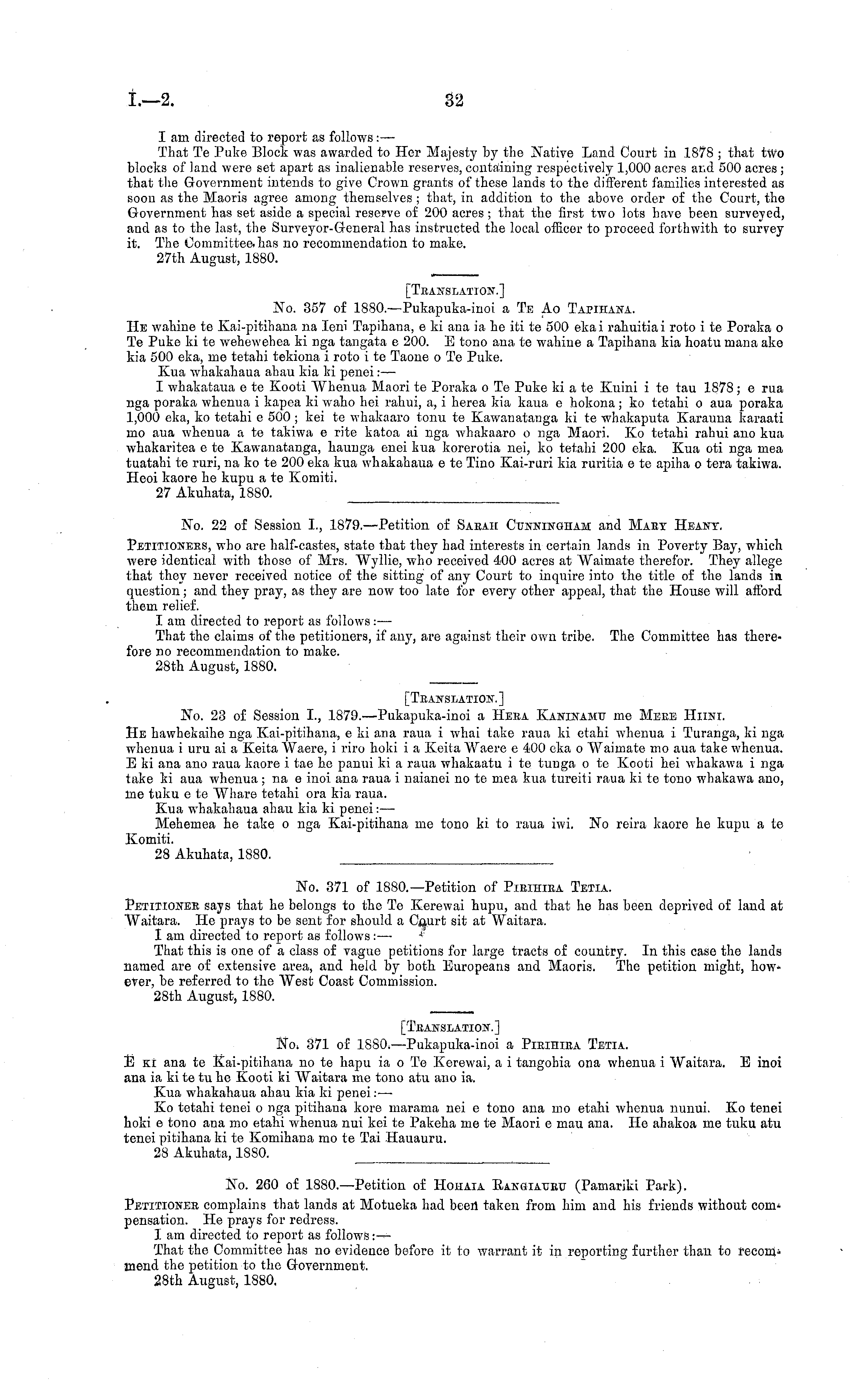 [TRANSLATION.] No. 357 of 1880.—Pukapuka-inoi a Te Ao Tapihana. He wahine te Kai-pitihana na leni Tapihaua, c ki ana ia he iti te 500 ekai rahuitiai roto i te Poraka o Te Puke ki te wehewehea ki nga tangata c 200. E tono ana te wahine a Tapihana kia hoatu inana ake kia 500 eka, me tetahi tekiona i roto i te Taone o Te Puke. Kua whakahaua ahau kia ki penei:—■ I whakataua eto Kooti Whenua Maori te Poraka oTe Puke ki ate Kuini i te tau 1878; c rua nga poraka whenua i kapea ki waho hei rahui, a, i herea kia kaua c hokona; ko tetahi o aua poraka 1,000 eka, ko tetahi c 500 ; kei te whakaaro tonu te Kawanatanga ki te whakaputa Karauna karaati mo aua whenua ate takiwa c rite katoa ai vga whakaaro o nga Maori. Ko tetahi rahui ano kua whakaritea etc Kawanatanga, haunga enei kua korerotia nei, ko tetahi 200 eka. Kua oti nga mea tuatahi te ruri, na ko te 200 eka kua whakahaua c te Tino Kai-ruri kia ruritia c te apiha o tera takiwa. Heoi kaore he kupu a te Komiti. 27 Akuhata, 1880.