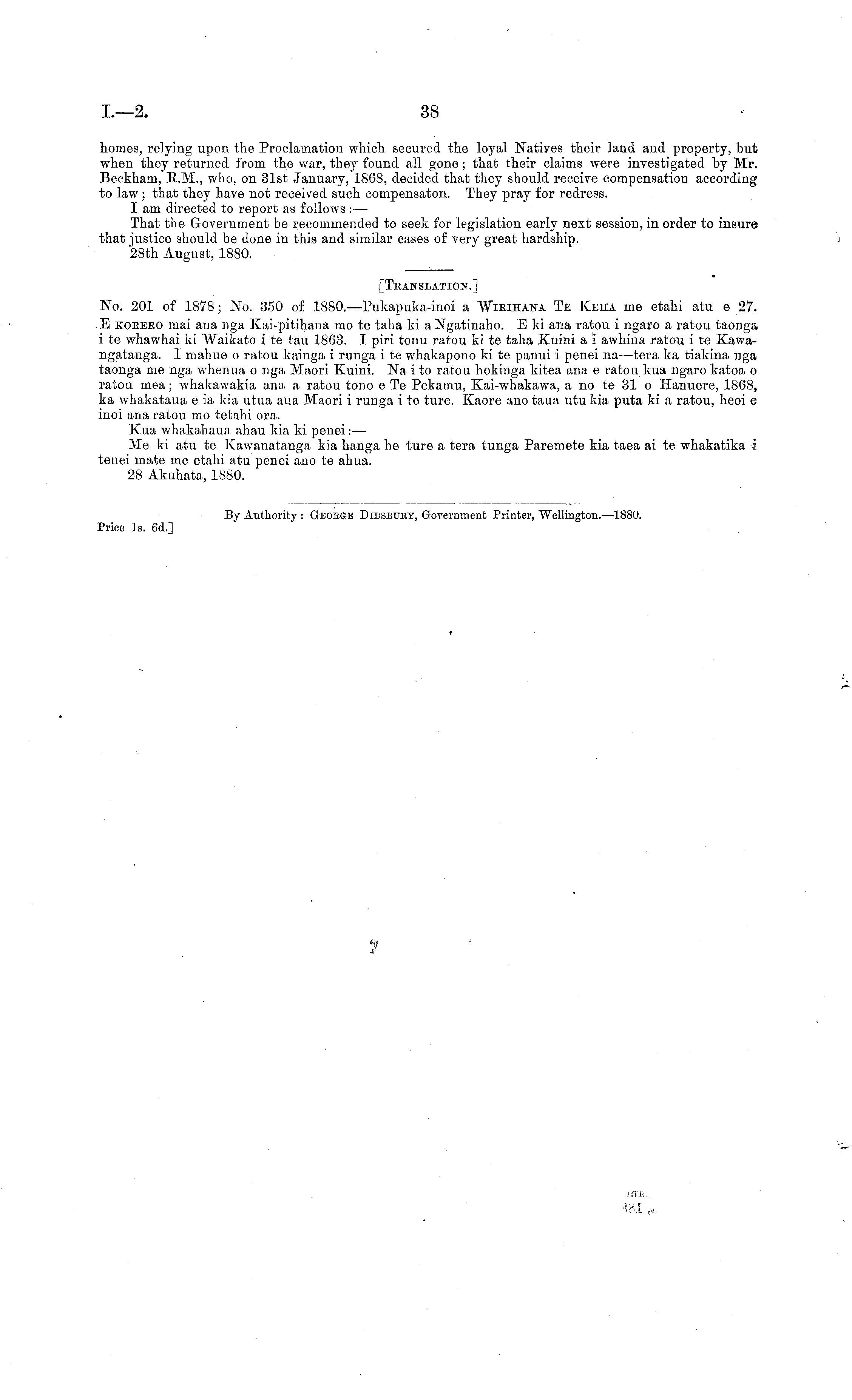 [Translation.] No. 201 of 1878; No. 350 of 1880.—Pukapuka-inoi a Wibiiiana Tje Keha me etahi atu o 27. E koeeeo mai ana nga Kai-pitihana mo te talia ki aNgatinaho. Eki ana ratou i ngaro a ratou taonga ite whawhai ki "Waikato ite tau 1863. I piri tonu ratou kite taha Kuini a i awhina ratou ite Kawangatanga. I mahue o ratou kainga i runga ite whakapono kite panui i penei na —tera ka tiakina nga taonga me nga whenua o nga Maori Kuini. Na ito ratou liokinga kitea ana c ratou kua ngaro katoa o ratou mea; whakawakia ana a ratou tono c Te Pekamu, Kai-whakawa, a no te 31 o Hanuere, 1868, ka whakataua c ia kia utua aua Maori i runga i te ture. Kaore ano taua utu kia puta ki a ratou, heoi c inoi ana ratou mo tetahi ora. Kua whakahaua ahau kia ki penei:— Me ki atu te Kawanatanga kia hanga he ture a tera tunga Paremete kia taea ai te whakatika i tenei mate me etahi atu penei ano te ahua. 28 Akuhata, 1880.