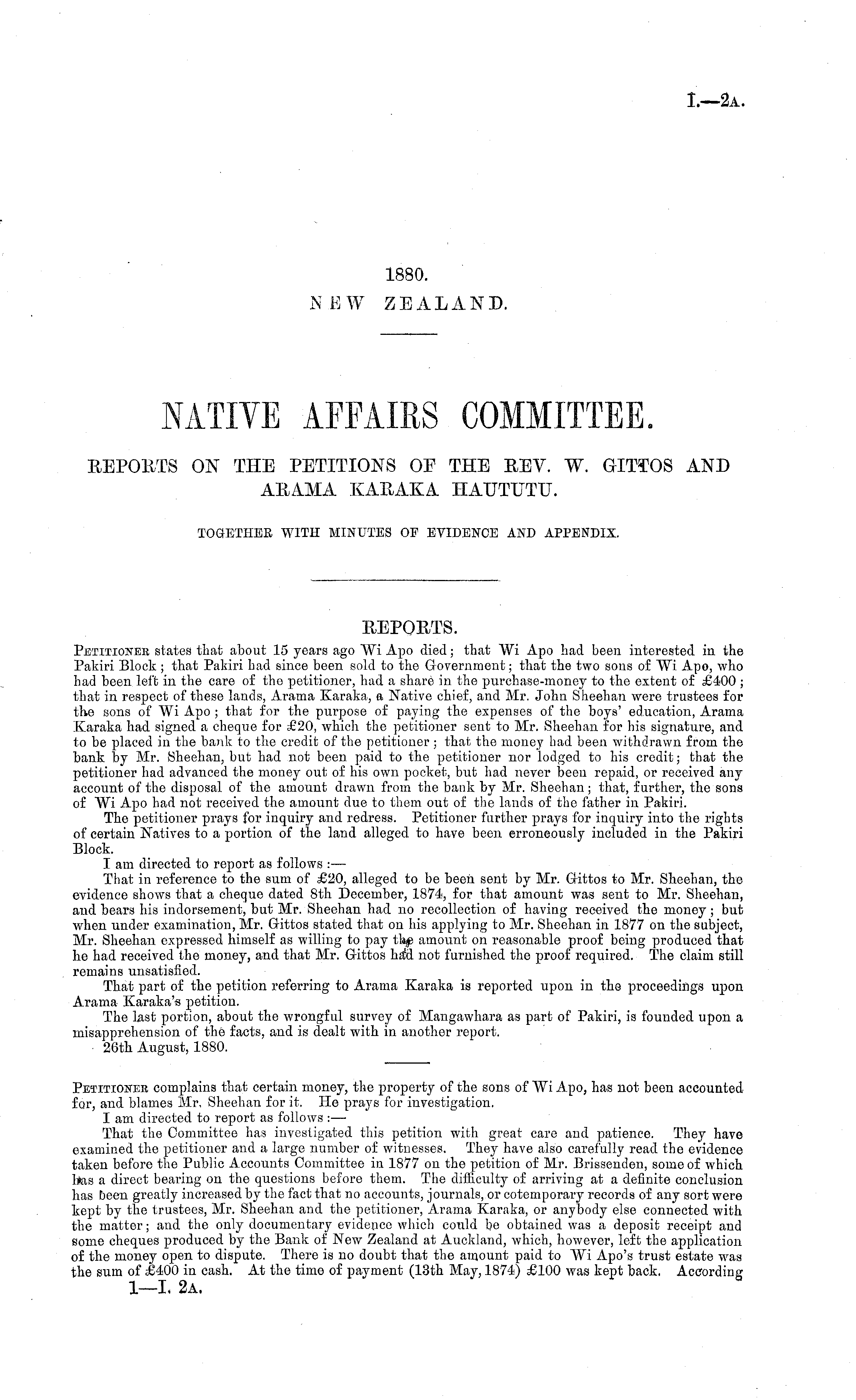 Petitioner complains that certain money, the property of the sons of Wi Apo, has not been accounted for, and blames Mr, Sheehan for it. He prays for investigation. I am directed to report as follows : — That the Committee has investigated this petition with great care and patience. They have examined the petitioner and a large number of witnesses. They have also carefully read the evidence taken before the Public Accounts Committee in 1877 on the petition of Mr. Brissenden, some of which bas a direct bearing on the questions before them. The difficulty of arriving at a definite conclusion has been greatly increased by the fact that no accounts, journals, or cotemporary records of any sort were kept by the trustees, Mr. Sheehan and the petitioner, Arama Karaka, or anybody else connected with the matter; and the only documentary evidence which could bo obtained was a deposit receipt and some cheques produced by the Bank of New Zealand at Auckland, which, however, left the application of the money open to dispute. There is no doubt that the amount paid to Wi Apo's trust estate was the sum of £400 in cash. At the time of payment (13th May, 1874) £100 was kept back. According I—l. 2a.