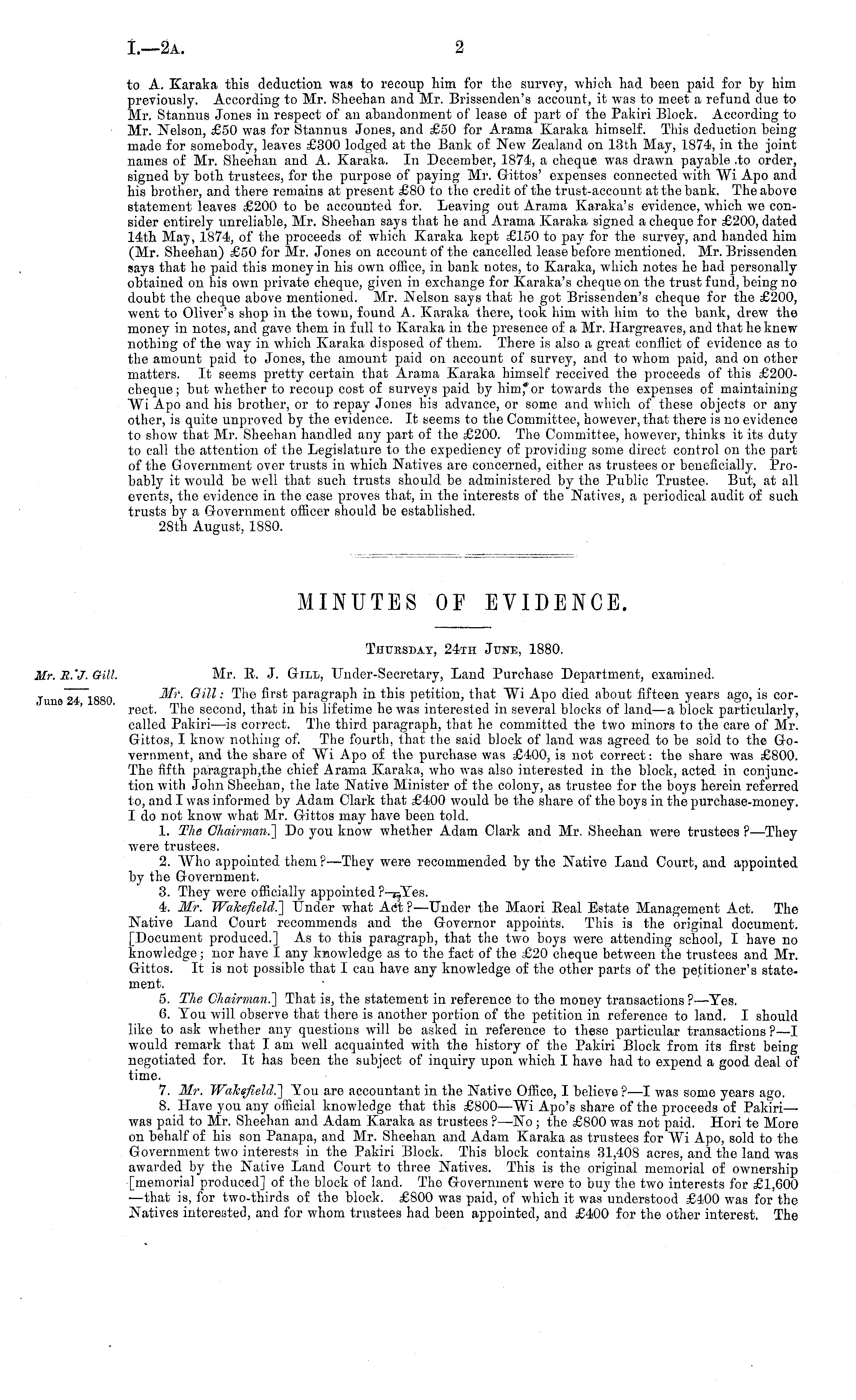 Thttesdat, 24tii June, 1880. Mr. E. J. Gill, Under-Secretary, Land Purchase Department, examined. Mi. Gill: The first paragraph in this petition, that Wi Apo died about fifteen years ago, is correct. The second, that in his lifetime he was interested in several blocks of land —a block particularly, called Pakiri—is correct. The third paragraph, that he committed the two minors to the care of Mr. Gittos, I know nothing of. The fourth, that the said block of land was agreed to be sold to the Government, and the share of Wi Apo of the purchase was £400, is not correct: the share was £800. The fifth paragraph,the chief Arama Karaka, who was also interested in the block, acted in conjunction with John Sheehan, the late Native Minister of the colony, as trustee for the boys herein referred to, and I was informed by Adam Clark that £400 would be the share of the boys in the purchase-money. I do not know what Mr. Gittos may have been told. 1. The Chairman.] Do you know whether Adam Clark and Mr. Sheehan were trustees ? —They were trustees. 2. Who appointed them ?—They were recommended by the Native Land Court, and appointed by the Government. 3. They were officially appointed P-nYes. 4. Mr. Wakefield.~\ Under what Act ?—Under the Maori Real Estate Management Act. The Native Land Court recommends and the Governor appoints. This is the original document. [Document produced.] As to this paragraph, that the two boys were attending school, I have no knowledge; nor have I any knowledge as to the fact of the £20 cheque between the trustees and Mr. Gittos. It is not possible that I can have any knowledge of the other parts of the petitioner's statement. 5. The Chairman.'] That is, the statement in reference to the money transactions ?—Yes. 6. You will observe that there is another portion of the petition in reference to land. I should like to ask whether any questions will be asked in reference to these particular transactions?—l would remark that I am well acquainted with the history of the Pakiri Block from its first being negotiated for. It has been the subject of inquiry upon which I have had to expend a good deal of time. 7. Mr. Walcefield.] You are accountant in the Native Office, I believe ?—I was some years ago. 8. Have you any official knowledge that this £800 —Wi Apo's share of the proceeds of Pakiri— was paid to Mr. Sheehan and Adam Karaka as trustees ? —No ; the £800 was not paid. Hori te More on behalf of his son Panapa, and Mr. Sheehan and Adam Karaka as trustees for Wi Apo, sold to the Government two interests in the Pakiri Block. This block contains 31,408 acres, and the land was awarded by the Native Land Court to three Natives. This is the original memorial of ownership [memorial produced] of the block of land. The Government were to buy the two interests for £1,600 —that is, for two-thirds of the block. £800 was paid, of which, it was understood £400 was for the Natives intereated, and for whom trustees had been appointed, and £400 for the other interest. The