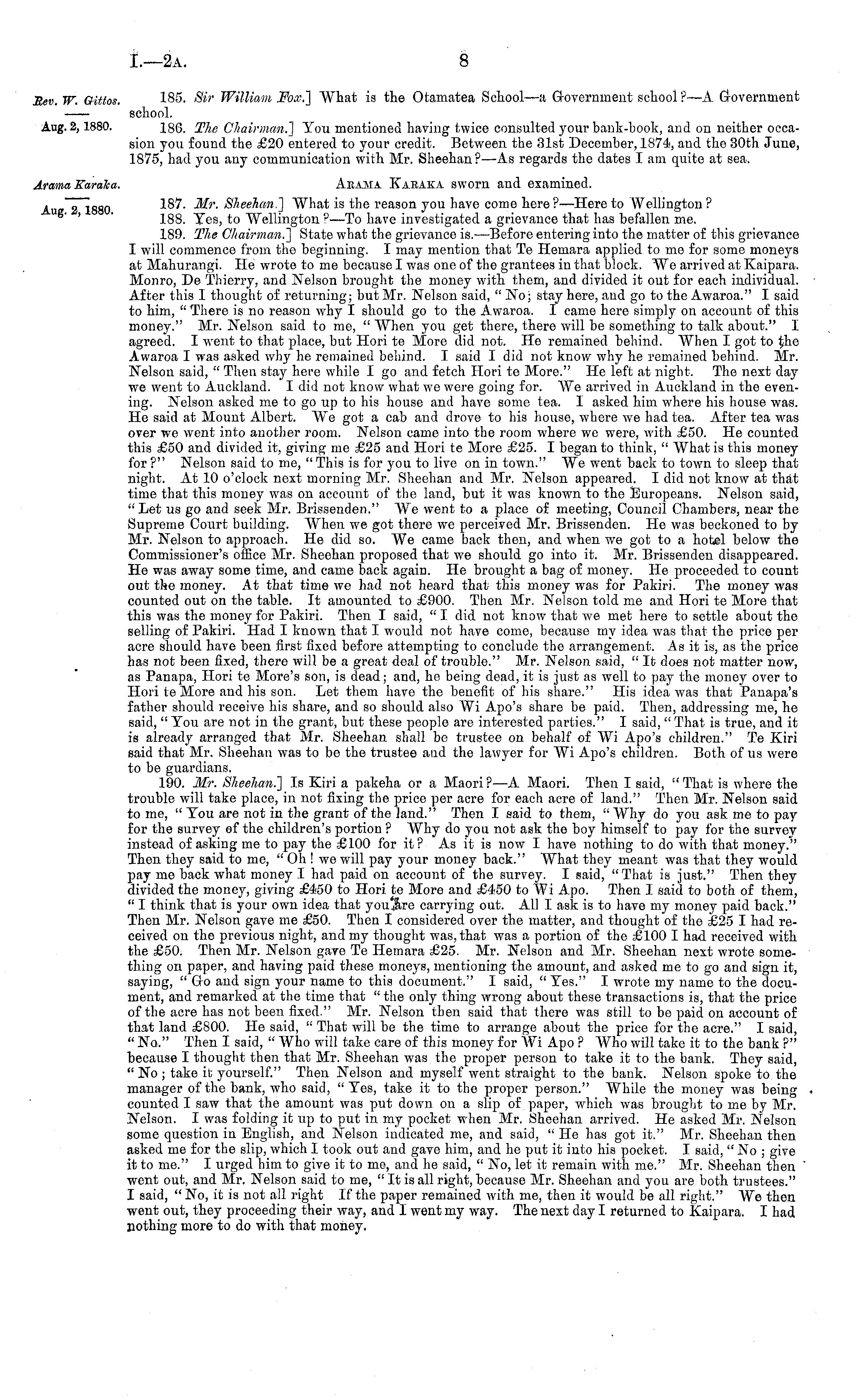 185. Sir William Fox.'] "What is the Otamatea School —a G-overninent school ?—A Government school. 186. The Chairman.'] You mentioned having twice consulted your bank-book, and on neither occasion you found the £20 entered to your credit. Between the 31st December, 1874, and the 30th June, 1875, had you any communication with Mr. Sheehan? —As regards the dates I am quite at sea. Akama Kakaka sworn and examined. 187. Mr. Sheehan.] AVhat is the reason you have come here?— Hereto Wellington? 188. Yes, to "Wellington ?—To have investigated a grievance that has befallen me. 189. The Chairman.] State what the grievance is.—Before entering into the matter of this grievance I will commence from the beginning. I may mention that Te Hemara applied to me for some moneys at Mahurangi. He wrote to me because I was one of the grantees in that block. We arrived at Kaipara. Monro, De Thierry, and Nelson brought the money with them, and divided it out for each individual. After this 1 thought of returning; but Mr. Nelson said, " No; stay here, and go to the Awaroa." I said to him, " There is no reason why I should go to the Awaroa. I came here simply on account of this money." Mr. Nelson said to me, " When you get there, there will be something to talk about." I agreed. I went to that place, but Hori te More did not. He remained behind. When I got to Awaroa I was asked why he remained behind. I said I did not know why he remained behind. Mr. Nelson said, " Then stay here while Igo and fetch Hori te More." He left at night. The next day we went to Auckland. I did not know what we were going for. We arrived in Auckland in the evening. Nelson asked me to go up to his house and have some tea. I asked him where his house was. He said at Mount Albert. We got a cab and drove to his house, where we had tea. After tea was over we went into another room. Nelson came into the room where we were, with £50. He counted this £50 and divided it, giving me £25 and Hori te More £25. I began to think, " What is this money for ?" Nelson said to mo, " This is for you to live on in town." We went back to town to sleep that night. At 10 o'clock next morning Mr. Sheehan and Mr. Nelson appeared. I did not know at that time that this money was on account of the land, but it was known to the Europeans. Nelson said, " Let us go and seek Mr. Brissenden." We went to a place of meeting, Council Chambers, near the Supreme Court building. When we got there we perceived Mr. Brissenden. He was beckoned to by Mr. Nelson to approach. He did so. We came back then, and when we got to a hotel below the Commissioner's office Mr. Sheehan proposed that we should go into it. Mr. Brissenden disappeared. He was away some time, and came back again. He brought a bag of money. He proceeded to count out the money. At that time we had not heard that this money was for Pakiri. The money was counted out on the table. It amounted to £900. Then Mr. Nelson told me and Hori te More that this was the money for Pakiri. Then I said, " I did not know that we met here to settle about the selling of Pakiri. Had I known that I would not have come, because my idea was that the price per acre should have been first fixed before attempting to conclude the arrangement. As it is, as the price has not been fixed, there will be a great deal of trouble." Mr. Nelson said, "It does not matter now, as Panapa, Hori te More's son, is dead; and, he being dead, it is just as well to pay the money over to Hori te More and his son. Let them have the benefit of his share." His idea was that Panapa's father should receive his share, and so should also Wi Apo's share be paid. Then, addressing me, he said, " You are not in the grant, but these people are interested parties." I said, " That is true, and it is already arranged that Mr. Sheehan shall be trustee on behalf of Wi Apo's children." Te Kiri said that Mr. Sheehan was to be the trustee and the lawyer for Wi Apo's children. Both of us were to be guardians. 190. Mr. Sheehan.] Is Kiri a pakeha or a Maori ? —A Maori. Then I said, " That is where the trouble will take place, in not fixing the price per acre for each acre of land." Then Mr. Nelson said to me, " You are not in the grant of the land." Then I said to them, "Why do you ask me to pay for the survey of the children's portion ? Why do you not ask the boy himself to pay for the survey instead of asking me to pay the £100 for it? As it is now I have nothing to do with that money." Then they said to me, "Oh! we will pay your money back." What they meant was that they would pay me back what money I had paid on account of the survey. I said, "That is just." Then they divided the money, giving £450 to Hori te More and £450 to Wi Apo. Then I said to both of them, " I think that is your own idea that you'are carrying out. All I ask is to have my money paid back." Then Mr. Nelson gave me £50. Then I considered over the matter, and thought of the £25 I had received on the previous night, and my thought was, that was a portion of the £100 I had received with the £50. Then Mr. Nelson gave Te Hemara £25. Mr. Nelson and Mr. Sheehan next wrote something on paper, and having paid these moneys, mentioning the amount, and asked me to go and sign it, saying, " Gro and sign your name to this document." I said, "Yes." I wrote my name to the document, and remarked at the time that " the only thing wrong about these transactions is, that the price of the acre has not been fixed." Mr. Nelson then said that there was still to be paid on account of that land £800. He said, " That will be the time to arrange about the price for the acre." I said, " No." Then I said, " Who will take care of this money for Wi Apo ? Who will take it to the bank ?" because I thought then that Mr. Sheehan was the proper person to take it to the bank. They said, "No ; take it yourself." Then Nelson and myself went straight to the bank. Nelson spoke to the manager of the bank, who said, "Yes, take i