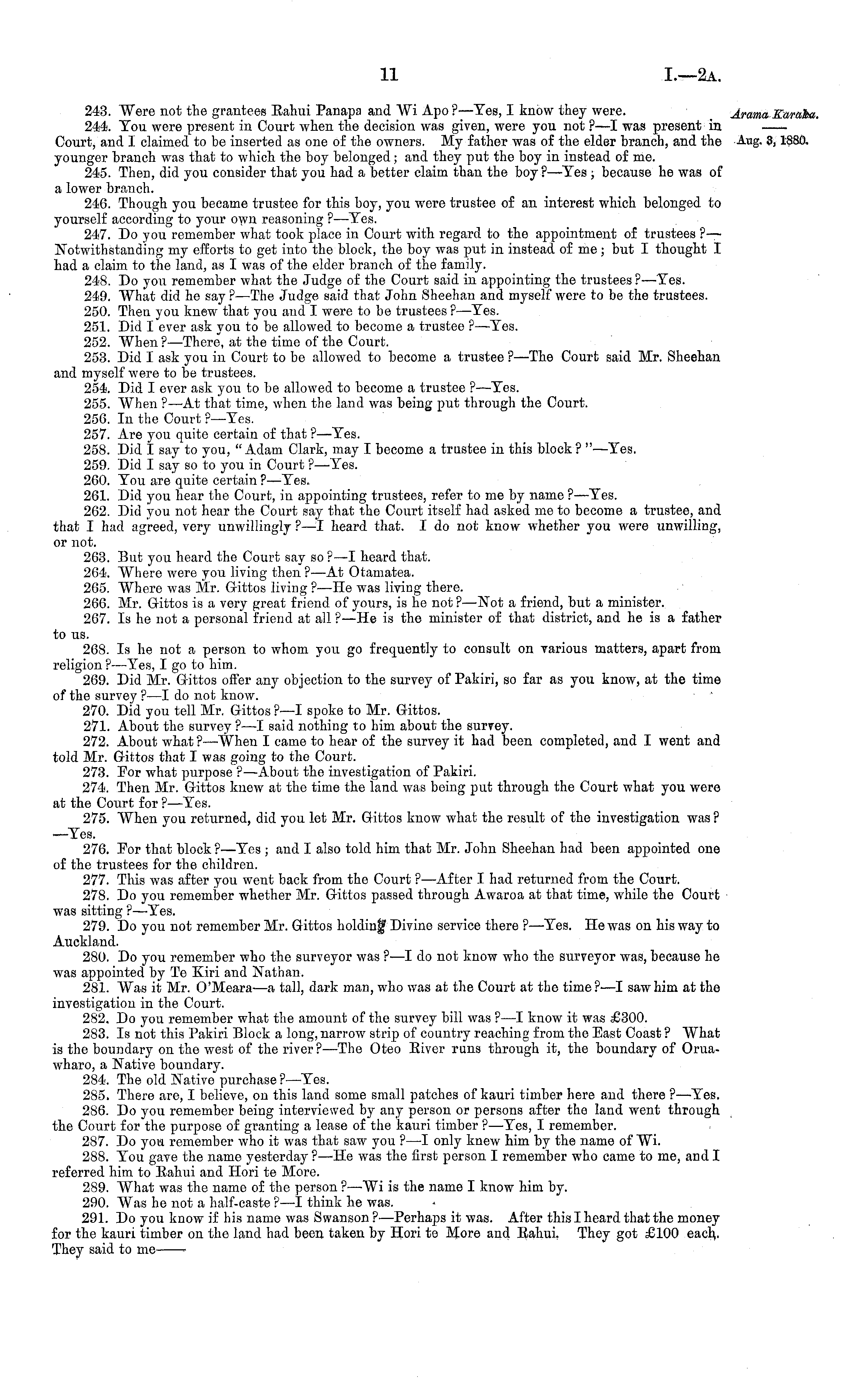 243. Were not the grantees Eahui Panapa and Wi Apo?—Yes, I know they were. 244. You were present in Court when the decision was given, were you not ? —I was present in Court, and I claimed to be inserted as one of the owners. My father was of the elder branch, and the younger branch was that to which the boy belonged; and they put the boy in instead of me. 245. Then, did you consider that you had a better claim than the boy ? —Yes ; because he was of a lower branch. 246. Though you became trustee for this boy, you were trustee of an interest which belonged to yourself according to your own reasoning ? —Yes. 247. Do you remember what took place in Court with regard to the appointment of trustees ?— Notwithstanding my efforts to get into the block, the boy was put in instead of me; but I thought I had a claim to the land, as I was of the elder branch of the family. 248. Do you remember what the Judge of the Court said in appointing the trustees?— Yes. 249. What did he say ?—The Judge said that John Sheehan and myself were to be the trustees. 250. Then you knew that you and I were to be trustees ?—Yes. 251. Did I ever ask you to be allowed to become a trustee ? —Yes. 252. When ?—There", at the time of the Court. 253. Did I ask you in Court to be allowed to become a trustee ? —The Court said Mr. Sheehan and myself were to be trustees. 254. Did I ever ask you to be allowed to become a trustee ? —Yes. 255. When ?—At that time, when the land was being put through the Court. 256. In the Court ?—Yes. 257. Are you quite certain of that ? —Yes. 258. Did I say to you, "Adam Clark, may I become a trustee in this block ? " —Yes. 259. Did I say so to you in Court ?—Yes. 260. You are quite certain ? —Yes. 261. Did you hear the Court, in appointing trustees, refer to me by name ? —Yes. 262. Did you not hear the Court say that the Court itself had asked me to become a trustee, and that I had agreed, very unwillingly ?—I heard that. Ido not know whether you were unwilling, or not. 263. But you heard the Court say so ? —I heard that. 264. Where were you living then ? —At Otamatea. 265. Where was Mr. Gittos living P —He was living there. 266. Mr. Grittos is a very great friend of yours, is he not ?—Not a friend, but a minister. 267. Is he not a personal friend at all ? —He is the minister of that district, and he is a father to us. 268. Is he not a person to whom you go frequently to consult on various matters, apart from religion ? —Yes, I go to him. 269. Did Mr. Grittos offer any objection to the survey of Pakiri, so far as you know, at the time of the survey ? —I do not know. 270. Did you tell Mr. Gittos ?—I spoke to Mr. Gittos. 271. About the survey ?—I said nothing to him about the survey. 272. About what ? —When I came to hear of the survey it had been completed, and I went and told Mr. Gittos that I was going to the Court. 273. For what purpose ? —About the investigation of Pakiri. 274. Then Mr. Gittos knew at the time the land was being put through the Court what you were at the Court for ? —Yes. 275. When you returned, did you let Mr. Gittos know what the result of the investigation was ? —Yes. 276. For that block ?—Yes ; and I also told him that Mr. John Sheehan had been appointed one of the trustees for the children. 277. This was after you went back from the Court ? —After I had returned from the Court. 278. Do you remember whether Mr. Gittos passed through Awaroa at that time, while the Court was sitting ?—Yes. 279. Do you not remember Mr. Gittos holding Divine service there ? —Yes. He was on his way to Auckland. 280. Do you remember who the surveyor was ?—I do not know who the surveyor was, because he was appointed by Te Kiri and Nathan. 281. Was it Mr. O'Meara —a tall, dark man, who was at the Court at the time?—l saw him at the investigation in the Court. 282. Do you remember what the amount of the survey bill was ? —I know it was £300. 283. Is not this Pakiri Block a long, narrow strip of country reaching from the East Coast ? What is the boundary on the west of the river? —The Oteo Eiver runs through it, the boundary of Oruawharo, a Native boundary. 284. The old Native purchase? —Yes. 285. There are, I believe, on this land some small patches of kauri timber here and there ?—Yes. 286. Do you remember being interviewed by any person or persons after the land went through the Court for the purpose of granting a lease of the kauri timber ? —Yes, I remember. 287. Do you remember who it was that saw you ? —I only knew him by the name of Wi. 288. You gave the name yesterday ? —He was the first person I remember who came to me, and I referred him to Bahui and Hori te More. 289. What was the name of the person ? —Wi is the name I know him by. 290. Was he not a half-caste ? —I think he was. 291. Do you know if his name was Swanson? —Perhaps it was. After this I heard that the money for the kauri timber on the land had been taken by Hori te More and Eahui. They got £100 each,. They said to me