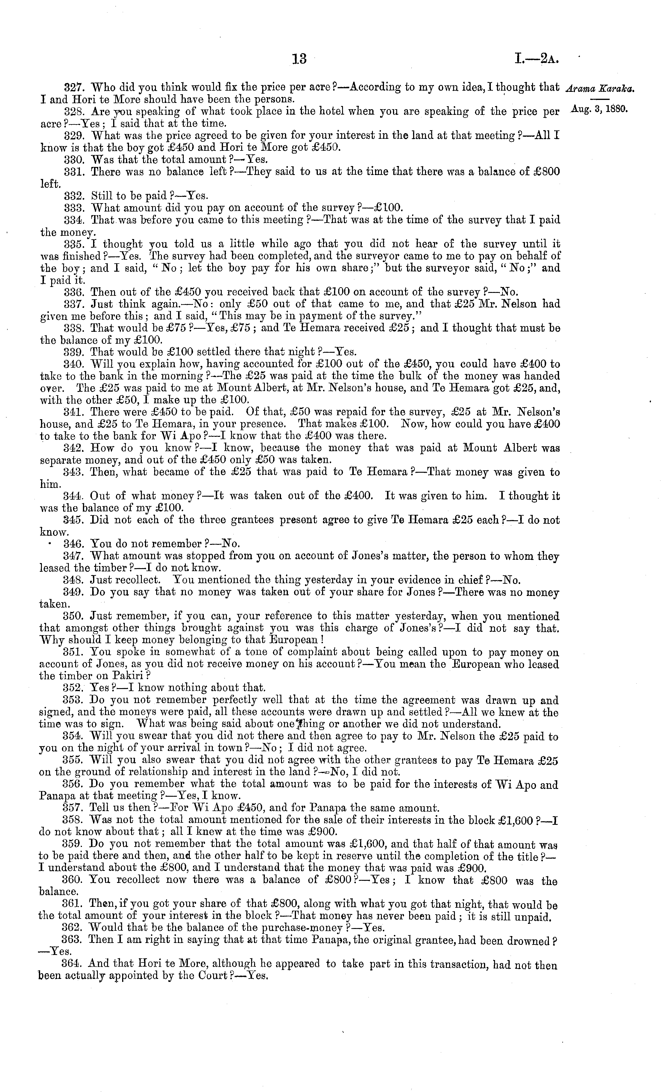327. Who did you think would fix the price per acre ?—According to my own idea, I thought that I and Hori te More should have been the persons. 328. Are you speaking of what took place in the hotel when you are speaking of the price per acre?—-Yes ; 1 said that at the time. 329. What was the price agreed to be given for your interest in the land at that meeting ?—All I know is that the boy got £450 and Hori te More got £450. 330. Was that the total amount ? —Yes. 331. There was no balance left ? —They said to us at the time that there was a balance of £800 left. 332. Still to be paid ?—Yes. 333. What amount did you pay on account of the survey?—£loo. 334. That was before you came to this meeting ? —That was at the time of the survey that I paid the money. 835. I thought you told us a little while ago that you did not hear of the survey until it was finished ?—Yes. The survey had been completed, and the surveyor came to me to pay on behalf of the boy; and I said, " No; let the boy pay for his own share;" but the surveyor said, " No;" and I paid it. 336. Then out of the £450 you received back that £100 on account of the survey ? —No. 337. Just think again.—No: only £50 out of that came to me, and that £25 Mr. Nelson had given me before this ; and I said, "This may be in payment of the survey." 338. That would be £75 ? —Yes, £75 ; and Te Hemara received £25; and I thought that must be the balance of my £100. 339. That would be £100 settled there that night ?—Yes. 340. Will you explain how, having accounted for £100 out of the £450, you could have £400 to take to the bank in the morning ? —The £25 was paid at the time the bulk of the money was handed over. The £25 was paid to me at Mount Albert, at Mr. Nelson's house, and Te Hemara got £25, and, with the other £50, I make up the £100. 341. There were £450 to be paid. Of that, £50 was repaid for the survey, £25 at Mr. Nelson's house, and £25 to To Hemara, in your presence. That makes £100. Now, how could you have £400 to take to the bank for Wi Apo ? —I know that the £400 was there. 342. How do you know ? —I know, because the money that was paid at Mount Albert was separate money, and out of the £450 only £50 was taken. 343. Then, what became of the £25 that was paid to Te Hemara ?—That money was given to him. 344. Out of what money ? —lt was taken out of the £400. It was given to him. I thought it was the balance of my £100. 345. Did not each of the three grantees present agree to give Te Hemara £25 each ?—I do not know. ■ 346. You do not remember ? —No. 347. What amount was stopped from you on account of Jones's matter, the person to whom they leased the timber ?—I do not know. 348. Just recollect. You mentioned the thing yesterday in your evidence in chief ?—-No. 349. Do you say that no money was taken out of your share for Jones ?—There was no money taken. 350. Just remember, if you can, your reference to this matter yesterday, when you mentioned that amongst other things brought against you was this charge of Jones's ?—I did not say that. Why should I keep money belonging to that European ! 351. You spoke in somewhat of a tone of complaint about being called upon to pay money on account of Jones, as you did not receive money on his account ?—You mean the European who leased the timber on Pakiri ? 352. Yes ?—I know nothing about that. 353. Do you not remember perfectly well that at the time the agreement was drawn up and signed, and the moneys were paid, all these accounts were drawn up and settled ? —All we knew at the time was to sign. What was being said about one'lhing or another we did not understand. 354. Will you swear that you did not there and then agree to pay to Mr. Nelson the £25 paid to you on the night of your arrival in town ?—No ; I did not agree. 355. Will you also swear that you did not agree vrith the other grantees to pay Te Hemara £25 on the ground of relationship and interest in the land ?—=No, I did not. 356. Do you remember what the total amount was to be paid for the interests of Wi Apo and Panapa at that meeting ? —Yes, I know. 357. Tell us then ?—]?or Wi Apo £450, and for Panapa the same amount. 358. Was not the total amount mentioned for the sale of their interests in the block £1,600 ?—I do not know about that; all I knew at the time was £900. 359. Do you not remember that the total amount was £1,600, and that half of that amount was to be paid there and then, and the other half to be kept in reserve until the completion of the title ? —■ I understand about the £800, and I understand that the money that was paid was £900. 360. You recollect now there was a balance of £800 ? —Yes; I know that £800 was the balance. 361. Then, if you got your share of that £800, along with what you got that night, that would be the total amount of your interest in the block ?■ —-That money has never been paid ; it is still unpaid. 362. Would that be the balance of the purchase-money ?—Yes. 363. Then I am right in saying that at that time Panapa, the original grantee, had been drowned ? —Yes. 364. And that Hori te More, although he appeared to take part in this transaction, had not then been actually appointed by the Court?— Yes,