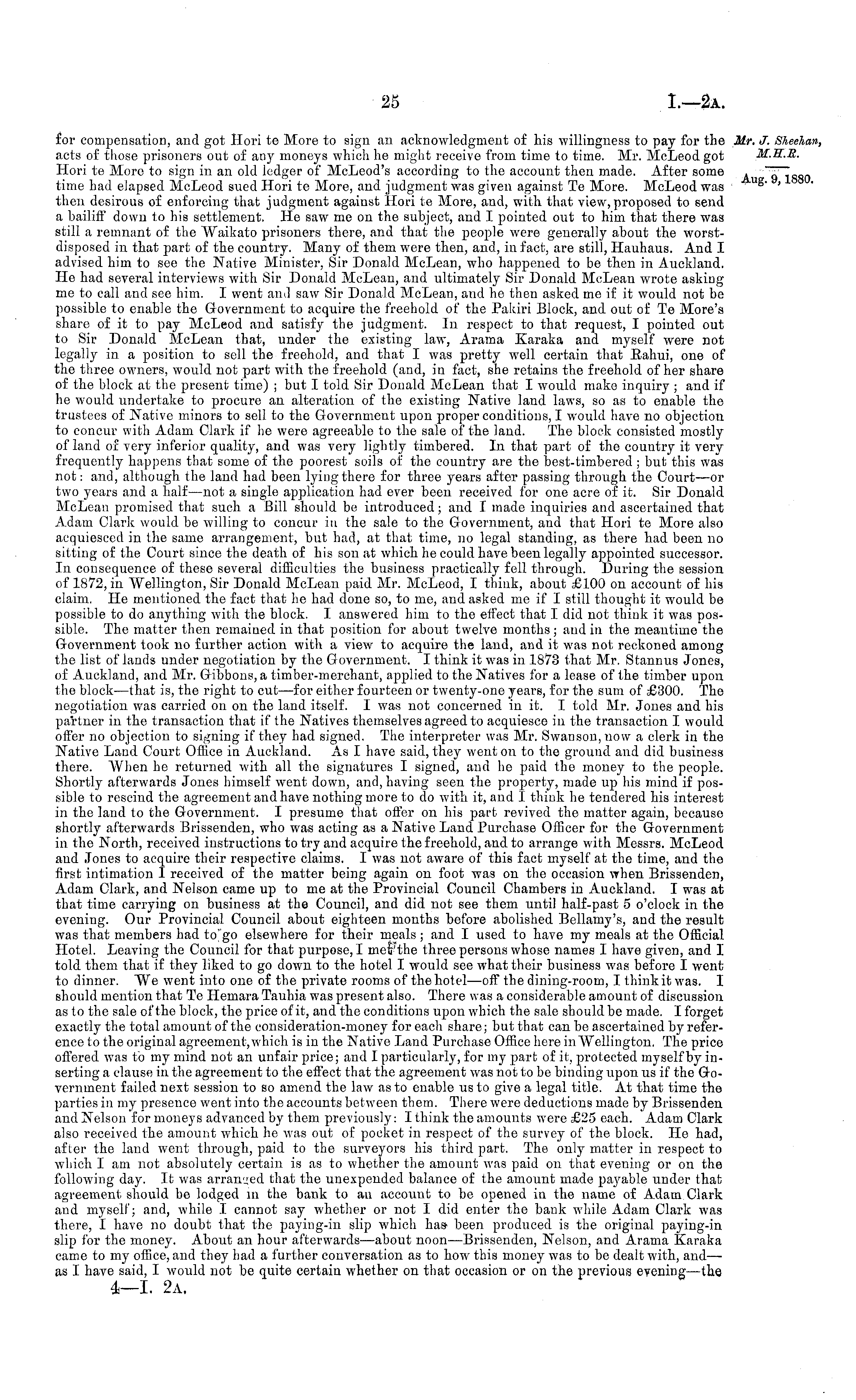 for compensation, and got Hori te More to sign an acknowledgment of his willingness to pay for the acts of those prisoners out of any moneys which he might receive from time to time. Mr. McLeod got Hori te More to sign in an old ledger of McLeod's according to the account then made. After some time had elapsed McLeod sued Hori te More, and judgment was given against Te More. McLeod was then desirous of enforcing that judgment against Hori te More, and, with that view, proposed to send a bailiff down to his settlement. He saw me on the subject, and I pointed out to him that there was still a remnant of the Waikato prisoners there, and that the people were generally about the worstdisposed in that part of the country. Many of them were then, and, in fact, are still, Hauhaus. And I advised him to see the Native Minister, Sir Donald McLean, who happened to be then in Auckland. He had several interviews with Sir Donald McLean, and ultimately Sir Donald McLean wrote asking me to call and see him. I went and saw Sir Donald McLean, and he then asked me if it would not be possible to enable the Government to acquire the freehold of the Pakiri Block, and out of Te More's share of it to pay McLeod and satisfy the judgment. In respect to that request, I pointed out to Sir Donald McLean that, under the existing law, Arama Karaka and myself were not legally in a position to sell the freehold, and that I was pretty well certain that Rahui, one of the three owners, would not part with the freehold (and, in fact, she retains the freehold of her share of the block at the present time) ; but I told Sir Donald McLean that I would make inquiry ; and if he would undertake to procure an alteration of the existing Native land laws, so as to enable the trustees of Native minors to sell to the Government upon proper conditions, I would have no objection to concur with Adam Clark if he were agreeable to the sale of the land. The block consisted mostly of land of very inferior quality, and was very lightly timbered. In that part of the country it very frequently happens that some of the poorest soils of the country are the best-timbered ; but this was not: and, although the land had been lying there for three years after passing through the Court —or two years and a half —not a single application had ever been received for one acre of it. Sir Donald McLean promised that such a Bill should be introduced; and I made inquiries and ascertained that Adam Clark would be willing to concur in the sale to the Government, and that Hori te More also acquiesced in the same arrangement, but had, at that time, no legal standing, as there had been no sitting of the Court since the death of his son at which he could have been legally appointed successor. In consequence of these several difficulties the business practically fell through. During the session of 1872, in Wellington, Sir Donald McLean paid Mr. McLeod, I think, about £100 on account of his claim. He mentioned the fact that he had done so, to me, and asked me if I still thought it would be possible to do anything with the block. I answered him to the eifect that I did not think it was possible. The matter then remained in that position for about twelve months; and in the meantime the Government took no further action with a view to acquire the land, and it was not reckoned among the list of lands under negotiation by the Government. I think it was in 1873 that Mr. Stannus Jones, of Auckland, and Mr. Gibbons, a timber-merchant, applied to the Natives for a lease of the timber upon the block —that is, the right to cvt —for either fourteen or twenty-one years, for the sum of £300. The negotiation was carried on on the land itself. I was not concerned in it. I told Mr. Jones and his partner in the transaction that if the Natives themselves agreed to acquiesce in the transaction I would offer no objection to signing if they had signed. The interpreter was Mr. Swanson, now a clerk in the Native Land Court Office in Auckland. As I have said, they went on to the ground and did business there. "When he returned with all the signatures I signed, and he paid the money to the people. Shortly afterwards Jones himself went down, and, having seen the property, made up his mind if possible to rescind the agreement and have nothing more to do with it, and I think he tendered his interest in the land to the Government. I presume that offer on his part revived the matter again, because shortly afterwards Brissenden, who was acting as a Native Land Purchase Officer for the Government in the North, received instructions to try and acquire the freehold, and to arrange with Messrs. McLeod and Jones to acquire their respective claims. I was not aware of this fact myself at the time, and the first intimation I received of the matter being again on foot was on the occasion when Brissenden, Adam Clark, and Nelson came up to me at the Provincial Council Chambers in Auckland. I was at that time carrying on business at the Council, and did not see them until half-past 5 o'clock in the evening. Our Provincial Council about eighteen months before abolished Bellamy's, and the result was that members had togo elsewhere for their meals ; and I used to have my meals at the Official Hotel. Leaving the Council for that purpose, I met the three persons whose names I have given, and I told them that if they liked to go down to the hotel I would see what their business was before I went to dinner. We went into one of the private rooms of the hotel —off the dining-room, I think it was. I should mention that Te Hemara Tauhia was present also. There was a considerable amount of discussion as to the sale of the block, the price of it, and the conditions upon which the sale should be made. I forget exactly the total amount of the consideration-money for each share; but that can be ascertained by reference to the original agreement, which is in the Native Land Purchase Office here in Wellington. The price