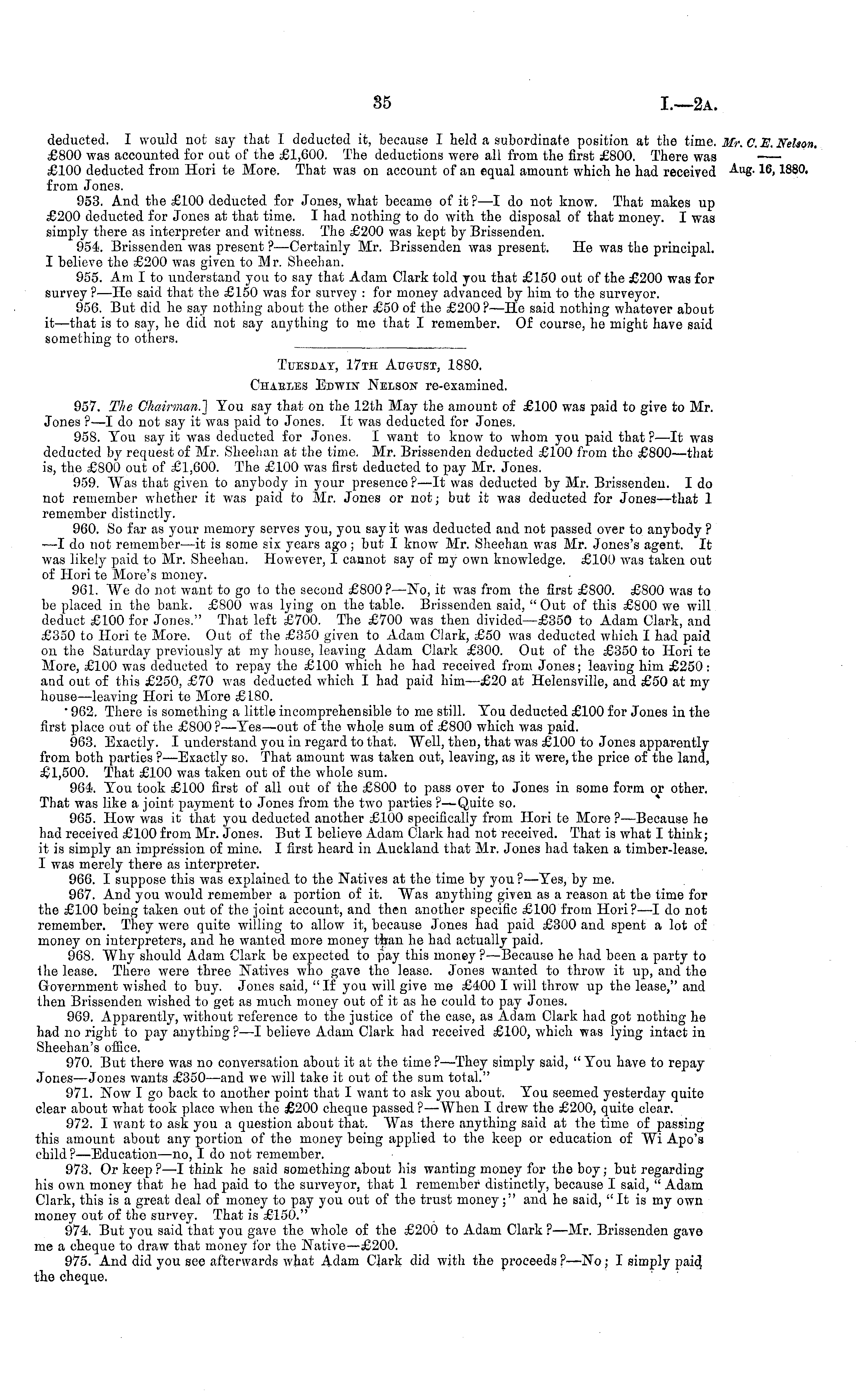 Tuesday, 17th August, 1880. Chaeies Edwin Nelson re-examined. 957. The Chairman.'] You say that on the 12th May the amount of £100 was paid to give to Mr. Jones ?—I do not say it was paid to Jones. It was deducted for Jones. 958. Tou say it was deducted for Jones. I want to know to whom you paid that ? —lt was deducted by request of Mr. Sheehan at the time. Mr. Brissenden deducted £100 from the £800 —that is, the £800 out of £1,600. The £100 was first deducted to pay Mr. Jones. 959. Was that given to anybody in your presence P—lt was deducted by Mr. Brissendeu. Ido not remember whether it was paid to Mr. Jones or not; but it was deducted for Jones —that 1 remember distinctly. 960. So far as your memory serves you, you say it was deducted and not passed over to anybody ? —I do not remember —it is some six years ago ; but I know Mr. Sheehan was Mr. Jones's agent. It was likely paid to Mr. Sheehan. However, I cannot say of my own knowledge. £100 was taken out of Hori te More's money. 961. We do not want to go to the second £800?— No, it was from the first £800. £800 was to be placed in the bank. £800 was lying on the table. Brissenden said, " Out of this £800 we will deduct £100 for Jones." That left £700. The £700 was then divided—£3so to Adam Clark, and £350 to Hori te More. Out of the £350 given to Adam Clark, £50 was deducted which I had paid on the Saturday previously at my house, leaving Adam Clark £300. Out of the £350 to Hori te More, £100 was deducted to repay the £100 which he had received from Jones; leaving him £250: and out of this £250, £70 was deducted which I had paid him —£20 at Helensville, and £50 at my house —leaving Hori te More £ 180. " 962. There is something a little incomprehensible to me still. Tou deducted £100 for Jones in the first place out of the £800?— Yes—out of the whole sum of £800 which was paid. 963. Exactly. I understand you in regard to that. Well, then, that was £100 to Jones apparently from both parties ?—Exactly so. That amount was taken out, leaving, as it were, the price of the land, £1,500. That £100 was taken out of the whole sum. 964. You took £100 first of all out of the £800 to pass over to Jones in some form or other. That was like a joint payment to Jones from the two parties ?—Quite so. 965. How was it that you deducted another £100 specifically from Hori te More ? —Because he had received £100 from Mr. Jones. But I believe Adam Clark had not received. That is what I think; it is simply an impression of mine. I first heard in Auckland that Mr. Jones had taken a timber-lease. I was merely there as interpreter. 966. I suppose this was explained to the Natives at the time by you ?—Yes, by me. 967. And you would remember a portion of it. Was anything given as a reason at the time for the £100 being taken out of the joint account, and then another specific £100 from Hori?-—I do not remember. They were quite willing to allow it, because Jones had paid £300 and spent a lot of money on interpreters, and he wanted more money than he had actually paid. 968. Why should Adam Clark be expected to pay this money ? —Because he had been a party to ihe lease. There were three Natives who gave the lease. Jones wanted to throw it up, and the Government wished to buy. Jones said, "If you will give me £400 I will throw up the lease," and then Brissenden wished to get as much money out of it as he could to pay Jones. 969. Apparently, without reference to the justice of the case, as Adam Clark had got nothing he had no right to pay anything? —I believe Adam Clark had received £100, which was lying intact in Sheehan's office. 970. But there was no conversation about it at the time ?—They simply said, " You have to repay Jones —Jones wants £350 —and we will take it out of the sum total." 971. Now Igo back to another point that I want to ask you about. You seemed yesterday quite clear about what took place when the £200 cheque passed ? —When I drew the £200, quite clear. 972. I want to ask you a question about that. Was there anything said at the time of passing this amount about any portion of the money being applied to the keep or education of Wi Apo's child ?—Education —no, I do not remember. 973. Or keep ?—I think he said something about his wanting money for the boy; but regarding his own money that he had paid to the surveyor, that 1 remember distinctly, because I said, " Adam Clark, this is a great deal of money to pay you out of the trust money;" and he said, "It is my own money out of the survey. That is £150." 974. But you said that you gave the whole of the £200 to Adam Clark ?—Mr. Brissenden gave me a cheque to draw that money for the Native —£200. 975. And did you see afterwards what Adam Clark did with the proceeds ? —No; I simply paid, the cheque.