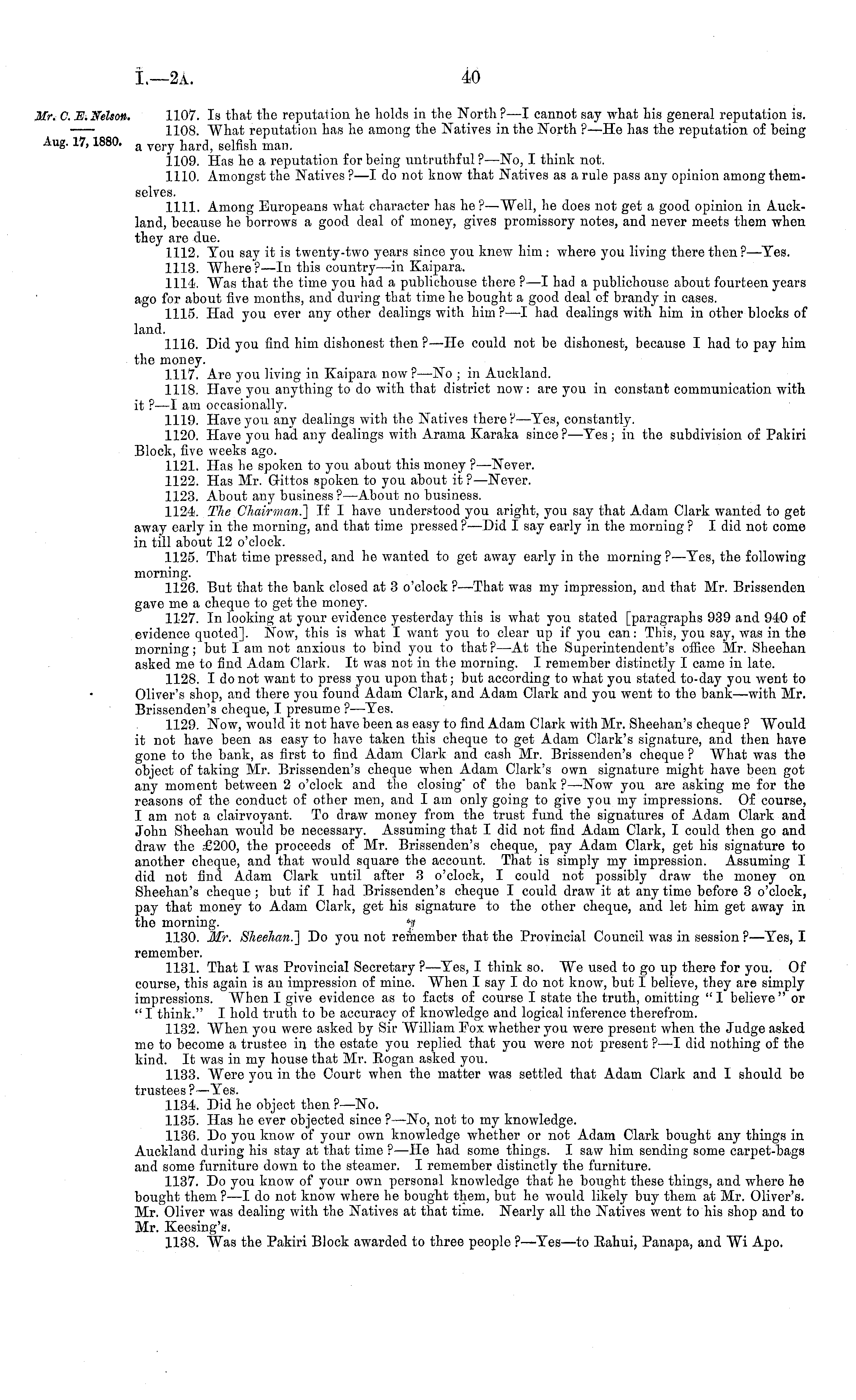 1107. Is that the reputation he holds in the North ? —I cannot say what his general reputation is. 1108. What reputation has he among the Natives in the North ? —He has the reputation of being a very hard, selfish man. 1109. Has he a reputation for being untruthful ? —No, I think not. 1110. Amongst the Natives ?—I do not know that Natives as a rule pass any opinion among themselves. 1111. Among Europeans what character has he? —"Well, he does not get a good opinion in Auckland, because he borrows a good deal of money, gives promissory notes, and never meets them when they are due. 1112. You say it is twenty-two years since you knew him : where you living there then ?—Yes. 1113. Where? —In this country—in Kaipara. 1114. Was that the time you had a publichouse there ?—I had a publichouse about fourteen years ago for about five months, and during that time he bought a good deal of brandy in cases. 1115. Had you ever any other dealings with him ? —1 had dealings with him in other blocks of land. 1116. Did you find him dishonest then ? —He could not be dishonest, because I had to pay him the money. 1117. Are you living in Kaipara now ? —No ; in Auckland. 1118. Have you anything to do with that district now: are you in constant communication with it ?—I am occasionally. 1119. Have you any dealings with the Natives there ? —Yes, constantly. 1120. Have you had any dealings with Arama Karaka since? —Yes; in the subdivision of Pakiri Block, five weeks ago. 1121. Has he spoken to you about this money ? —Never. 1122. Has Mr. dittos spoken to you about it ? —Never. 1123. About any business ? —About no business. 1124. The Chairman.'] If I have understood you aright, you say that Adam Clark wanted to get away early in the morning, and that time pressed ?—Did 1 say eai'ly in the morning ? I did not come in till about 12 o'clock. 1125. That time pressed, and he wanted to get away early in the morning ?—Yes, the following morning. 1126. But that the bank closed at 3 o'clock ?—That was my impression, and that Mr. Brissenden gave me a cheque to get the money. 1127. In looking at your evidence yesterday this is what you stated [paragraphs 939 and 940 of evidence quoted]. Now, this is what I want you to clear up if you can: This, you say, was in the morning; but lam not anxious to bind you to that ? —At the Superintendent's office Mr. Sheehan asked me to find Adam Clark. It was not in the morning. I remember distinctly I came in late. 1128. Ido not want to press you upon that; but according to what you stated to-day you went to Oliver's shop, and there you found Adam Clark, and Adam Clark and you went to the bank—with Mr. Brissenden's cheque, I presume ? —Yes. 1129. Now, would it not have been as easy to find Adam Clark with Mr. Sheehan's cheque ? Would it not have been as easy to have taken this cheque to get Adam Clark's signature, and then have gone to the bank, as first to find Adam Clark and cash Mr. Brissenden's cheque ? What was the object of taking Mr. Brissenden's cheque when Adam Clark's own signature might have been got any moment between 2 o'clock and the closing* of the bank ?—Now you are asking me for the reasons of the conduct of other men, and lam only going to give you my impressions. Of course, lam not a clairvoyant. To draw money from the trust fund the signatures of Adam Clark and John Sheehan would be necessary. Assuming that I did not find Adam Clark, I could then go and draw the £200, the proceeds of Mr. Brissenden's cheque, pay Adam Clark, get his signature to another cheque, and that would square the account. That is simply my impression. Assuming I did not find Adam Clark until after 3 o'clock, I could not possibly draw the money on. Sheehan's cheque ; but if I had Brissenden's cheque I could draw it at any time before 3 o'clock, pay that money to Adam Clark, get his signature to the other cheque, and let him get away in the morning. 1130. Mr. Sheehan.'] Do you not remember that the Provincial Council was in session ?—Yes, I remember. 1131. That I was Provincial Secretary ?—Yes, I think so. We used to go up there for you. Of course, this again is an impression of mine. When I say Ido not know, but I believe, they are simply impressions. When I give evidence as to facts of course I state the truth, omitting " I believe "or " I think." I hold truth to be accuracy of knowledge and logical inference therefrom. 1132. When you were asked by Sir William Fox whether you were present when the Judge asked me to become a trustee in the estate you replied that you were not present ? —I did nothing of the kind. It was in my house that Mr. Kogan asked you. 1133. Were you in the Court when the matter was settled that Adam Clark and I should be trustees ? —Yes. 1134. Did he object then ?—No. 1135. Has he ever objected since ?—No, not to my knowledge. 1136. Do you know of your own knowledge whether or not Adam Clark bought any things in Auckland during his stay at that time ? —He had some things. I saw him sending some carpet-bags and some furniture down to the steamer. I remember distinctly the furniture. 1137. Do you know of your own personal knowledge that he bought these things, and where he bought them ? —I do not know where he bought them, but he would likely buy them at Mr. Oliver's. Mr. Oliver was dealing with the Natives at that time. Nearly all the Natives went to his shop and to Mr. Keesing's. 1138. Was the Pakiri Block awarded to three people ?—Yes —to Eahui, Panapa, and Wi Apo.