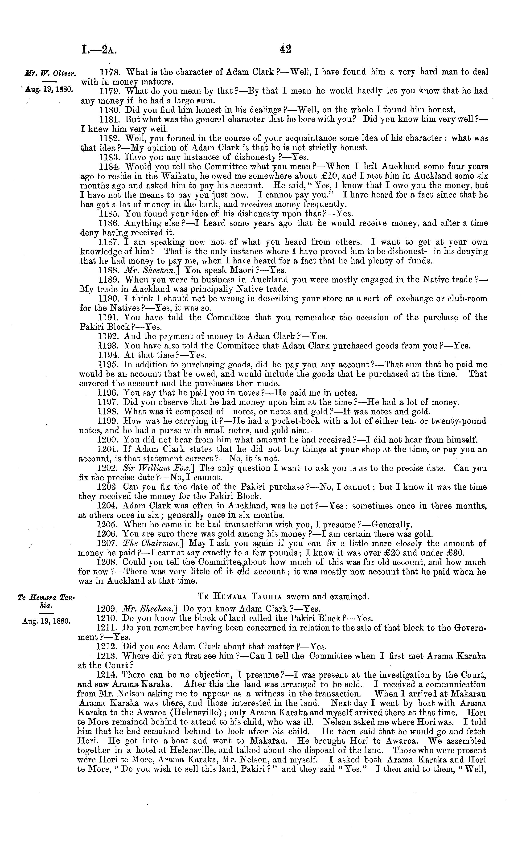 1178. What is the character of Adam Clark ? —"Well, I have found him a very hard man to deal with in money matters. 1179. What do you mean by that ? —By that I mean he would hardly let you know that he had any money if he had a large sum. 1180. Did you find him honest in his dealings ?—Well, on the whole I found him honest. 1181. But what was the general character that he bore with you? Did you know him very well ?— I knew him very well. 1182. Well, you formed in the course of your acquaintance some idea of his character: what was that idea ? —My opinion of Adam Clark is that he is not strictly honest. 1183. Have you any instances of dishonesty?—Tes. 1184. Would you tell the Committee what you mean? —When I left Auckland some four years ago to reside in the Waikato, he owed me somewhere about £10, and I met him in Auckland some six months ago and asked him to pay his account. He said," Tes, I know that I owe you the money, but I have not the means to pay you just now. I cannot pay you." I have heard for a fact since that he has got a lot of money in the bank, and receives money frequently. 1185. You found your idea of his dishonesty upon that ? —Tes. 1186. Anything else ?—I heard some years ago that he would receive money, and after a time deny having received it. 1187. I am speaking now not of what you heard from others. I want to get at your own knowledge of him ?—That is the only instance where I have proved him to be dishonest—in his denying that he had money to pay me, when I have heard for a fact that he had plenty of funds. 1188. Mr. SheehanJ] Tou speak Maori ? —Tes. 1189. When you were in business in Auckland you were mostly engaged in the Native trade ?— My trade in Auckland was principally Native trade. 1190. I think I should not be wrong in describing your store as a sort of exchange or club-room for the Natives ?—Tes, it was so. 1191. Tou have told the Committee that you remember the occasion of the purchase of the Pakiri Block?—Tes. 1192. And the payment of money to Adam Clark?—Tes. 1193. Tou have also told the Committee that Adam Clark purchased goods from you ?—Tes. 1194. At that time ?—Tes. 1195. In addition to purchasing goods, did he pay you any account?— That sum that he paid me would be an account that he owed, and would include the goods that he purchased at the time. That covered the account and the purchases then made. 1190. Tou say that he paid you in notes p-^-He paid me in notes. 1197. Did you observe that he had money upon him at the time ?—He had a lot of money. 1198. What was it composed of —notes, or notes and gold ? —lt was notes and gold. 1199. How was he carrying it? —He had a pocket-book with a lot of either ten- or twenty-pound notes, and he had a purse with small notes, and gold also. 1200. Tou did not hear from him what amount he had received ? —I did not hear from himself. 1201. If Adam Clark states that he did not buy things at your shop at the time, or pay you an account, is that statement correct ? —'No, it is not. 1202. Sir William Fox."] The only question I want to ask you is as to the precise date. Can you fix the precise date? —No, I cannot. 1203. Can you fix the date of the Pakiri purchase ? —No, I cannot; but I know it was the time they received the money for the Pakiri Block. 1204. Adam Clark was often in Auckland, was he not ?—Tes : sometimes once in three months, at others once in six; generally once in six months. 1205. When he came in he had transactions with you, I presume ?—Generally. 1206. Tou are sure there was gold among his money ?—I am certain there was gold. 1207. The Chairman^] May I ask you again if you can fix a little more closely the amount of money he paid ? —I cannot say exactly to a few pounds; I know it was over £20 and under £30. 1208. Could you tell the Committee about how much of this was for old account, and how much for new ? —There was very little of it old account; it was mostly new account that he paid when he was in Auckland at that time. Te Hemaka Tatjhia sworn and examined. 1209. Mr. Sheehan.'] Do you know Adam Clark ? —Tes. 1210. Do you know the block of land called the Pakiri Block ?—Tes. 1211. Do you remember having been concerned in relation to the sale of that block to the Government ? —Tes. 1212. Did you see Adam Clark about that matter ? —Tes. 1213. Where did you first see him ? —Can I tell the Committee when I first met Arama Karaka at the Court ? 1214. There can be no objection, I presume?—l was present at the investigation by the Court, and saw Arama Karaka. After this the land was arranged to be sold. I received a communication from Mr. Nelson asking me to appear as a witness in the transaction. When I arrived at Makarau Arama Karaka was there, and those interested in the land. Next day I went by boat with Arama Karaka to the Awaroa (Helensville) ; only Arama Karaka and myself arrived there at that time. Hori te More remained behind to attend to his child, who was ill. Nelson asked me where Hori was. I told him that he had remained behind to look after his child. He then said that he would go and fetch Hori. He got into a boat and went to Makarau. He brought Hori to Awaroa. We assembled together in a hotel at Helensville, and talked about the disposal of the land. Those who were present were Hori te More, Arama Karaka, Mr. Nelson, and myself. I asked both Arama Karaka and Hori te More, "Do you wish to sell this land, Pakiri ? " and they said " Tes." I then said to them, " Well,