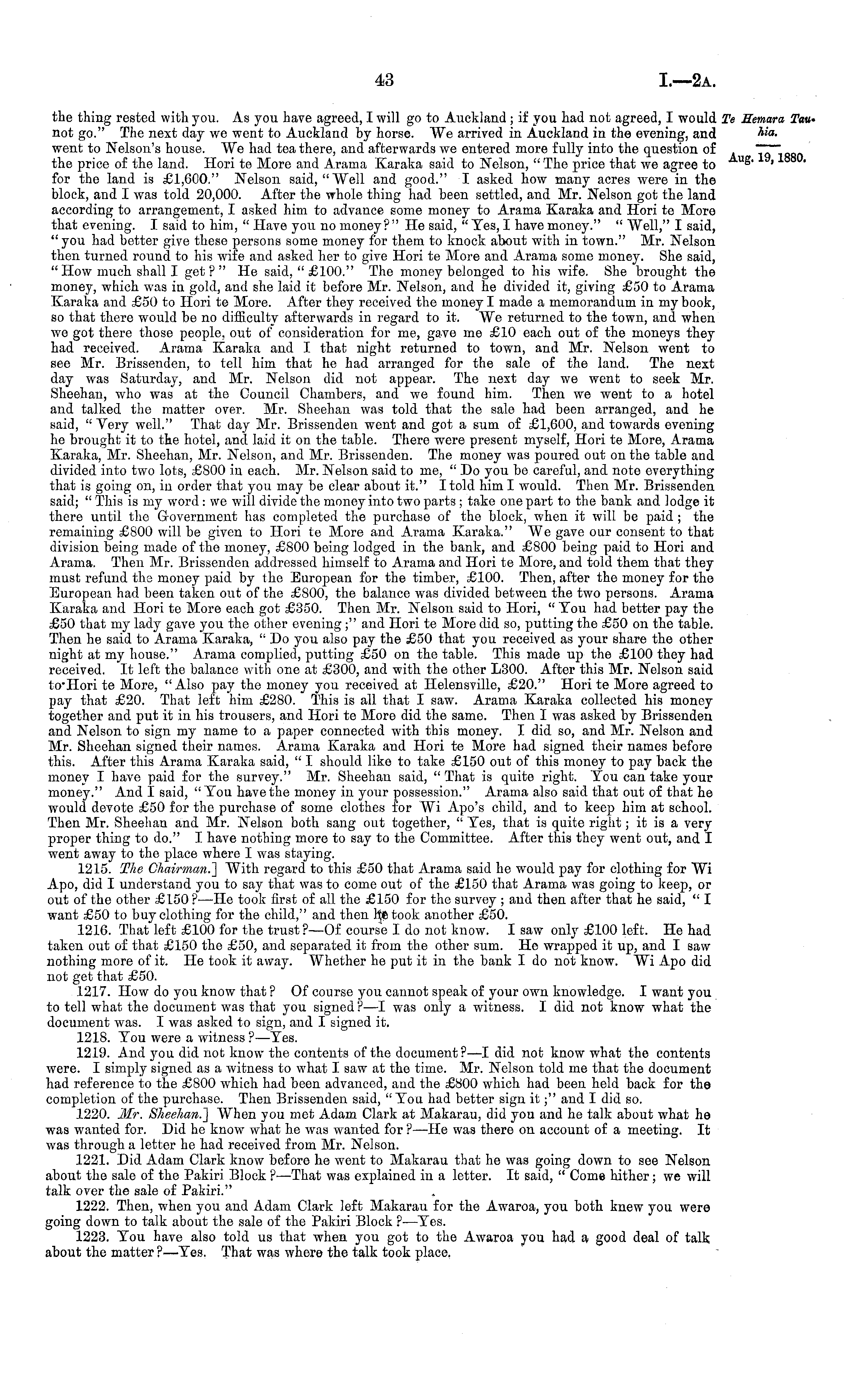 the thing rested with you. As you have agreed, I will go to Auckland; if you had not agreed, I would not go." The next day we went to Auckland by horse. "We arrived in Auckland in the evening, and went to Nelson's house. "We had tea there, and afterwards we entered more fully into the question of the price of the land. Hori te More and Arama Karaka said to Nelson, " The price that we agree to for the land is £1,600." Nelson said,""Well and good." I asked how many acres were in the block, and I was told 20,000. After the whole thing had been settled, and Mr. Nelson got the land according to arrangement, I asked him to advance some money to Arama Karaka and Hori te More that evening. I said to him, " Have you no money?" He said, " Yes, I have money." " Well," I said, " you had better give these persons some money for them to knock about with in town." Mr. Nelson then turned round to his wife and asked her to give Hori te More and Arama some money. She said, "How much shall I get?" He said, "£100." The money belonged to his wife. She brought the money, which was in gold, and she laid it before Mr. Nelson, and he divided it, giving £50 to Arama Karaka and £50 to Hori te More. After they received the money I made a memorandum in my book, so that there would be no difficulty afterwards in regard to it. We returned to the town, and when we got there those people, out of consideration for me, gave me £10 each out of the moneys they had received. Arama Karaka and I that night returned to town, and Mr. Nelson went to see Mr. Brissenden, to tell him that he had arranged for the sale of the land. The next day was Saturday, and Mr. Nelson did not appear. The next day we went to seek Mr. Sheehan, who was at the Council Chambers, and we found him. Then we went to a hotel and talked the matter over. Mr. Sheehan was told that the sale had been arranged, and he said, " Very well." That day Mr. Brissenden went and got a sum of £1,600, and towards evening he brought it to the hotel, and laid it on the table. There were present myself, Hori te More, Arama Karaka, Mr. Sheehan, Mr. Nelson, and Mr. Brissenden. The money was poured out on the table and divided into two lots, £800 in each. Mr. Nelson said to me, "Do you be careful, and note everything that is going on, in order that you may be clear about it." I told him I would. Then Mr. Brissenden said; " This is my word : we will divide the money into two parts ; take one part to the bank and lodge it there until the Government has completed the purchase of the block, when it will be paid ; the remaining £800 will be given to Hori te More and Arama Karaka." We gave our consent to that division being made of the money, £800 being lodged in the bank, and £800 being paid to Hori and Arama. Then Mr. Brissenden addressed himself to Arama and Hori te More, and told them that they must refund ths money paid by the European for the timber, £100. Then, after the money for the European had been taken out of the £800, the balance was divided between the two persons. Arama Karaka and Hori te More each got £350. Then Mr. Nelson said to Hori, " You had better pay the £50 that my lady gave you the other evening ;" and Hori te More did so, putting the £50 on the table. Then he said to Arama Karaka, " Do you also pay the £50 that you received as your share the other night at my house." Arama complied, putting £50 on the table. This made up the £100 they had received. It left the balance with one at £300, and with the other L3OO. After this Mr. Nelson said to'Hori te More, "Also pay the money you received at Helensville, £20." Hori te More agreed to pay that £20. That left him £280. This is all that I saw. Arama Karaka collected his money together and put it in his trousers, and Hori te More did the same. Then I was asked by Brissenden and Nelson to sign my name to a paper connected with this money. I did so, and Mr. Nelson and Mr. Sheehan signed their names. Arama Karaka and Hori te More had signed their names before this. After this Arama Karaka said, " I should like to take £150 out of this money to pay back the money I have paid for the survey." Mr. Sheehan said, " That is quite right. You can take your money." And I said, "You have the money in your possession." Arama also said that out of that he would devote £50 for the purchase of some clothes for Wi Apo's child, and to keep him at school. Then Mr. Sheehan and Mr. Nelson both sang out together, " Yes, that is quite right; it is a very proper thing to do." I have nothing more to say to the Committee. After this they went out, and I went away to the place where I was staying. 1215. The Chairman.~\ With regard to this £50 that Arama said he would pay for clothing for Wi Apo, did I understand you to say that was to come out of the £150 that Arama was going to keep, or out of the other £150 ?• —He took first of all the £150 for the survey ; and then after that he said, " I want £50 to buy clothing for the child," and then betook another £50. 1216. That left £100 for the trust?—Of course Ido not know. I saw only £100 left. He had taken out of that £150 the £50, and separated it from the other sum. He wrapped it up, and I saw nothing more of it. He took it away. Whether he put it in the bank Ido not know. Wi Apo did not get that £50. 1217. How do you know that ? Of course you cannot speak of your own knowledge. I want you to tell what the document was that you signed ? —I was only a witness. I did not know what the document was. I was asked to sign, and I signed it. 1218. You were a witness ?—Yes. 1219. And you did not know the contents of the document ?—I did not know what the contents were. I simply signed as a witness to what I saw at the time. Mr. Nelson told me that the document had reference to the £800 which had been advanced, and the £800 which had been held back for the completion of the purchase. Then Brissenden said, "You had better sign it;" and I did so. 1220. Mr. B