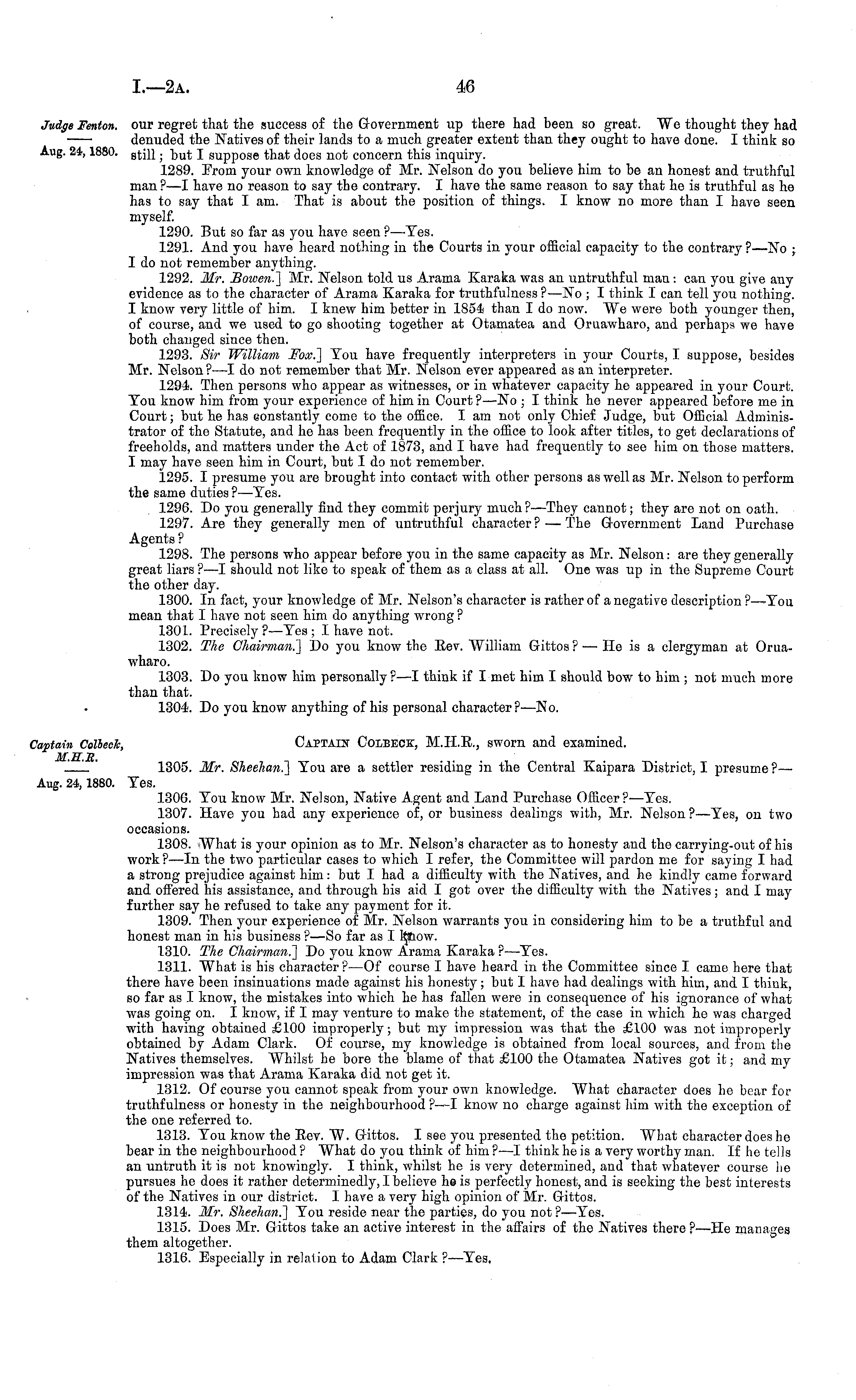 our regret that the success of the Government up there had been so great. We thought they had denuded the Natives of their lands to a much greater extent than they ought to have done. I think so still; but I suppose that does not concern this inquiry. 1289. From your own knowledge of Mr. Nelson do you believe him to be an honest and truthful man?—l have no reason to say the contrary. I have the same reason to say that he is truthful as he has to say that I am. That is about the position of things. I know no more than I have seen myself. 1290. But so far as you have seen ? —Tes. 1291. And you have heard nothing in the Courts in your official capacity to the contrary ?—No ; I do not remember anything. 1292. Mr. Bowen.] Mr. Nelson told us Arama Karaka was an untruthful man : can you give any evidence as to the character of Arama Karaka for truthfulness ?—No ; I think I can tell you nothing. I know very little of him. I knew him better in 1854 than Ido now. We wero both younger then, of course, and we used to go shooting together at Otamatea and Oruawharo, and perhaps we have both changed since then. 1293. Sir William Fox.] You have frequently interpreters in your Courts, I suppose, besides Mr. Nelson ? —I do not remember that Mr. Nelson ever appeared as an interpreter. 1294. Then persons who appear as witnesses, or in whatever capacity he appeared in your Court. You know him from your experience of him in Court? —No ; I think he never appeared before me in Court; but he has constantly come to the office. I am not only Chief Judge, but Official Administrator of the Statute, and he has been frequently in the office to look after titles, to get declarations of freeholds, and matters under the Act of 1873, and I have had frequently to see him on those matters. I may have seen him in Court, but I do not remember. 1295. I presume you are brought into contact with other persons as well as Mr. Nelson to perform the same duties ? —Yes. 1296. Do you generally find they commit perjury much? —They cannot; they are not on oath. 1297. Are they generally men of untruthful character ? — The Government Land Purchase Agents ? 1298. The persons who appear before you in the same capacity as Mr. Nelson: are they generally great liars ? —I should not like to speak of them as a class at all. One was up in the Supreme Court the other day. 1300. In fact, your knowledge of Mr. Nelson's character is rather of a negative description ?—You mean that I have not seen him do anything wrong ? 1301. Precisely ?—Yes ; I have not. 1302. The Chairman.'] Do you know the Rev. William Gittos ? — He is a clergyman at Oruawharo. 1303. Do you know him personally?—l think if I met him I should bow to him ; not much more than that. 1304. Do you know anything of his personal character? —No. p Captain Colbeck, M.H.E., sworn and examined. 1305. Mr. Sheehan.] You are a settler residing in the Central Kaipara District. I presume?— Yes. 1306. You know Mr. Nelson, Native Agent and Land Purchase Officer? —Yes. 1307. Have you had any experience of, or business dealings with, Mr. Nelson ?—Yes, on two occasions. 1308. What is your opinion as to Mr. Nelson's character as to honesty and the carrying-out of his work? —In the two particular cases to which I refer, the Committee will pardon me for saying I had a strong prejudice against him: but I had a difficulty with the Natives, and he kindly came forward and offered his assistance, and through his aid I got over the difficulty with the Natives ; and I may further say he refused to take any payment for it. 1309. Then your experience of Mr. Nelson warrants you in considering him to be a truthful and honest man in his business ?—So far as I know. 1310. The Chairman.] Do you know Arama Karaka ? —Yes. 1311. What is his character ? —Of course I have heard in the Committee since I came here that there have been insinuations made against his honesty; but I have had dealings with him, and I think, so far as I know, the mistakes into which he has fallen were in consequence of his ignorance of what was going on. I know, if I may venture to make the statement, of the case in which he was charged with having obtained £100 improperly; but my impression was that the £100 was not improperly obtained by Adam Clark. Of course, my knowledge is obtained from local sources, and from the Natives themselves. Whilst he bore the blame of that £100 the Otamatea Natives got it; and my impression was that Arama Karaka did not get it. 1312. Of course you cannot speak from your own knowledge. What character does he bear for truthfulness or honesty in the neighbourhood ?—I know no charge against him with the exception of the one referred to. 1313. You know the Sev. W. Gittos. I sco you presented the petition. What character does he bear in the neighbourhood ? What do you think of him ?—I think he is a very worthy man. If he tells an untruth it is not knowingly. I think, whilst he is very determined, and that whatever course he pursues he does it rather determinedly, I believe he is perfectly honest, and is seeking the best interests of the Natives in our district. I have a very high opinion of Mr. Gittos. 1314. Mr. Sheehan.] You reside near the parties, do you not ? —Yes. 1315. Does Mr. Gittos take an active interest in the affairs of the Natives there ?—He manages them altogether. 1316. Especially in relation to Adam Clark ? —Yes,