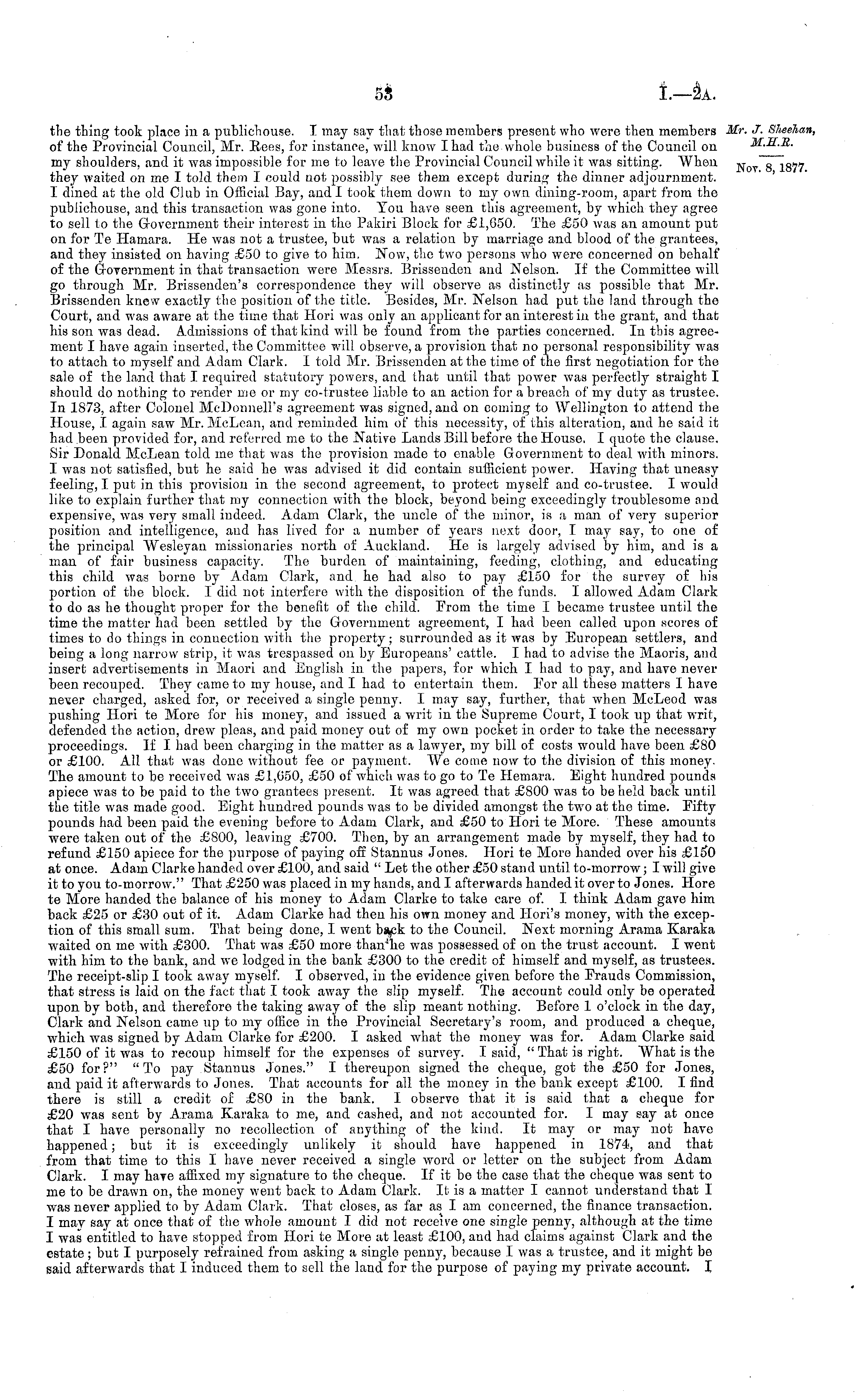 the tiling took place in a publichouse. I may say that those members present who were then members of the Provincial Council, Mr. Bees, for instance, will know I had the whole business of the Council on my shoulders, and it was impossible for me to leave the Provincial Council while it was sitting. When they waited on me I told them I could not possibly see them except during the dinner adjournment. I dined at the old Club in Official Bay, and I took them down to my own dining-room, apart from the publichouse, and this transaction was gone into. You have seen this agreement, by which they agree to sell to the Government their interest in tho Pakiri Block for £1,050. The £50 was an amount put on for Te Hamara. He was not a trustee, but was a relation by marriage and blood of the grantees, and they insisted on having £50 to give to him. Now, the two persons who were concerned on behalf of the G-overnment in that transaction were Messrs. Brissenden and Nelson. If the Committee will go through Mr. Brissenden's correspondence they will observe as distinctly as possible that Mr. Brissenden knew exactly the position of the title. Besides, Mr. Nelson had put the land through the Court, and was aware at the time that Hori was only an applicant for an interest iv the grant, and that his son was dead. Admissions of that kind will be found from the parties concerned. In this agreement I have again inserted, the Committee will observe, a provision that no personal responsibility was to attach to myself and Adam Clark. I told Mr. Brissenden at the time of the first negotiation for the sale of the land that I required statutory powers, and that until that power was perfectly straight I should do nothing to render me or my co-trustee liable to an action for a breach of my duty as trustee. In 1873, after Colonel McDonnell's agreement was signed, and on coming to Wellington to attend the House, I again saw Mr. McLean, and reminded him of this necessity, of this alteration, and he said it had been provided for, and referred me to the Native Lands Bill before the House. I quote the clause. Sir Donald McLean told me that was the provision made to enable Government to deal with minors. I was not satisfied, but he said he was advised it did contain sufficient power. Having that uneasy feeling, I put in this provision in the second agreement, to protect myself and co-trustee. I would like to explain further that my connection with the block, beyond being exceedingly troublesome and expensive, was very small indeed. Adam Clark, the uncle of the minor, is a man of very superior position and intelligence, and has lived for a number of years next door, I may say, to one of the principal W resleyan missionaries north of Auckland. He is largely advised by him, and is a man of fair business capacity. Tho burden of maintaining, feeding, clothing, and educating this child was borne by Adam Clark, and, he had also to pay £150 for the survey of his portion of the block. I did not interfere with the disposition of the funds. 1 allowed Adam Clark to do as he thought proper for the benefit of the child. From the time I became trustee until the time the matter had been settled by the Grovernment agreement, I had been called upon scores of times to do things in connection with the property; surrounded as it was by European settlers, and being a long narrow strip, it was trespassed on by Europeans' cattle. I had to advise the Maoris, and insert advertisements in Maori and English in the papers, for which I had to pay, and have never been recouped. They came to my house, and I had to entertain them. For all these matters I have neVer charged, asked for, or received a single penny. I may say, further, that when McLeod was pushing Hori te More for his money, and issued a writ in the Supreme Court, 1 took up that writ, defended the action, drew pleas, and paid money out of my own pocket in order to take the necessary proceedings. If I had been charging in the matter as a lawyer, my bill of costs would have been £80 or £100. All that was done without fee or payment. We come now to the division of this money. The amount to be received was £1,050, £50 of which was to go to Te Hemara. Eight hundred pounds apiece was to be paid to the two grantees present. It was agreed that £800 was to beheld back until the title was made good. Eight hundred pounds was to be divided amongst the two at the time. Fifty pounds had been paid the evening before to Adam Clark, and £50 to Hori te More. These amounts were taken out of the £800, leaving £700. Then, by an arrangement made by myself, they had to refund £150 apiece for the purpose of paying off Stannus Jones. Hori te More handed over his £150 at once. Adam Clarke handed over £100, and said " Let the other £50 stand until to-morrow; I will give it to you to-morrow." That £250 was placed in my hands, and I afterwards handed it over to Jones. Hore te More handed the balance of his money to Adam Clarke to take care of. I think Adam gave him back £25 or £30 out of it. Adam Clarke had then his own money and liori's money, with the exception of this small sum. That being done, I went ba<ck to the Council. Next morning Arama Karaka waited on me with £300. That was £50 more than'he was possessed of on the trust account. I went with him to the bank, and we lodged in the bank £300 to the credit of himself and myself, as trustees. The receipt-slip I took away myself. I observed, in the evidence given before the Frauds Commission, that stress is laid on the fact that I took away the slip myself. The account could only be operated upon by both, and therefore the taking away of the slip meant nothing. Before 1 o'clock in the day, Clark and Nelson came up to my office in the Provincial Secretary's room, and produced a cheque, which was signed by Adam Clarke for £200. I asked what the money was for. Adam Clarke said £150 of it was to recoup himself for the expenses of survey. I said, " That