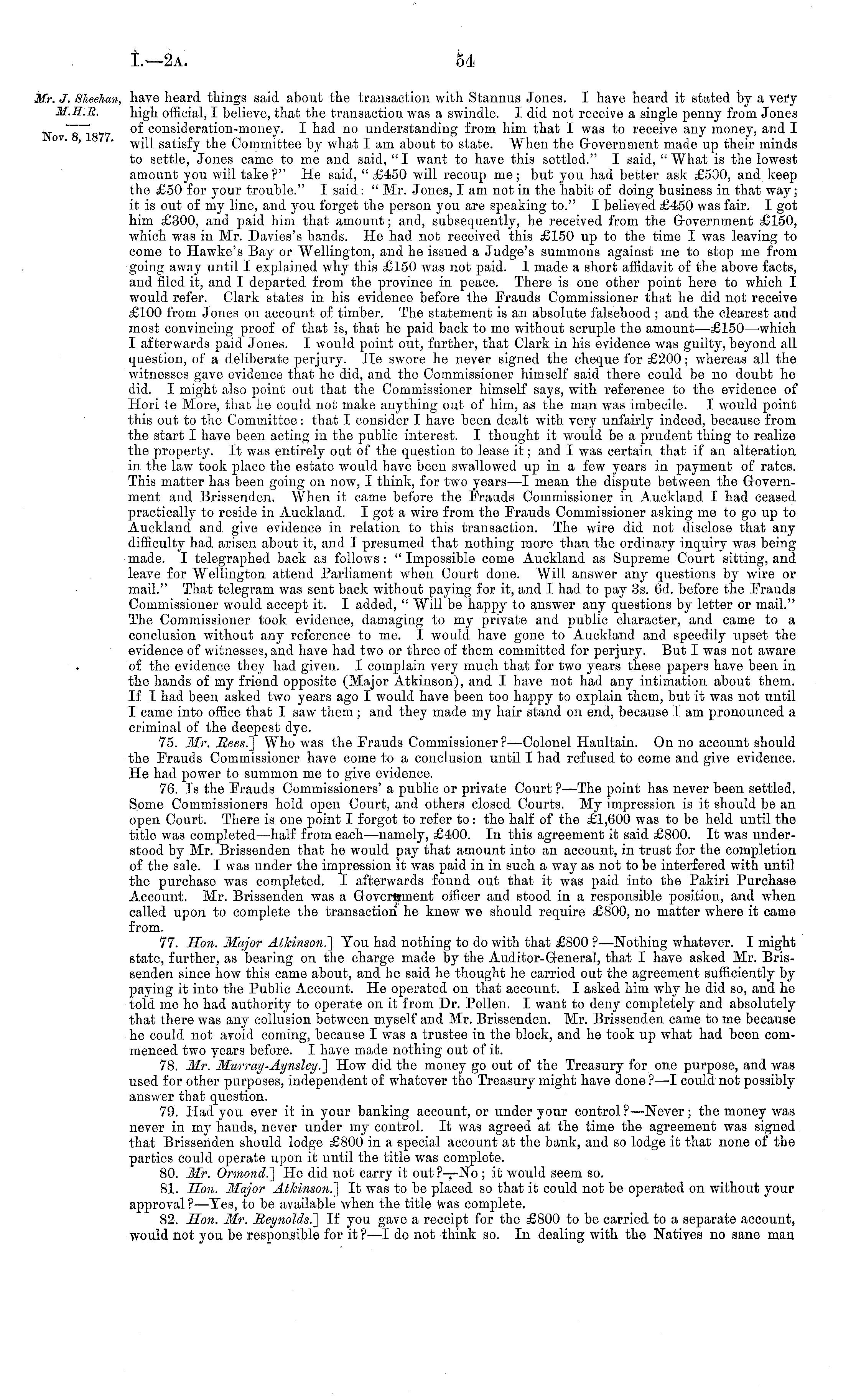 have heard things said about the transaction with Stannus Jones. I have heard it stated by a very high official, I believe, that the transaction was a swindle. I did not receive a single penny from Jones of consideration-money. I had no understanding from him that 1 was to receive any money, and I will satisfy the Committee by what lam about to state. When the Government made up their minds to settle, Jones came to me and said, "I want to have this settled." I said, " What is the lowest amount you will take?" He said, " £450 will recoup me; but you had better ask £500, and keep the £50 for your trouble." I said : " Mr. Jones, lam not in the habit of doing business in that way; it is out of my line, and you forget the person you are speaking to." I believed £450 was fair. I got him £300, and paid him that amount; and, subsequently, he received from the G-overnment £150, which was in Mr. Davies's hands. He had not received this £150 up to the time I was leaving to come to Hawke's Bay or Wellington, and he issued a Judge's summons against me to stop me from going away until I explained why this £150 was not paid. I made a short affidavit of the above facts, and filed it, and I departed from the province in peace. There is one other point here to which I would refer. Clark states in his evidence before the Frauds Commissioner that he did not receive £100 from Jones on account of timber. The statement is an absolute falsehood ; and the clearest and most convincing proof of that is, that he paid back to me without scruple the amount—£ls0 —which I afterwards paid Jones. I would point out, further, that Clark in his evidence was guilty, beyond all question, of a deliberate perjury. He swore he never signed the cheque for £200; whei'eas all the witnesses gave evidence that he did, and the Commissioner himself said there could be no doubt he did. I might also point out that the Commissioner himself says, with reference to the evidence of Hori te More, that he could not make anything out of him, as the man was imbecile. I would point this out to the Committee: that I consider 1 have been dealt with very unfairly indeed, because from the start I have been acting in the public interest. I thought it would be a prudent thing to realize the property. It was entirely out of the question to lease it; and I was certain that if an alteration in the law took place the estate wrould have been swallowed up in a few years in payment of rates. This matter has been going on now, I think, for two years —I mean the dispute between the Grovernment and Brissenden. When it came before the Frauds Commissioner in Auckland I had ceased practically to reside in Auckland. I got a wire from the Frauds Commissioner asking me to go up to Auckland and give evidence in relation to this transaction. The wire did not disclose that any difficulty had arisen about it, and I presumed that nothing more than the ordinary inquiry was being made. I telegraphed back as follows : " Impossible come Auckland as Supreme Court sitting, and leave for Wellington attend Parliament when Court done. Will answer any questions by wire or mail." That telegram was sent back without paying for it, and I had to pay 3s. 6d. before the Frauds Commissioner would accept it. I added, " Will be happy to answer any questions by letter or mail." The Commissioner took evidence, damaging to my private and public character, and came to a conclusion without any reference to me. I would have gone to Auckland and speedily upset the evidence of witnesses, and have had two or three of them committed for perjury. But I was not aware of the evidence they had given. I complain very much that for two years these papers have been in the hands of my friend opposite (Major Atkinson), and I have not had any intimation about them. If I had been asked two years ago I would have been too happy to explain them, but it was not until I came into office that I saw them ; and they made my hair stand on end, because I am pronounced a criminal of the deepest dye. 75. Mr. Sees.] Who was the Frauds Commissioner? —Colonel Haultain. On no account should the Frauds Commissioner have come to a conclusion until I had refused to come and give evidence. He had power to summon me to give evidence. 76. Is the Frauds Commissioners' a public or private Court ? —The point has never been settled. Some Commissioners hold open Court, and others closed Courts. My impression is it should be an open Court. There is one point I forgot to refer to: the half of the £1,600 was to be held until the title was completed —half from each—namely, £400. In this agreement it said £800. It was understood by Mr. Brissenden that he would pay that amount into an account, in trust for the completion of the sale. I was under the impression it was paid in in such a way as not to be interfered with until the purchase was completed. I afterwards found out that it was paid into the Pakiri Purchase Account. Mr. Brissenden was a Groveroment officer and stood in a responsible position, and when called upon to complete the transaction he knew we should require £800, no matter where it came from. 77. Son. Major Atkinson.'] You had nothing to do with that £800 ? —Nothing whatever. I might state, further, as bearing on the charge made by the Auditor-Greneral, that I have asked Mr. Brissenden since how this came about, and he said he thought he carried out the agreement sufficiently by paying it into the Public Account. He operated on that account. I asked him why he did so, and he told me he had authority to operate on it from Dr. Pollen. I want to deny completely and absolutely that there was any collusion between myself and Mr. Brissenden. Mr. Brissenden came to me because he could not avoid coming, because I was a trustee in the block, and he took up what had been commenced two years before. I have made nothing out of it. 78. Mr. Murray-Aynsley.] How did the money go out of the Treasury for one purp