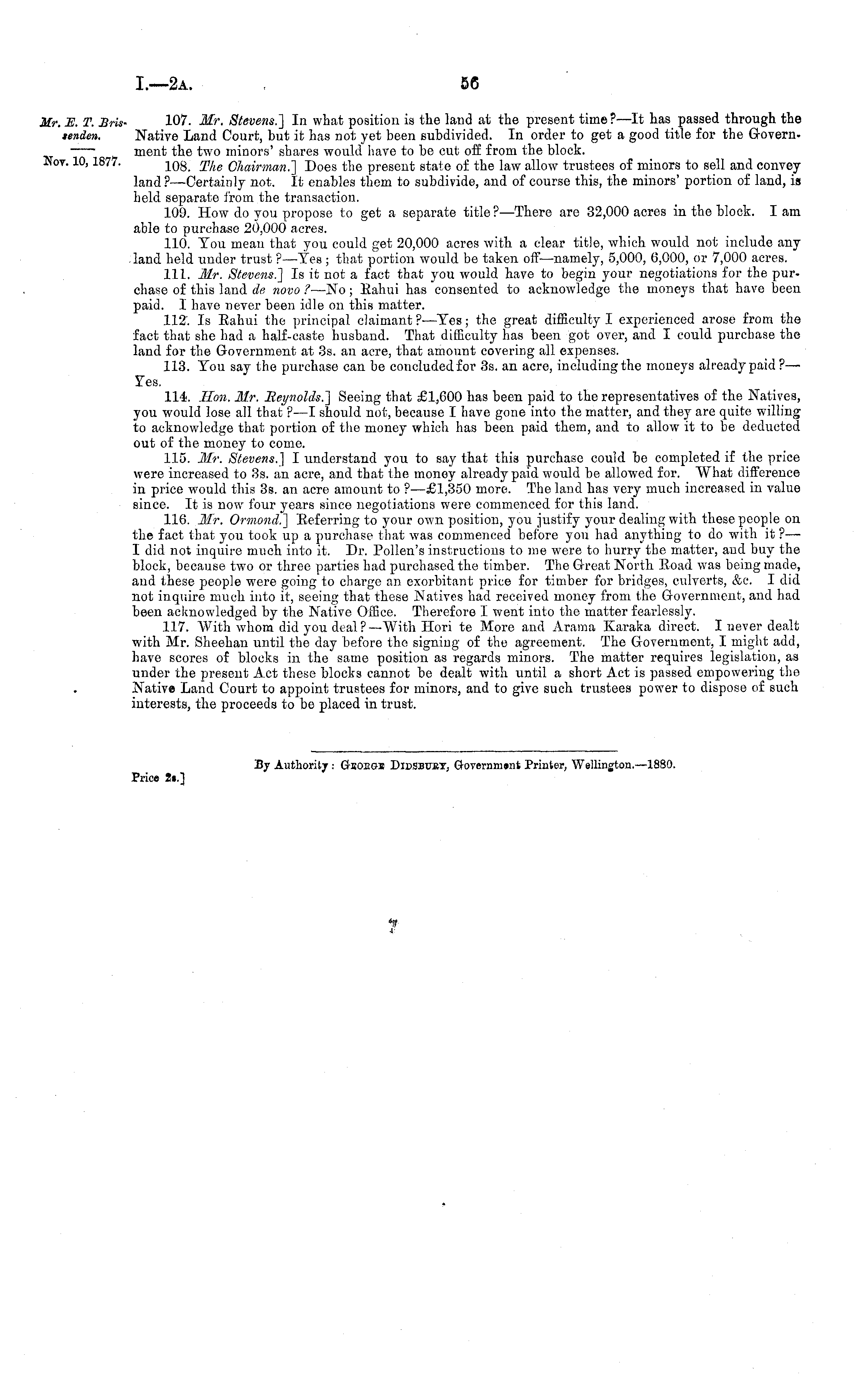 107. Mr. Stevens.'] In what position is the land at the present time? —It has passed through the Native Land Court, but it lias not yet been subdivided. In order to get a good title for the Government the two minors' shares would have to be cut off from the block. 108. The Chairman.'] Does the present state of the law allow trustees of minors to sell and convey land?— Certainly not. It enables them to subdivide, and of course this, the minors' portion of land, is held separate from the transaction. 109. How do you propose to get a separate title ? —There are 32,000 acres in the block. lam able to purchase 20,000 acres. 110. You mean that you could get 20,000 acres with a clear title, which would not include any land, held under trust ? —Tea ; that portion would be taken off —namely, 5,000, 6,000, or 7,000 acres. 111. Mr. Stevens.] Is it not a fact that you would have to begin your negotiations for the purchase of this land de novo ? —No; Eahui has consented to acknowledge the moneys that have been paid. 1 have never been idle on this matter. 112. Is Kahui the principal claimant ?• —Yes; the great difficulty I experienced arose from the fact that she had a half-caste husband. That difficulty has been got over, and I could purchase the land for the Government at 3s. an acre, that amount covering all expenses. 113. You say the purchase can be concluded for 3s. an acre, including the moneys already paid ?— Yes. 114. lion. Mr. Beynolds.] Seeing that £1,600 has been paid to the representatives of the Natives, you would lose all that ? —I should not, because I have gone into the matter, and the)7" are quite willing to acknowledge that portion of the money which has been paid them, and to allow it to be deducted out of the money to come. 115. Mr. Stevens.] I understand you to say that this purchase could be completed if the price were increased to 3s. an acre, and that the money already paid would bo allowed for. What difference in price would this 3s. an acre amount to ?—£1,350 more. The land has very much increased in value since. It is now four years since negotiations were commenced for this land. 116. Mr. Ortnond,] Eeferring to your own position, you justify your dealing with these people on the fact that you took up a purchase that was commenced before you had anything to do with it ?—- I did not inquire much into it. Dr. Pollen's instructions to me were to hurry the matter, and buy the block, because two or three parties had purchased the timber. The Great North Eoad was being made, and these jDeople were going to charge an exorbitant price for timber for bridges, culverts, &c. I did not inquire much into it, seeing that these Natives had received money from the Government, and had been acknowledged by the Native Office. Therefore I went into the matter fearlessly. 117. With whom did you deal ?—With Hori te More and Aram a Karaka direct. I never dealt with Mr. Sheehan until the day before the signing of the agreement. The Government, I might add, have scores of blocks in the same position as regards minors. The matter requires legislation, as under the present Act these blocks cannot be dealt with until a short Act is passed empowering the Native Land Court to appoint trustees for minors, and to give such trustees power to dispose of such interests, the proceeds to be placed in trust.