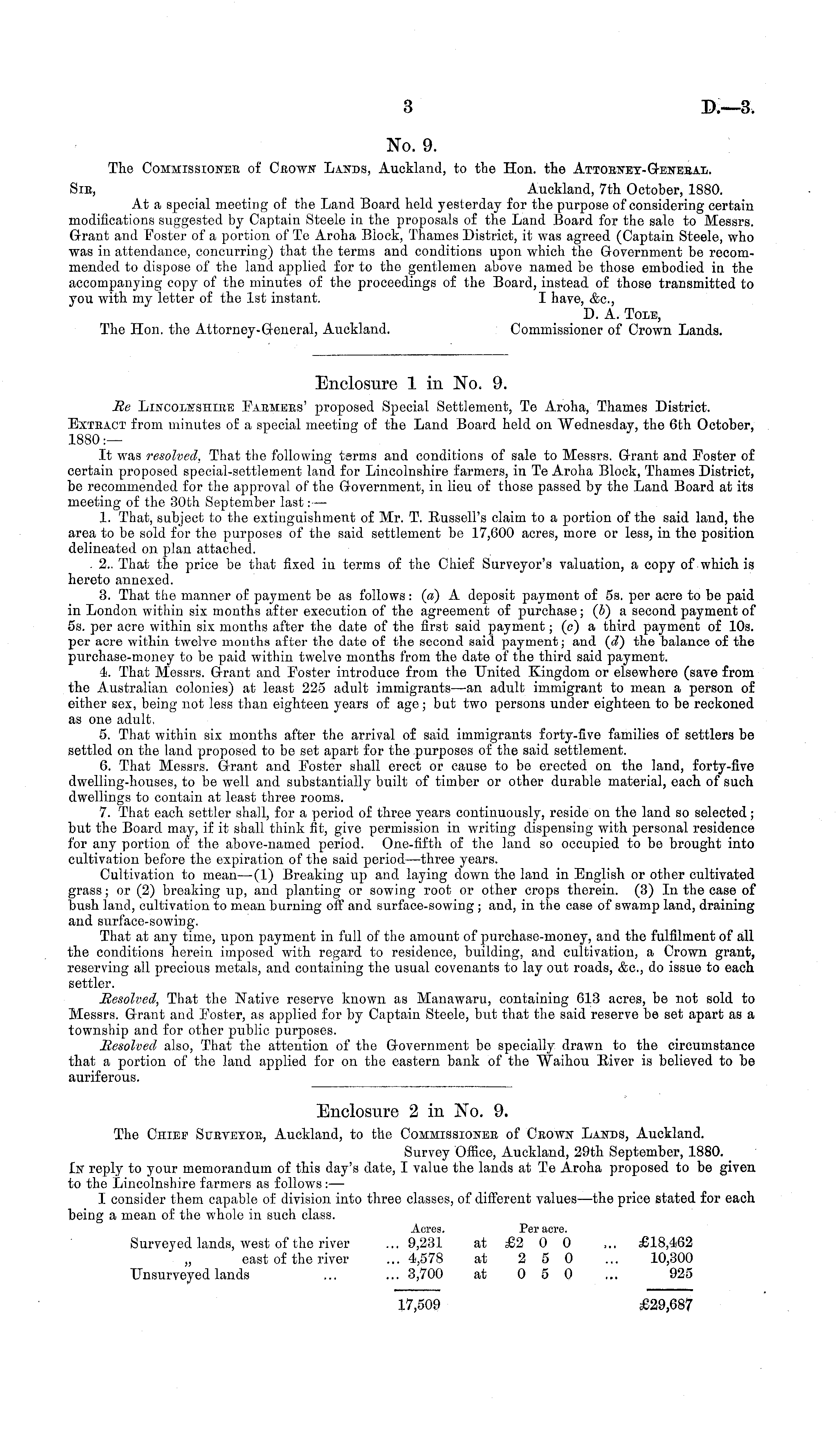 Enclosure 1 in No. 9. Re Lincolnshire Farmers' proposed Special Settlement, Te Aroha, Thames District. Extract from minutes of a special meeting of the Land Board held on Wednesday, the 6th October, 1880:— It was resolved, That the following tsrms and conditions of sale to Messrs. Grant and Poster of certain proposed special-settlement land for Lincolnshire farmers, in Te Aroha Block, Thames District, be recommended for the approval of the Government, in lieu of those passed by the Land Board at its meeting of the 30th September last: — 1. That, subject to the extinguishment of Mr. T. Eussell's claim to a portion of the said land, the area to be sold for the purposes of the said settlement be 17,600 acres, more or less, in the position delineated on plan attached. . 2.. That the price be that fixed in terms of the Chief Surveyor's valuation, a copy of which is hereto annexed. 3. That the manner of payment be as follows: (a) A deposit payment of ss. per acre to be paid in London within six months after execution of the agreement of purchase; (.) a second payment of ss. per acre within six months after the date of the first said payment; (c) a third payment of 10s. per aero within twelve months after the date of the second said payment; and (t.) the balanco of the purchase-money to be paid within twelve months from the date of the third said payment. 4. That Messrs. Grant and Foster introduce from the United Kingdom or elsewhere (save from the Australian colonies) at least 225 adult immigrants—an adult immigrant to mean a person of either sex, being not less than eighteen years of age; but two persons under eighteen to be reckoned as one adult, 5. That within six months after the arrival of said immigrants forty-five families of settlers be settled on the land proposed to be set apart for the purposes of the said settlement. 6. That Messrs. Grant and Poster shall erect or cause to be erected on the land, forty-five dwelling-houses, to be well and substantially built of timber or other durable material, each of such dwellings to contain at least three rooms. 7. That each settler shall, for a period of three years continuously, reside on the land so selected; but the Board may, if it shall think fit, give permission in writing dispensing with personal residence for any portion of the above-named period. One-fifth of the land so occupied to be brought into cultivation before the expiration of the said period —three years. Cultivation to mean —(1) Breaking up and laying down the land in English or other cultivated grass; or (2) breaking up, and planting or sowing root or other crops therein. (3) In the case of bush land, cultivation to mean burning off and surface-sowing ; and, in the case of swamp land, draining and surface-sowing. That at any time, upon payment in full of the amount of purchase-money, and the fulfilment of all the conditions herein imposed with regard to residence, building, and cultivation, a Crown grant, reserving all precious metals, and containing the usual covenants to lay out roads, &c, do issue to each settler. Resolved, That the Native reserve known as Manawaru, containing 613 acres, be not sold to Messrs. Grant and Poster, as applied for by Captain Steele, but that the said reserve be set apart as a township and for other public purposes. Resolved also, That the attention of the Government be specially drawn to the circumstance that a portion of the land applied for on the eastern bank of the Waihou Eiver is believed to be auriferous.