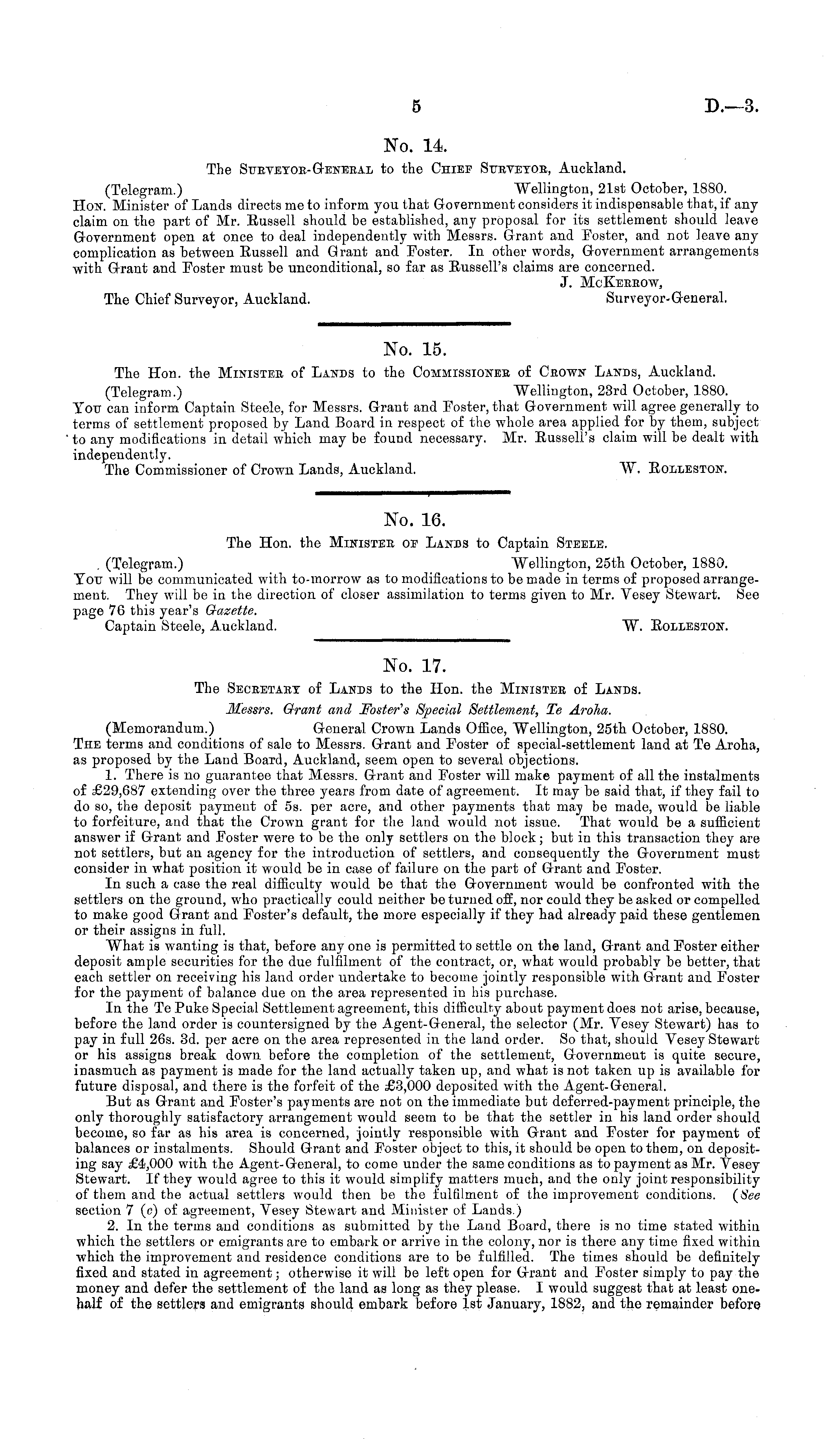 No. 14. The Surveyor-General to the Chief Surveyor, Auckland. (Telegram.) Wellington, 21st October, 1880. Hon. Minister of Lands directs me to inform you that Government considers it indispensable that, if any claim on the part of Mr. Eussell should be established, any proposal for its settlement should leave Government open at once to deal independently with Messrs. Grant and Poster, and not leave any complication as between Eussell and Grant and Poster. In other words, Government arrangements with Grant and Foster must be unconditional, so far as Eussell's claims are concerned. J. McKerrow, The Chief Surveyor, Auckland. Surveyor-General.