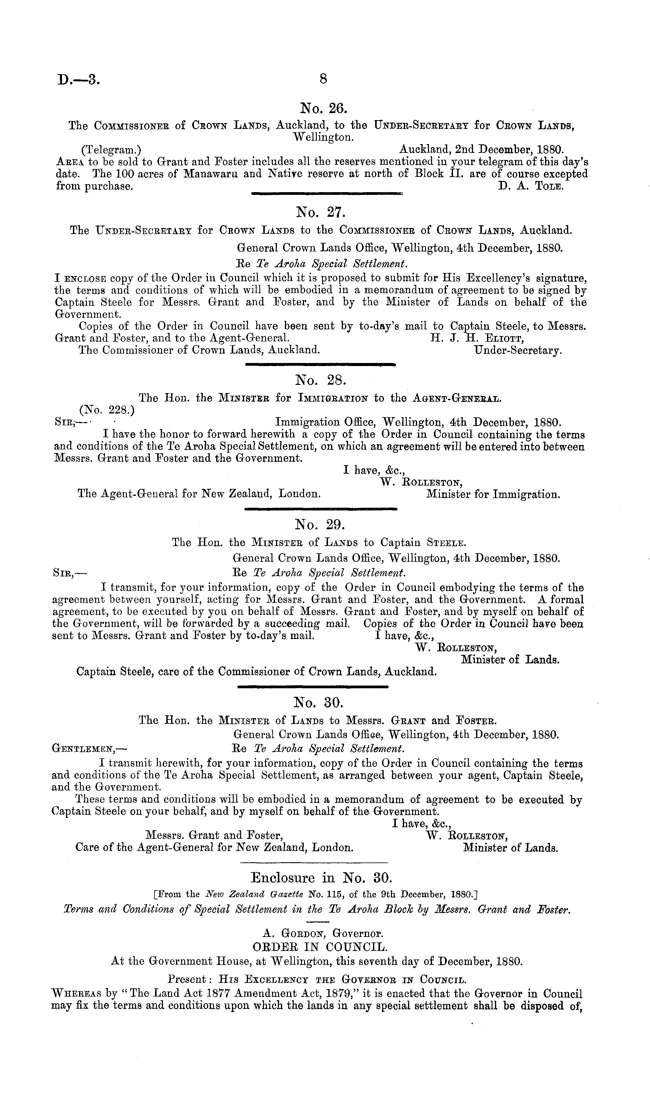 No. 30. The Hon. the Minister of Lands to Messrs. Grant and Foster. General Crown Lands Offioe, Wellington, 4th December, 1880. Gentlemen, — Re Te Aroha Special Settlement. I transmit herewith, for your information, copy of the Order in Council containing the terms and conditions of the Te Aroha Special Settlement, as arranged between your agent, Captain Steele, and the Government. These terms and conditions will be embodied in a memorandum of agreement to be executed by Captain Steele on your behalf, and by myself on behalf of the Government. I have, &c, Messrs. Grant and Foster, W. Rolleston, Care of the Agent-General for New Zealand, London. Minister of Lands.