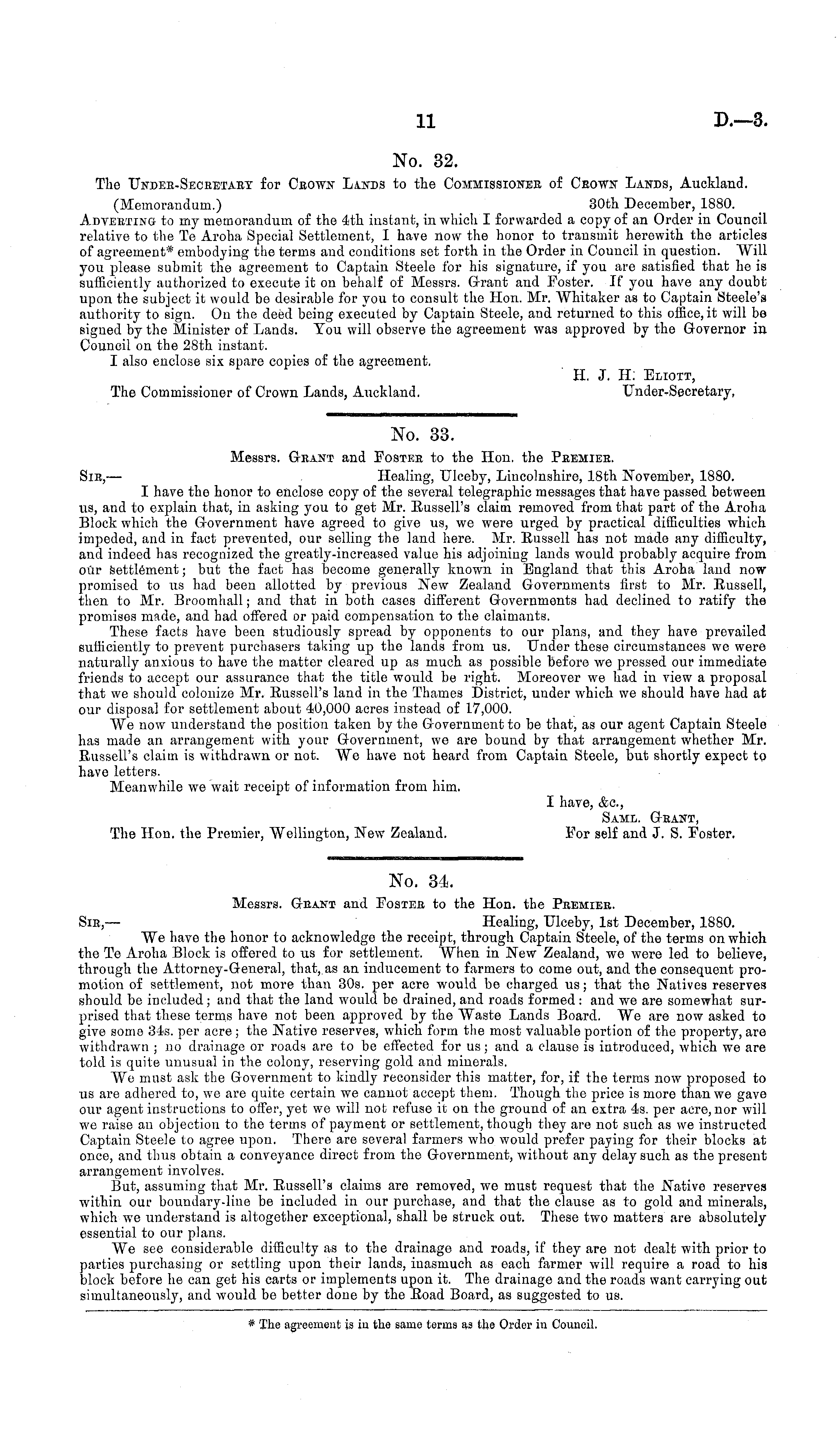 No. 34. Messrs. Grant and Poster to the Hon. the Premier, Sir, — Healing, Ulceby, Ist December, 1880. We have the honor to acknowledge the receipt, through Captain Steele, of the terms on which the Te Aroha Block is offered to us for settlement. When in New Zealand, we were led to believe, through the Attorney-General, that,.as an inducement to farmers to come out, and the consequent promotion of settlement, not more than 30s. per acre would be charged us; that the Natives reserves should be included; and that the land would be drained, and roads formed : and we are somewhat surprised that these terms have not been approved by the Waste Lands Board. We are now asked to give some 345. per acre ; the Native reserves, which form the most valuable portion of the property, are withdrawn ; no drainage or roads are to be effected for us; and a clause is introduced, which we are told is quite unusual in the colony, reserving gold and minerals. We must ask the Government to kindly reconsider this matter, for, if the terms now proposed to us are adhered to, we are quite certain we cannot accept them. Though the price is more than we gave our agent instructions to offer, yet we will not refuse it on the ground of an extra 4s. per acre, nor will we raise an objection to the terms of payment or settlement, though they are not such as we instructed Captain Steele to agree upon. There are several farmers who would prefer paying for their blocks at once, and thus obtain a conveyance direct from the Government, without any delay such as the present arrangement involves. But, assuming that Mr. Russell's claims are removed, we must request that the Native reserves within our boundary-line be included in our purchase, and that the clause as to gold and minerals, which we understand is altogether exceptional, shall be struck out. These two matters are absolutely essential to our plans. We see considerable difficulty as to the drainage and roads, if they are not dealt with prior to parties purchasing or settling upon their lands, inasmuch as each farmer will require a road to his block before he can get his carts or implements upon it. The drainage and the roads want carrying out simultaneously, and would be better done by the Road Board, as suggested to us.