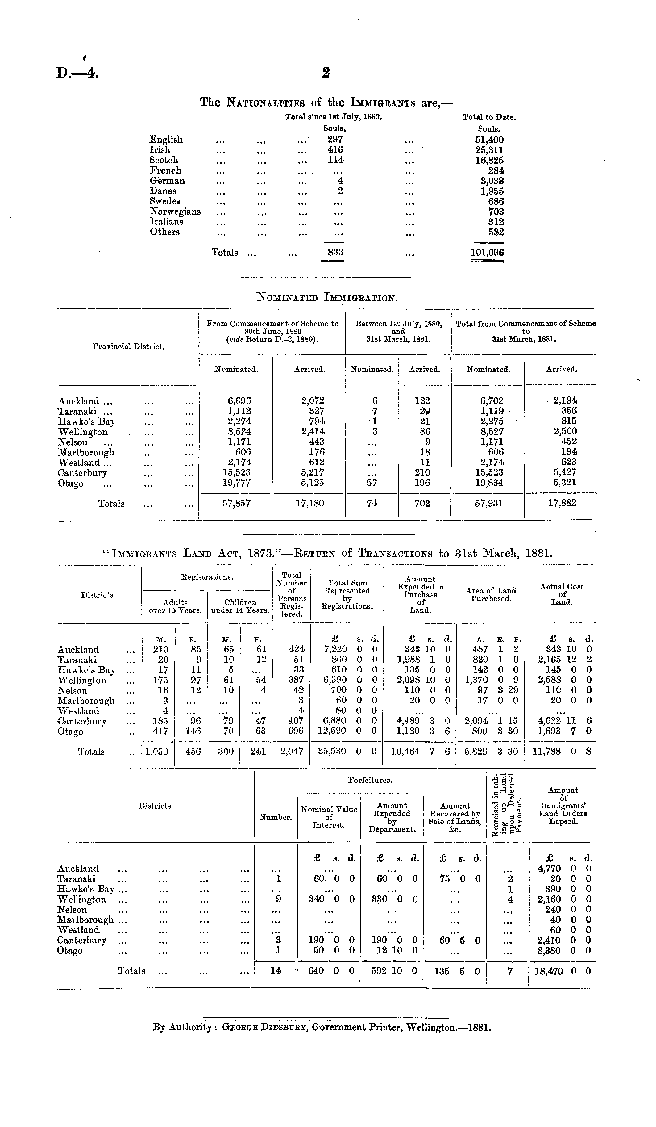 "Immigrants Land Act, 1873." —Return of Transactions to 31st March, 1881.