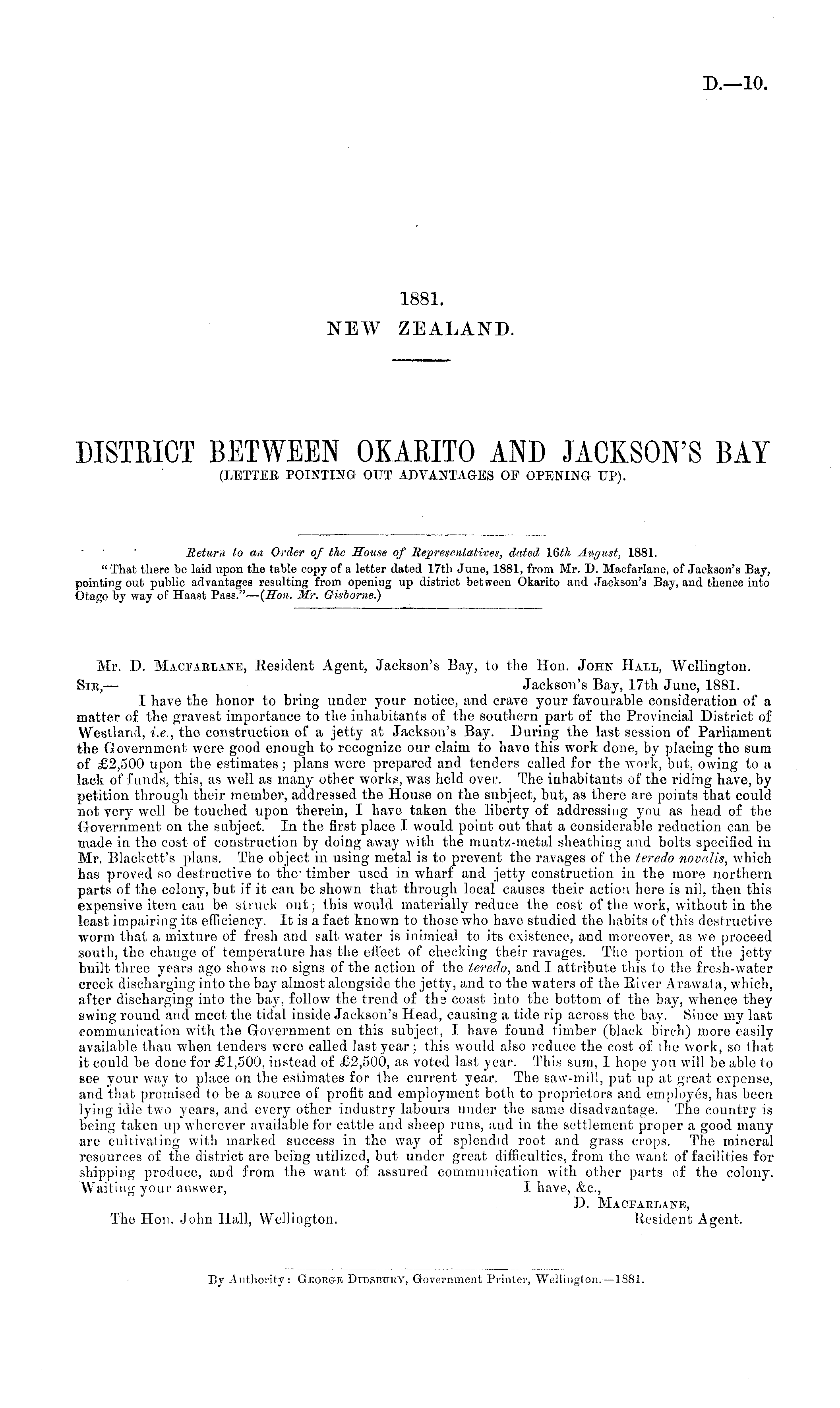Return to an Order of the Souse of Representatives, dated lGth August, 1881. " That there be laid upon the table copy of a letter dated 17th June, 1881, from Mr. D. Macfarlane, of Jackson's Bay, pointing out public advantages resulting from opening up district between Okarito and Jackson's Bay, and thence into Otago by way of Haast Pass."— (Hon. Mr. Gisborne.)