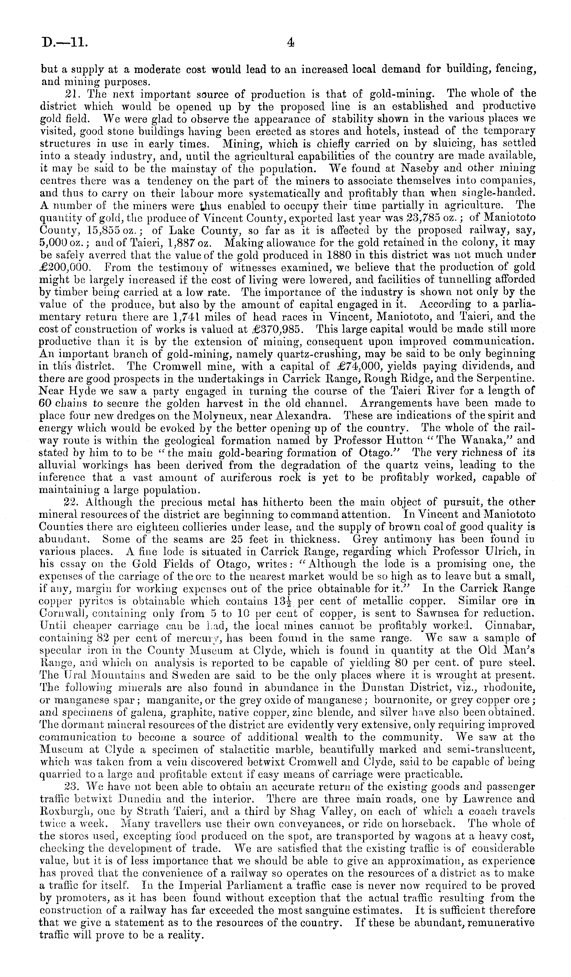 but a supply at a moderate cost would lead to an increased local demand for building, fencing, and mining purposes. 21. The next important source of production is that of gold-mining. The whole of the district which would be opened up by the proposed line is an established and productive gold field. We were glad to observe the appearance of stability shown in the various places we visited, good stone buildings having been erected as stores and hotels, instead of the temporary structures in use in early times. Mining, which is chiefly carried on by sluicing, has settled into a steady industry, and, until the agricultural capabilities of the country are made available, it may be said to be the mainstay of the population. We found at Naseby and other mining centres there was a tendency on the p;irt of the miners to associate themselves into companies, and thus to carry on their labour more systematically and profitably than when single-handed. A number of the miners were thus enabled to occupy their time partially in agriculture. The quantity of gold, the produce of Vincent County, exported last year was 23,785 oz.; of Maniototo County, 15,855 oz.; of Lake County, so far as it is affected by the proposed railway, say, 5,000 oz.; and of Taieri, 1,887 oz. Making allowance for the gold retained in the colony, it may be safely averred that the value of the gold produced in 1880 in this district was not much under £200,000. From the testimony of witnesses examined, we believe that the production of gold might be largely increased if the cost of living were lowered, and facilities of tunnelling afforded by timber being carried at a low rate. The importance of the industry is shown not only by the value of the produce, but also by the amount of capital engaged in it. According to a parliamentary return there are 1,741 miles of head races in Vincent, Maniototo, and Taieri, and the cost of construction of works is valued at £370,985. This large capital would be made still more productive than it is by the extension of mining, consequent upon improved communication. An important branch of gold-mining, namely quartz-crushing, may be said to be only beginning in this district. The Cromwell mine, with a capital of £74,000, yields paying dividends, and there are good prospects in the undertakings in Carrick Range, Rough Ridge, and the Serpentine. Near Hyde we saw a party engaged in turning the course of the Taieri River for a length of 60 chains to secure the golden harvest in the old channel. Arrangements have been made to place four new dredges on the Molyneux, near Alexandra. These are indications of the spirit and energy which would be evoked by the better opening up of the country. The whole of the railway route is within the geological formation named by Professor Hutton " The Wanaka," and stated by him to to be " the main gold-bearing formation of Otago." The very richness of its alluvial workings has been derived from the degradation of the quartz veins, leading to the inference that a vast amount of auriferous rock is yet to be profitably worked, capable of maintaining a large population. 22. Although the precious metal has hitherto been the main object of pursuit, the other mineral resources of the district are beginning to command attention. In Vincent and Maniototo Counties there are eighteen collieries under lease, and the supply of brown coal of good quality is abundant. Some of the seams arc 25 feet in thickness. Grey antimony has been found in various places. A fine lode is situated in Carrick Range, regarding which Professor Ulrich, in his essay on the Gold Fields of Otago, writes: " Although the lode is a promising one, the expenses of the carriage of the ore to the nearest market would be so high as to leave but a small, if any, margin for working expenses out of the price obtainable for it." In the Carrick Range copper pyrites is obtainable which contains 13^ per cent of metallic copper. Similar ore in Cornwall, containing only from 5 to 10 per cent of copper, is sent to Sawnsea for reduction. Until cheaper carriage can be Lad, the local mines cannot be profitably worked. Cinnabar, containing 82 per cent of mercury, has been found in the same range. We saw a sample of specular iron in the County Museum at Clyde, which is found in quantity at the Old Man's Range, and which on analysis is reported to be capable of yielding 80 per cent, of pure steel. The Ural Mountains and Sweden are said, to be the only places where it is wrought at present. The following minerals are also found in abundance in the Dunstan District, viz., rhodonite, or manganese spar; manganite, or the grey oxide of manganese; bournonite, or grey copper ore; and specimens of galena, graphite, native copper, zinc blende, and silver have also been obtained. The dormant mineral resources of the district are evidently very extensive, only requiring improved communication to become a source of additional wealth to the community. We saw at the Museum at Clyde a specimen of stalactitic marble, beautifully marked and semi-translucent, which was taken from a vein discovered betwixt Cromwell and Clyde, said to be capable of being quarried to a large and profitable extent if easy means of carriage were practicable. 23. We have not been able to obtain an accurate return of the existing goods and passenger traffic betwixt Dunedin and the interior. There are three main roads, one by Lawrence and Roxburgh, one by Strath Taieri, and a third by Shag Valley, on each of which a coach travels twice a week. Many travellers use their own conveyances, or ride on horseback. The whole of the stores used, excepting food produced on the spot, are transported by wagons at a heavy cost, checking the development of trade. We are satisfied that the existing traffic is of considerable value, but it is of less importance that we should be able to give an approximation, as experience has proved that the convenience of a railway so operates on the re