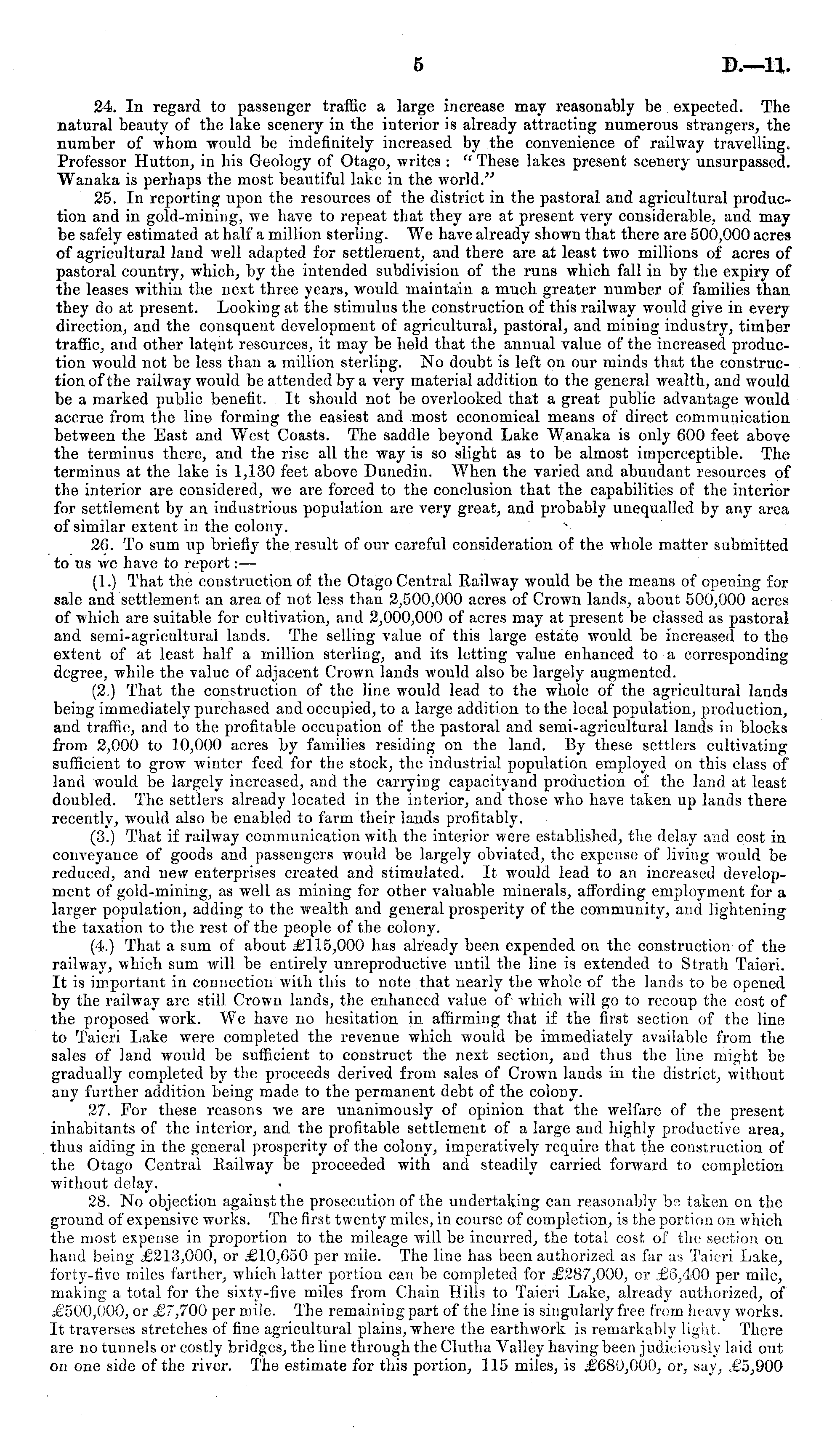 24. In regard to passenger traffic a large increase may reasonably be expected. The natural beauty of the lake scenery in the interior is already attracting numerous strangers, the number of whom would be indefinitely increased by the convenience of railway travelling. Professor Hutton, in his Geology of Otago, writes : " These lakes present scenery unsurpassed. Wanaka is perhaps the most beautiful lake in the world." 25. In reporting upon the resources of the district in the pastoral and agricultural production and in gold-mining, we have to repeat that they are at present very considerable, and may be safely estimated at half a million sterling. We have already shown that there are 500,000 acres of agricultural land well adapted for settlement, and there are at least two millions of acres of pastoral country, which, by the intended subdivision of the runs which fall in by the expiry of the leases within the next three years, would maintain a much greater number of families than they do at present. Looking at the stimulus the construction of this railway would give in every direction, and the consquent development of agricultural, pastoral, and mining industry, timber traffic, and other latent resources, it may be held that the annual value of the increased production would not be less than a million sterling. No doubt is left on our minds that the construction of the railway would be attended by a very material addition to the general wealth, and would be a marked public benefit. It should not be overlooked that a great public advantage would accrue from the line forming the easiest and most economical means of direct communication between the East and West Coasts. The saddle beyond Lake Wanaka is only 600 feet above the terminus there, and the rise all the way is so slight as to be almost imperceptible. The terminus at the lake is 1,130 feet above Dunedin. When the varied and abundant resources of the interior are considered, we are forced to the conclusion that the capabilities of the interior for settlement by an industrious population are very great, and probably unequalled by any area of similar extent in the colony. 26. To sum up briefly the result of our careful consideration of the whole matter submitted to us we have to report:— (1.) That the construction of the Otago Central Railway would be the means of opening for sale and settlement an area of not less than 2,500,000 acres of Crown lands, about 500,000 acres of which are suitable for cultivation, and 2,000,000 of acres may at present be classed as pastoral and semi-agricultural lands. The selling value of this large estate would be increased to the extent of at least half a million sterling, and its letting value enhanced to a corresponding degree, while the value of adjacent Crown lands would also be largely augmented. (2.) That the construction of the line would lead to the whole of the agricultural lands being immediately purchased and occupied, to a large addition to the local population, production, and traffic, and to the profitable occupation of the pastoral and semi-agricultural lands in blocks from 2,000 to 10,000 acres by families residing on the land. By these settlers cultivating sufficient to grow winter feed for the stock, the industrial population employed on this class of land would be largely increased, and the carrying capacityand production of the land at least doubled. The settlers already located in the interior, and those who have taken up lands there recently, would also be enabled to farm their lands profitably. (3.) That if railway communication with the interior were established, the delay and cost in conveyance of goods and passengers would be largely obviated, the expense of living would be reduced, and new enterprises created and stimulated. It would lead to an increased development of gold-mining, as well as mining for other valuable minerals, affording employment for a larger population, adding to the wealth and general prosperity of the community, and lightening the taxation to the rest of the people of the colony. (4.) That a sum of about £115,000 has already been expended on the construction of the railway, which sum will, be entirely unreproductive until the line is extended to Strath Taieri. It is important in connection with this to note that nearly the whole of the lands to be opened by the railway are still Crown lands, the enhanced value of which will go to recoup the cost of the proposed work. We have no hesitation in affirming that if the first section of the line to Taieri Lake were completed the revenue which would be immediately available from the sales of land would be sufficient to construct the next section, and thus the line might be gradually completed by the proceeds derived from sales of Crown lands in the district, without any further addition being made to the permanent debt of the colony. 27. For these reasons we are unanimously of opinion that the welfare of the present inhabitants of the interior, and the profitable settlement of a large and highly productive area, thus aiding in the general prosperity of the colony, imperatively require that the construction of the Otago Central Railway be proceeded with and steadily carried forward to completion without delay. 28. No objection against the prosecution of the undertaking can reasonably be taken on the ground of expensive works. The first twenty miles, in course of completion, is the portion on which the most expense in proportion to the mileage will be incurred, the total cost of the section on hand being €213,000, or €10,650 per mile. The line has been authorized as far as Taieri Lake, forty-five miles farther, which latter portion can be completed for €287,000, or €6,400 per mile, making a total for the sixty-five miles from Chain Hills to Taieri Lake, already authorized, of €500,000, or €7,700 per mile. The remaining part of the line is singularly free from heavy works. It traverses stretches of fin