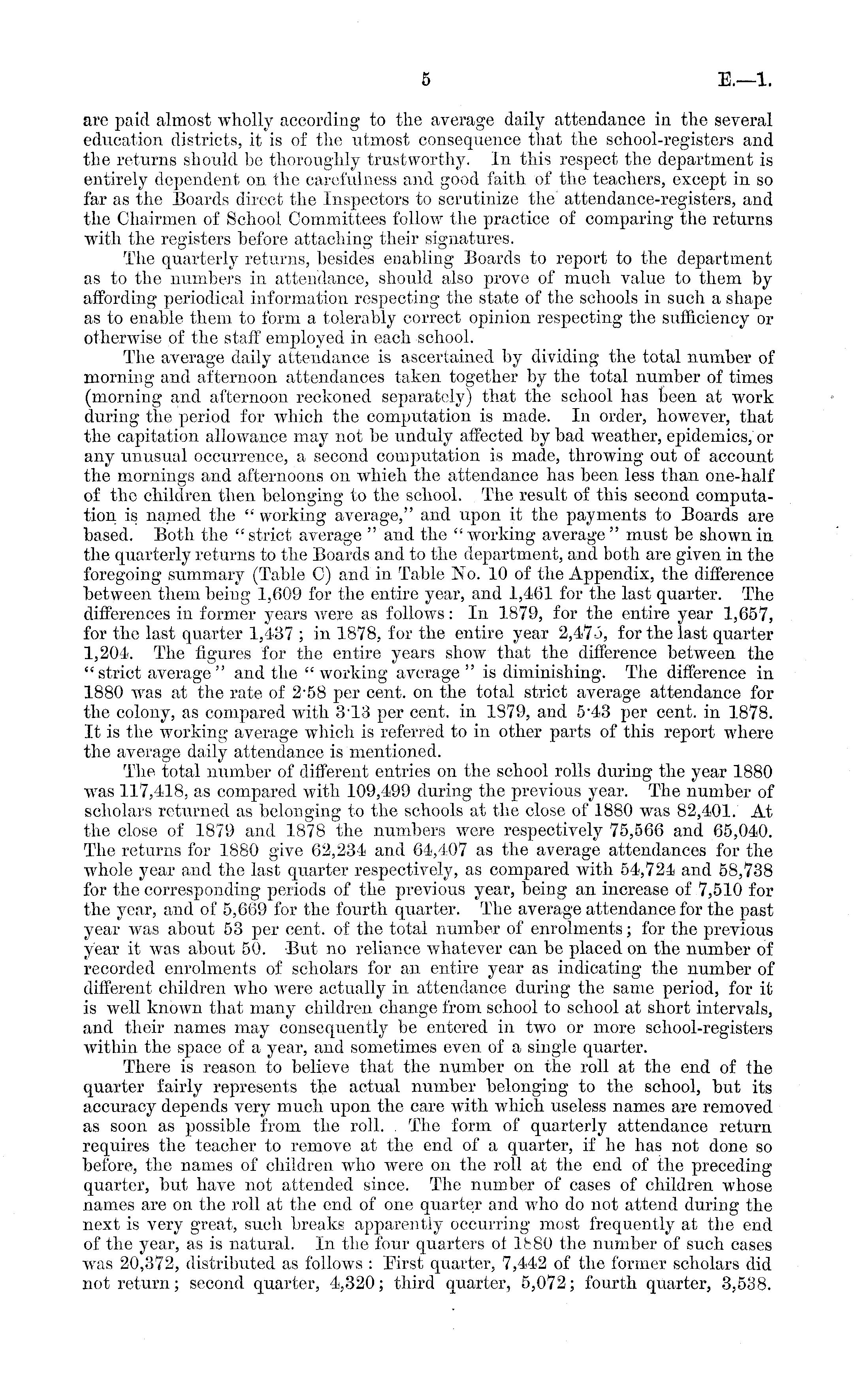 arc paid almost wholly according to the average daily attendance in the several education districts, it is of the utmost consequence that the school-registers and the returns should be thoroughly trustworthy. In this respect the department is entirely dependent on the carefulness and good faith of the teachers, except in so far as the Boards direct the Inspectors to scrutinize the attendance-registers, and the Chairmen of School Committees follow the practice of comparing the returns with the registers before attaching their signatures. The quarterly returns, besides enabling Boards to report to the department as to the numbers in attendance, should also prove of much value to them by affording periodical information respecting the state of the schools in such a shape as to enable them to form a tolerably correct opinion respecting the sufficiency or otherwise of the staff employed in each school. The average daily attendance is ascertained by dividing the total number of morning and afternoon attendances taken together by the total number of times (morning and afternoon reckoned separately) that the school has been at work during the period for which the computation is made. In order, however, that the capitation allowance may not be unduly affected by bad weather, epidemics, or any unusual occurrence, a second computation is made, throwing out of account the mornings and afternoons on which the attendance has been less than one-half of the children then belonging to the school. The result of this second computation is named the " working average," and upon it the payments to Boards are based. Both the " strict average " and the " working average " must be shown in the quarterly returns to the Boards and to the department, and both are given in the foregoing summary (Table C) and in Table No. 10 of the Appendix, the difference between them being 1,609 for the entire year, and 1,461 for the last quarter. The differences in former years were as follows: In 1879, for the entire year 1,657, for the last quarter 1,437 ; in 1878, for the entire year 2,47-3, for the last quarter 1,204. The figures for the entire years show that the difference between the "strict average" and the "working average" is diminishing. The difference in 1880 was at the rate of 2-58 per cent, on the total strict average attendance for the colony, as compared with 313 per cent, in 1579, and 5-43 per cent, in 1878. It is the working average which is referred to in other parts of this report where the average daily attendance is mentioned. The total number of different entries on the school rolls during the year 1880 was 117,418, as compared with 109,499 during the previous year. The number of scholars returned as belonging to the schools at the close of 1880 was 82,401. At the close of 1879 and 1878 the numbers were respectively 75,566 and 65,040. The returns for 1880 give 62,234 and 64,407 as the average attendances for the whole year and the last quarter respectively, as compared with 54,724 and 58,738 for the corresponding periods of the previous year, being an increase of 7,510 for the year, and of 5,669 for the fourth quarter. The average attendance for the past year was about 53 per cent, of the total number of enrolments; for the previous year it was' about 50. But no reliance whatever can be placed on the number of recorded enrolments of scholars for an entire year as indicating the number of different children who were actually in attendance during the same period, for it is well known that many children change from school to school at short intervals, and their names may consequently be entered in two or more school-registers within the space of a year, and sometimes even of a single quarter. There is reason to believe that the number on the roll at the end of the quarter fairly represents the actual number belonging to the school, but its accuracy depends very much upon the care with which useless names are removed as soon as possible from the roll. The form of quarterly attendance return requires the teacher to remove at the end of a quarter, if he has not done so before, the names of children who were on the roll at the end of the preceding quarter, but have not attended since. The number of cases of children whose names are on the roll at the end of one quarter and who do not attend during the next is very great, such breaks apparently occurring most frequently at the end of the year, as is natural. In the four quarters of lhßo the number of such cases was 20,372, distributed as follows : First quarter, 7,442 of the former scholars did not return; second quarter, 4,320; third quarter, 5,072; fourth quarter, 3,538.
