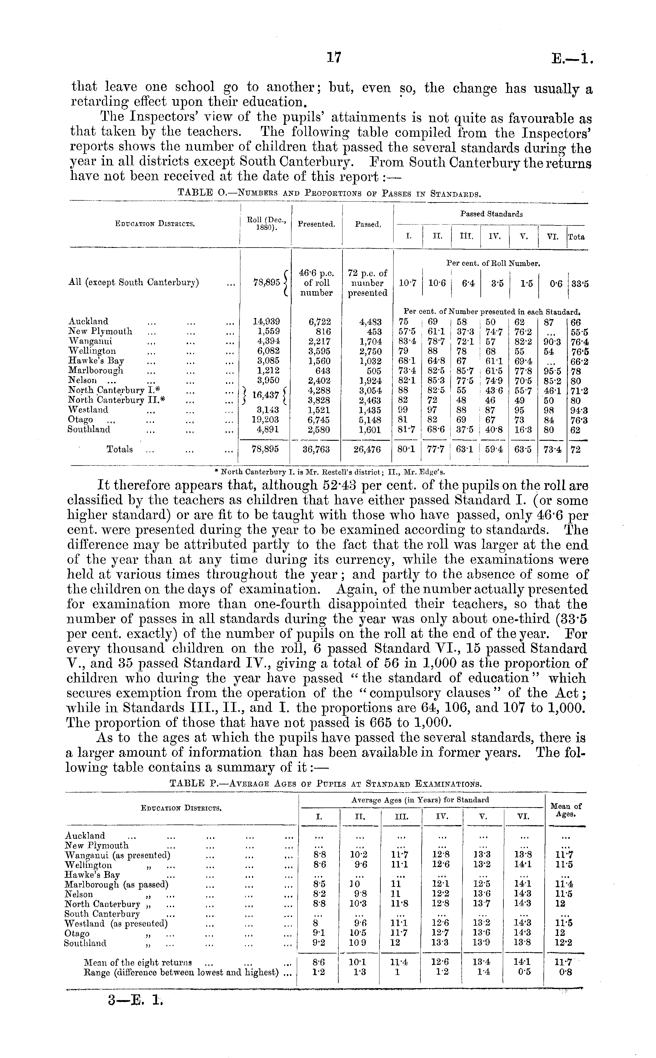 that leave one school go to another; but, even so, the change has usually a retarding effect upon their education. The Inspectors' view of the pupils' attainments is not quite as favourable as that taken by the teachers. The following table compiled from the Inspectors' reports shows the number of children that passed the several standards during the year in all districts except South Canterbury. Erom South Canterbury the returns have not been received at the date of this report:—