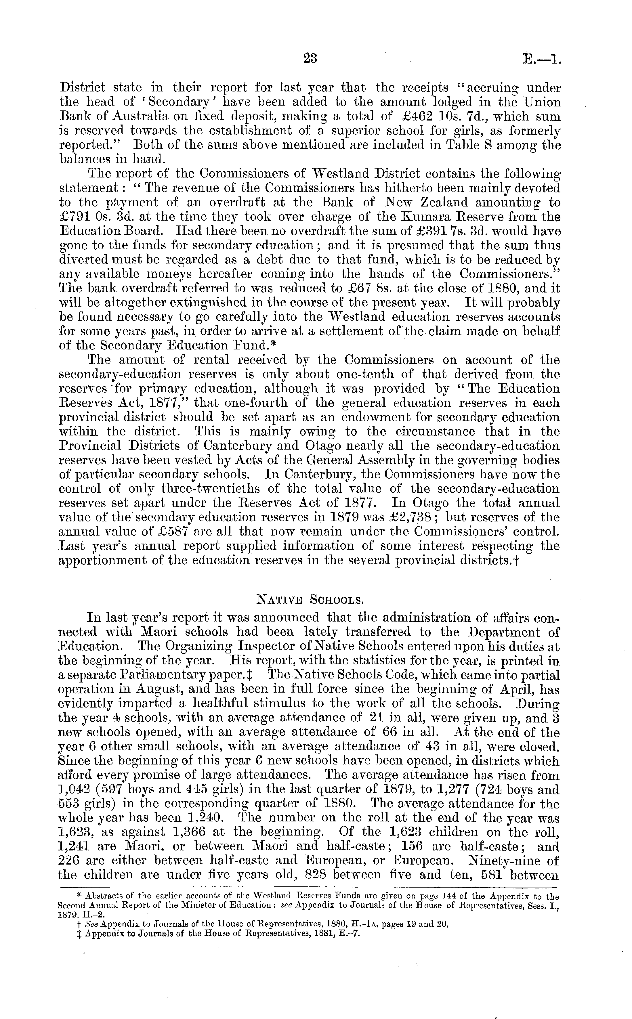 * Abstracts of the earlier accounts of the Westland Reserves Funds are given on page 144 of the Appendix to the Second Annual Report of the Minister of Education : see Appendix to Journals of the House of Representatives, Sess. I 1879, H.-2. t See Appendix to Journals of the House of Representatives, 1880, H.-la, pages 19 and 20. j Appendix to Journals of the House of Representatives, 1881, E.-7.