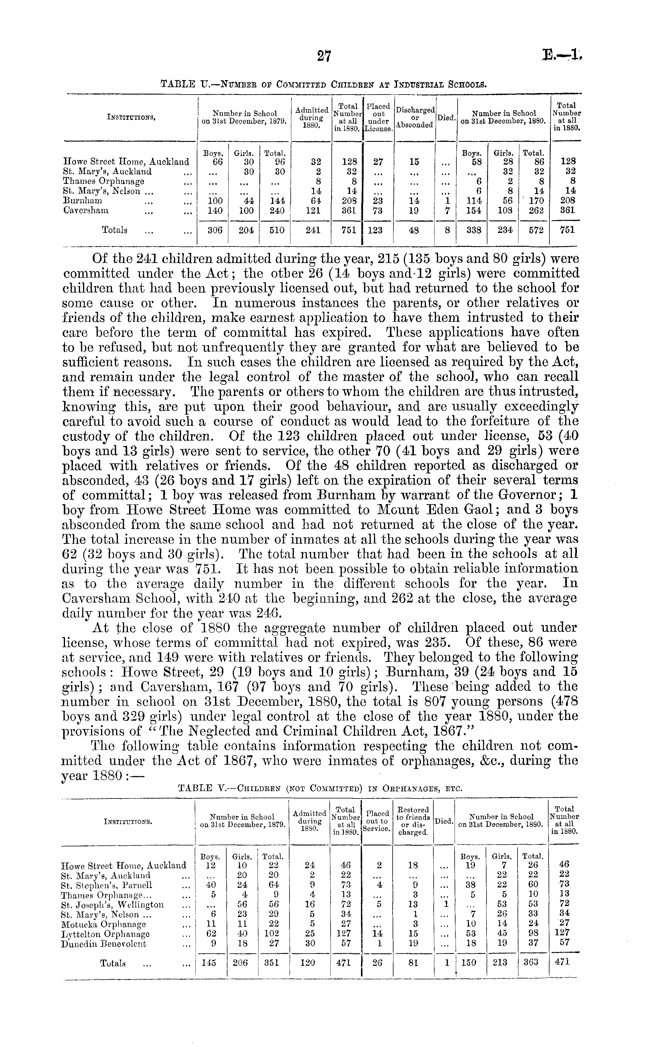 Of the 241 children admitted during the year, 215 (135 boys and 80 girls) were committed under the Act; the other 26 (14 boys and-12 girls) were committed children that had been previously licensed out, but had returned to the school for some cause or other. In numerous instances the parents, or other relatives or friends of the children, make earnest application to have them intrusted to their care before the term of committal has expired. These applications have often to be refused, but not unfrequently they are granted for what are believed to be sufficient reasons. In such cases the children are licensed as required by the Act, and remain under the legal control of the master of the school, who can recall them if necessary. The parents or others to whom the children are thus intrusted, knowing this, are put upon their good behaviour, and are usually exceedingly careful to avoid such a course of conduct as would lead to the forfeiture of the custody of the children. Of the 123 children placed out under license, 53 (40 boys and 13 girls) were sent to service, the other 70 (41 boys and 29 girls) were placed with relatives or friends. Of the 48 children reported as discharged or absconded, 43 (26 boys and 17 girls) left on the expiration of their several terms of committal; 1 boy Avas released from Burnham by Avarrant of the Governor; 1 boy from HoAve Street Home was committed to Mount Eden Gaol; and 3 boys absconded from the same school and had not returned at the close of the year. The total increase in the number of inmates at all the schools during the year was 62 (32 boys and 30 girls). The total number that had been in the schools at all during the year was 751. It has not been possible to obtain reliable information as to the average daily number in the different schools for the year. In Caversham School, Avith 240 at the beginning, and 262 at the close, the average daily number for the year was 246. At the close of 1880 the aggregate number of children placed out under license, whose terms of committal had not expired, was 235. Of these, 86 were at service, and 149 were with relatiA res or friends. They belonged to the following schools : Howe Street, 29 (19 boys and 10 girls); Burnham, 39 (24 boys and 15 girls); and Caversham, 167 (97 boys and 70 girls). These being added to the number in school on 31st December, 1880, the total is 807 young persons (478 boys and 329 girls) under legal control at the close of the year 1880, under the provisions of "The Neglected and Criminal Children Act, 1867." The following table contains information respecting the children not committed under the Act of 1867, who were inmates of orphanages, &c, during the year 1880:—