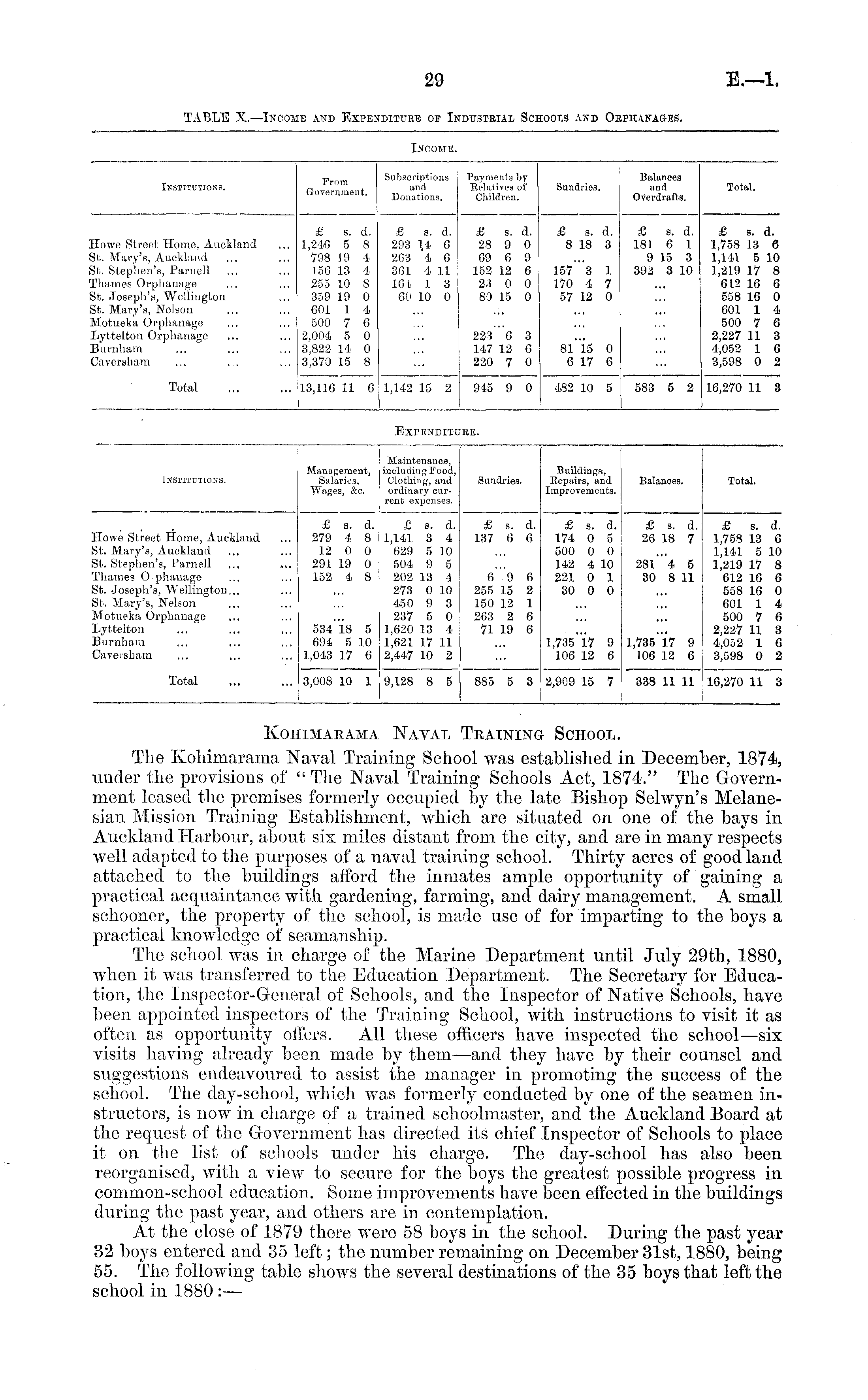 KOHIMARAMA NAVAL TRAINING SCHOOL. The Kohimarama Naval Training School was established in December, 1874, under the provisions of "The Naval Training Schools Act, 1874." The Government leased the premises formerly occupied by the late Bishop Sehvyn's Melanesian Mission Training Establishment, Avhich are situated on one of the bays in Auckland Harbour, about six miles distant from the city, and are in many respects well adapted to the purposes of a naval training school. Thirty acres of good land attached to the buildings afford the inmates ample opportunity of gaining a practical acquaintance with gardening, farming, and dairy management. A small schooner, the property of the school, is made use of for imparting to the boys a practical knowledge of seamanship. The school Avas in charge of the Marine Department until July 29th, 1880, when it was transferred to the Education Department. The Secretary for Education, the Inspector-General of Schools, and the Inspector of Native Schools, have been appointed inspectors of the Training School, with instructions to visit it as often as opportunity offers. All these officers have inspected the school—six visits having already been made by them —and they have by their counsel and suggestions endeavoured to assist the manager in promoting the success of the school. The day-school, which was formerly conducted by one of the seamen instructors, is noAv in charge of a trained schoolmaster, and the Auckland Board at the request of the Government has directed its chief Inspector of Schools to place it on the list of schools under his charge. The day-school has also been reorganised, with a view to secure for the boys the greatest possible progress in common-school education. Some improvements have been effected in the buildings during the past year, and others are in contemplation. At the close of 1879 there were 58 boys in the school. During the past year 32 boys entered and 35 left; the number remaining on December 31st, 1880, being 55. The following table shoAVs the several destinations of the 35 boys that left the school in 1880:—