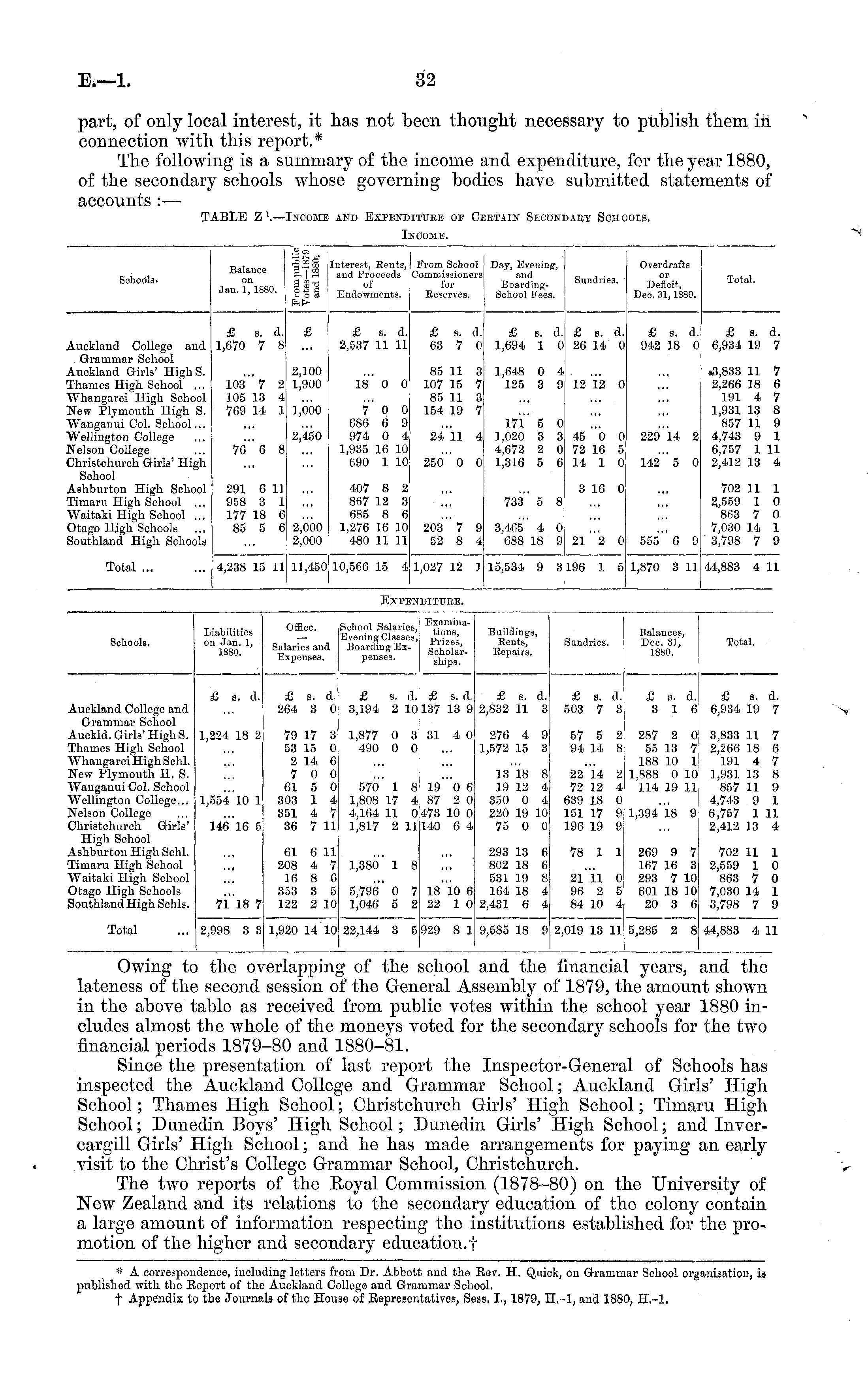 Owing to the overlapping of the school and the financial years, and the lateness of the second session of the General Assembly of 1879, the amount shown in the above table as received from public votes within the school year 1880 includes almost the whole of the moneys voted for the secondary schools for the two financial periods 1879-80 and 1880-81. Since the presentation of last report the Inspector-General of Schools has inspected the Auckland College and Grammar School; Auckland Girls' High School; Thames High School; Christchurch Girls' High School; Timaru High School; Dunedin Boys' High School; Dunedin Girls' High School; and Invercargill Girls' High School; and he has made arrangements for paying an early visit to the Christ's College Grammar School, Christchurch. The two reports of the Royal Commission (1878-80) on the University of New Zealand and its relations to the secondary education of the colony contain a large amount of information respecting the institutions established for the promotion of the higher and secondary education.f