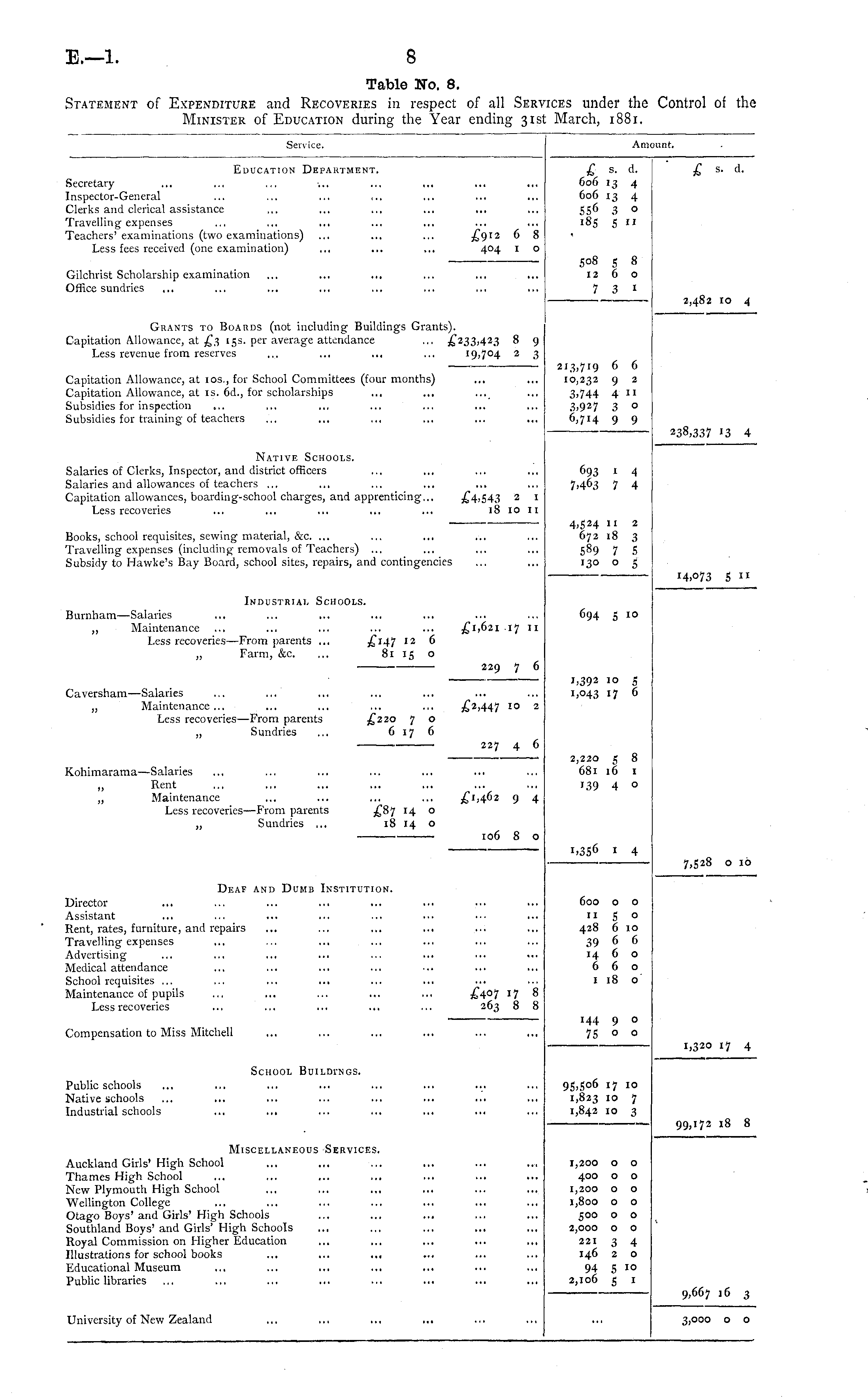 Table No. 8. Statement of Expenditure and Recoveries in respect of all Services under the Control of the Minister of Education during the Year ending 31st March, 1881.