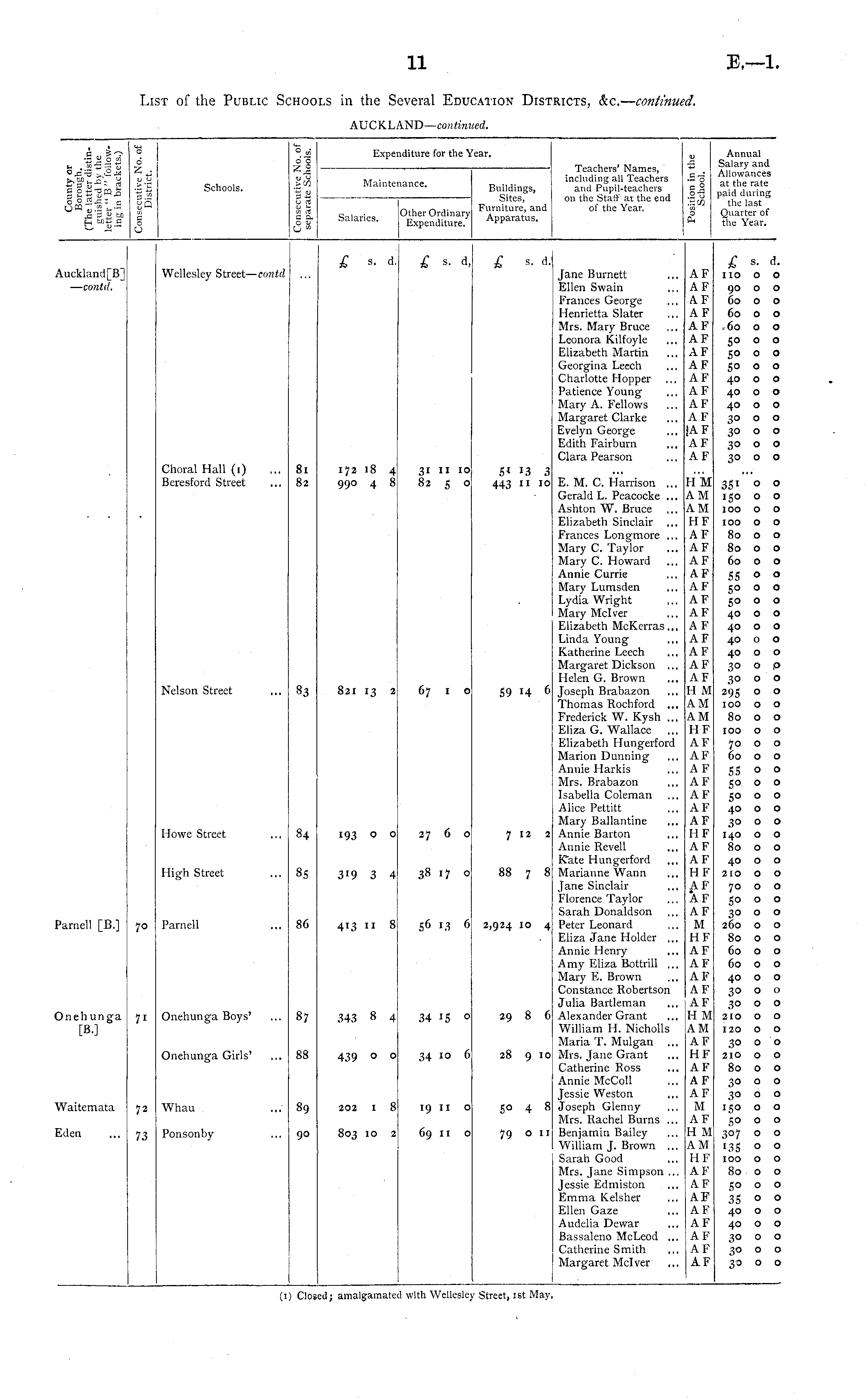 c |s c o o Schools. 6 ~o c a. o u Maintenance. Expenditure for the 'ear. Buildings, Sites, Furniture, and Apparatus, Teachers' Names, including all Teachers and Pupil-teachers on the Staff at the end of the Year, ■So' q ° o -g Sot Annual Salary and Allowances at the rate paid during the last Quarter of the Year. Salaries. Other Ordinary Expenditure. 1 £ s. d, £ B. d, £ s. d. £ s. d. no o o 90 o o 60 o o 60 o o 60 o o 50 o o 50 o o SO O O 40 o o 40 o o 40 o o 30 o o ,30 o o 30 o o 30 o o Auckland [B] — contd. Wellesley Street— contd Jane Burnett Ellen Swain Frances George Henrietta Slater Mrs. Mary Bruce Leonora Kilfoyle Elizabeth Martin Georgina Leech Charlotte Hopper Patience Young Mary A. Fellows Margaret Clarke Evelyn George Edith Fairburn Clara Pearson AF AF AF AF AF AF AF AF AF AF AF AF |AF AF AF Choral Hall (1) Beresford Street 8i 82 172 18 4 990 4 8 31 11 10 82 5 o 5' J3 3 443 11 IO E. M. C. Harrison ... Gerald L. Peacocke ... Ashton W. Bruce Elizabeth Sinclair Frances Longmore ... Mary C. Taylor Mary C. Howard Annie Currie Mary Lumsden Lydia Wright Mary Mclver Elizabeth McKerras... Linda Young Katherine Leech Margaret Dickson ... Helen G. Brown Joseph Brabazon ... Thomas Rochford ... Frederick W. Kysh ... Eliza G. Wallace ... Elizabeth Hungerford Marion Dunning Annie Harkis Mrs. Brabazon Isabella Coleman Alice Pettitt Mary Ballantine Annie Barton Annie Revell Kate Hungerford Marianne Wann Jane Sinclair Florence Taylor Sarah Donaldson Peter Leonard Eliza Jane Holder ,.. Annie Henry Amy Eliza Bottrill ... Mary E. Brown Constance Robertson Julia Bartleman Alexander Grant William H. Nicholls Maria T. Mulgan ... Mrs. Jane Grant Catherine Ross Annie McColl Jessie Weston Joseph Glenny Mrs. Rachel Burns ... Benjamin Bailey William J. Brown ... Sarah Good Mrs. Jane Simpson ... Jessie Edmiston Emma Kelsher Ellen Gaze Audelia Dewar Bassaleno McLeod ... Catherine Smith Margaret Mclver HM AM AM HF AF AF AF AF AF AF AF AF AF AF AF AF H M AM AM HF AF AF AF AF AF AF AF HF AF AF HF AF AF AF M HF AF AF AF AF AF H M AM AF HF AF AF AF M AF H M AM HF AF AF AF AF AF AF AF AF 351 ° o 150 o o 100 o o 100 o o 80 o o 80 o o 60 o o 55 o ° 50 o o 50 o o 40 o o 40 o o 40 o o 40 o o 30 o o 30 o o 295 o o 100 00 80 o o 100 o o 70 o o 60 o o 55 o o 50 o o 50 o o 40 o o 30 o o 140 o o 80 o o Nelson Street 83 821 13 2 67 1 o 59 14 6 Howe Street 84 193 ° ° 27 6 o 7 12 2 High Street 85 319 3 4 38 17 o 88 7 8 40 o o 210 o o 70 o o So o o 30 o o 260 o o 80 o o 60 o o 60 o o 40 o o 30 o o 30 o o 210 o o 120 O O Parnell 413 11 8 S 6 M 6 2,924 10 4 Parnell [B.] 7° 86 Onehunga Boys' Onehunga [B.] 7 1 87 343 8 4 34 IS ° 29 8 6 Onehunga Girls' 88 439 o ° 34 Io 6 28 9 10 30 o o 210 o o 80 o o 30 o o 30 o o 150 o o 50 o o 307 o o 13s ° ° 100 o o 80 o o Whau 202 I 8 19 11 o 50 4 8 Waitemata ;2 89 Eden 73 Ponsonby 90 803 IO 2 69 11 o 79 o 11 5° o ° 35 ° ° 40 o o 40 o o 30 o o 30 o o 30 o o (1) Closcdj amalgamated with Wellesley Street, 1st May.