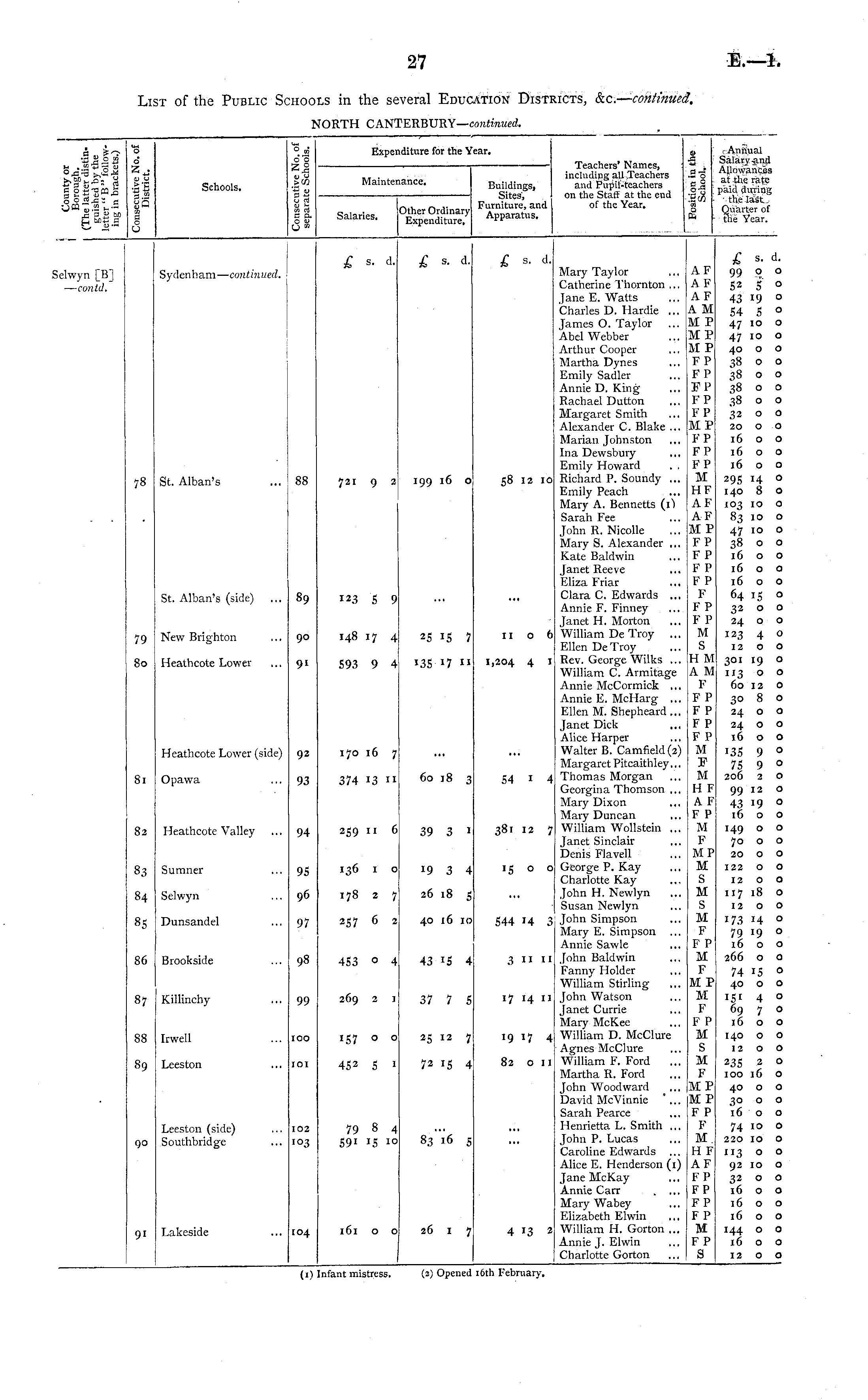 6*1 ■- 5 Schools, "8 » o"o 2| "03 8% Maintenance. Expenditure for the Year. :ar. Teachers' Names, including all Teachers Buildings, and Pupil-teachers Sites, on the Staff at the end Furniture, and of the Year. Apparatus, a, Annual •g Salary and a —' Allowances 'I o at the rate o-g paid during 2 W - the last o Quarter of the Year. Salaries. Other Ordinarj Expenditure. ielwyn [B] — contd. 78 79 So Sydenham— continued. St. Alban's St. Alban's (side) New Brighton Heathcote Lower 88 89 90 91 721 123 5 9 148 17 4 593 9 4 £ s. d. 9 2 199 16 o 25 IS 7 135 17 " £ s. d. n o 6 1,204 4 1 £ *. <i 58 12 10 Mary Taylor Catherine Thornton ... Jane E. Watts Charles D. Hardie ... James O. Taylor Abel Webber Arthur Cooper Martha Dynes Emily Sadler Annie D. King Rachael Dutton Margaret Smith Alexander C. Blake ... Marian Johnston Ina Dewsbury Emily Howard . . Richard P. Soundy ... Emily Peach Mary A. Bennetts (1) Sarah Fee John R. Nicolle Mary S. Alexander ,., Kate Baldwin Janet Reeve Eliza Friar Clara C. Edwards ... Annie F. Finney Janet H. Morton William De Troy ... Ellen De Troy Rev. George Wilks ... William C. Armitage Annie McCormick ... Annie E. McHarg ... Ellen M. Shepheard ... Janet Dick Alice Harper Walter B. Camfield (2) Margaret Pitcaithley... Thomas Morgan Georgina Thomson ... Mary Dixon Mary Duncan William Wollstein ... Janet Sinclair Denis Flavell George P. Kay Charlotte Kay John H. Newlyn Susan Newlyn John Simpson Mary E. Simpson Annie Sawle John Baldwin Fanny Holder William Stirling John Watson Janet Currie Mary McKee William D. McClure Agnes McClure William F. Ford ... Martha R. Ford John Woodward David McVinnie Sarah Pearce Henrietta L. Smith ... John P. Lucas Caroline Edwards ... Alice E. Henderson (1) Jane McKay Annie Carr Mary Wabey Elizabeth Elwin William H. Gorton ... Annie J. Elwin Charlotte Gorton AF AF AF A M M P MP MP FP FP FP FP FP MP FP FP FP M HF AF AF MP FP FP F P FP F F P FP M S H M A M F FP F P FP FP M B 1 M H F A F F P M F MP M S M S M F F P M F M P M F F P M s M F MP |M P F P F M H F AF FP FP FP FP M F P s £ s. d. 99 9 ° 52 5 ° 4319 ° 54 5 ° 47 10 o 47 10 o 40 o o 38 o o 38 o o 38 o o 38 o o 32 o o 20 o o 1600 1600 1600 29s 14 ° 140 8 o 103 10 o 83 10 o 47 1° ° 38 o o 1600 1600 16 o o 64 15 o 32 o o 24 o o 123 4 o 1200 301 19 o 113 o o 60 12 O 30 8 o 24 o o 24 o o 16 o o 135 9 ° 75 9 ° 206 2 o 99 12 o 43 19 ° [600 149 o o 70 o o 20 O O 122 O O I2OO 117 18 o 1200 173 14 ° 79 19 ° 1600 266 o o 74 15 ° 40 o o 151 4 o 69 7 o 1600 140 o o 12 O O 235 2 O 100 16 o Heathcote Lower (side) 'P 170 16 7 81 Opawa 93 374 13 I' 60 18 3 54 1 4 82 Heathcote Valley 259 11 6 39 3 1 381 12 7 94 33 Sumner 136 1 o 19 3 4 '5 o o 95 84 Selwyn 96 178 2 7 26 18 5 85 Dunsandel 97 257 6 2 40 16 10 544 14 3 86 Brookside 98 453 o 4 43 '5 4 3 " II 87 Killinchy 99 269 2 1 37 7 5 17 14 11 88 Irwell 157 o o 25 12 7 19 17 4 100 89 Leeston 101 45 2 5 > 72 15 4 82 on 90 Leeston (side) Southbridge 102 103 79 8 4 59 1 15 I0 83 16 S 40 o o 30 o o 1600 74 10 o 220 10 o 113 o o 92 10 o 32 o o 1600 1600 1600 144 o o 1600 1200 Lakeside 91 104 161 o o 26 1 1 4 13 2 (1) Infant mistress. (2) Opened 16th February,