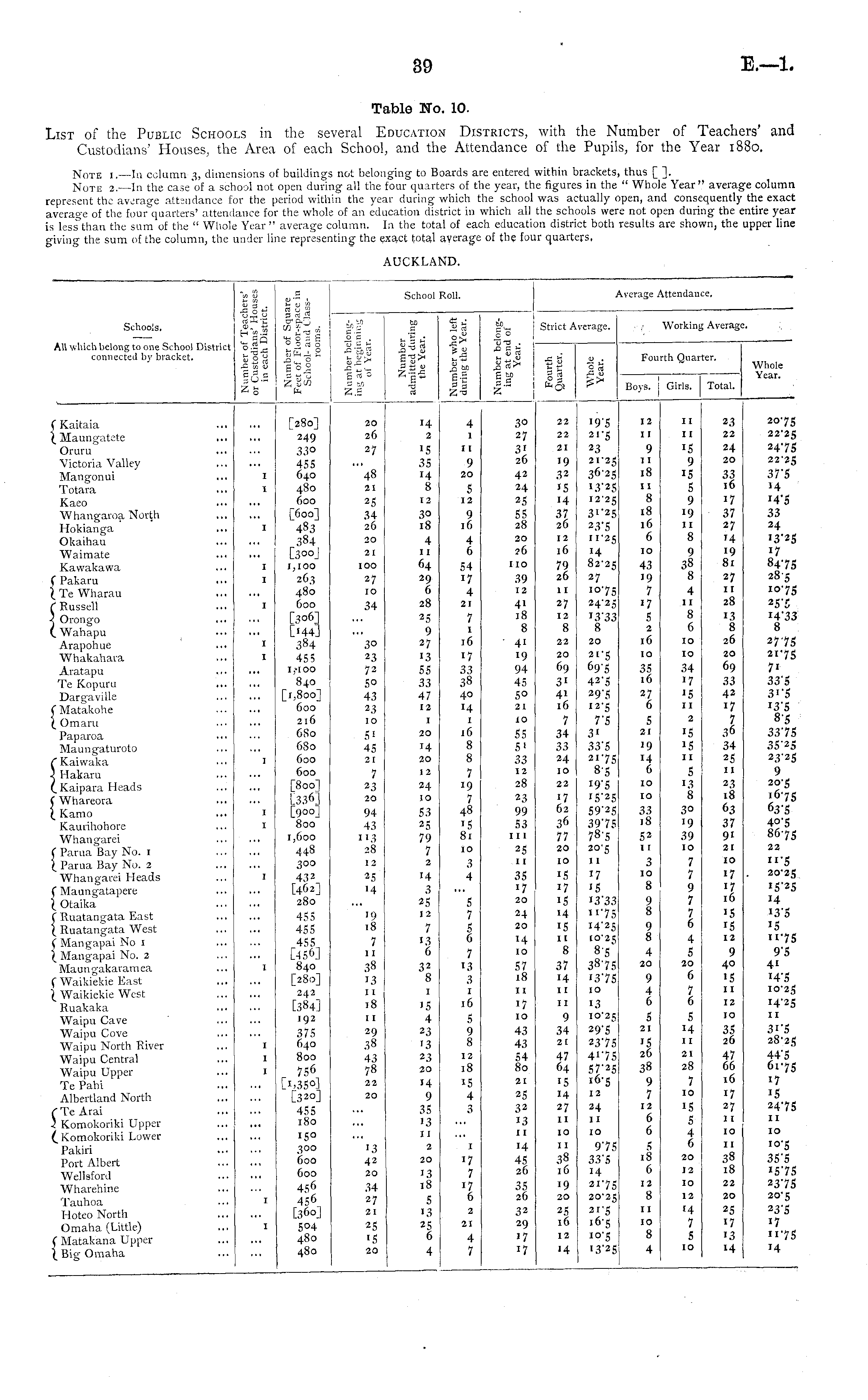Table No. 10. List of the Public Schools in the several Education Districts, with the Number of Teachers' and Custodians' Houses, the Area of each School, and the Attendance of the Pupils, for the Year 1880.