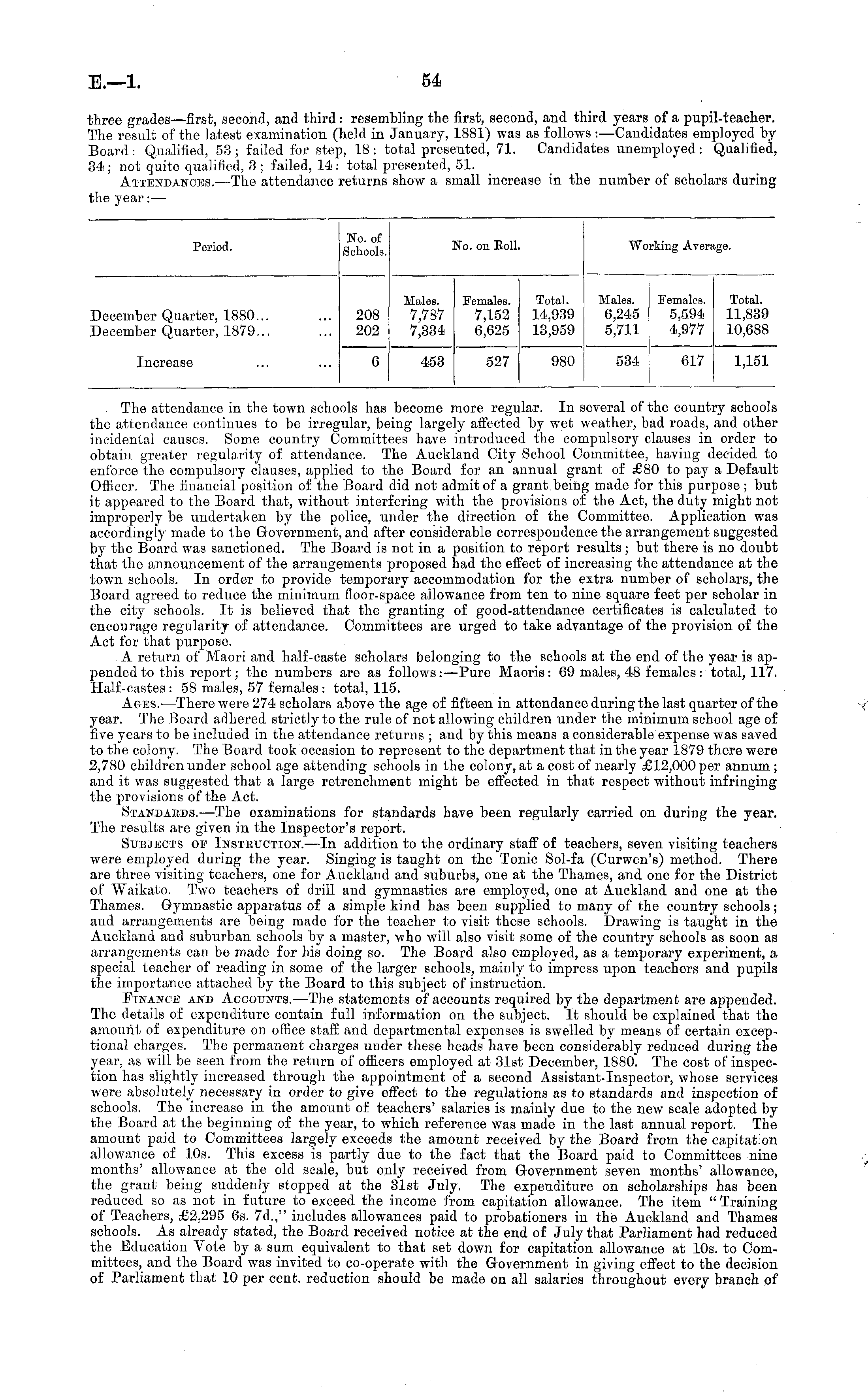 The attendance in the town schools has become more regular. In several of the country schools the attendance continues to be irregular, being largely affected by wet weather, bad roads, and other incidental causes. Some country Committees have introduced the compulsory clauses in order to obtain greater regularity of attendance. The Auckland City School Committee, having decided to enforce the compulsory clauses, applied to the Board for an annual grant of £80 to pay a Default Officer. The financial position of the Board did not admit of a grant being made for this purpose ; but it appeared to the Board that, without interfering with the provisions of the Act, the duty might not improperly be undertaken by the police, under the direction of the Committee. Application was accordingly made to the Government, and after considerable correspondence the arrangement suggested by the Board was sanctioned. The Board is not in a position to report results ; but there is no doubt that the announcement of the arrangements proposed had the effect of increasing the attendance at the town schools. In order to provide temporary accommodation for the extra number of scholars, the Board agreed to reduce the minimum floor-space allowance from ten to nine square feet per scholar in the city schools. It is believed that the granting of good-attendance certificates is calculated to encourage regularity of attendance. Committees are urged to take advantage of the provision of the Act for that purpose. A return of Maori and half-caste scholars belonging to the schools at the end of the year is appended to this report; the numbers are as follows:—Pure Maoris: 69 males, 48 females: total, 117. Half-castes : 58 males, 57 females : total, 115. Ages.—There were 274 scholars above the age of fifteen in attendance during the last quarter of the year. The Board adhered strictly to the rule of not allowing children under the minimum school age of five years to be included in the attendance returns ; and by this means a considerable expense was saved to the colony. The Board took occasion to represent to the department that in the year 1879 there were 2,780 children under school age attending schools in the colony, at a cost of nearly £12,000 per annum ; and it was suggested that a large retrenchment might be effected in that respect without infringing the provisions of the Act. Standards. —The examinations for standards have been regularly carried on during the year. The results are given in the Inspector's report. Subjects or Instruction. —In addition to the ordinary staff of teachers, seven visiting teachers were employed during the year. Singing is taught on the Tonic Sol-fa (Curwen's) method. There are three visiting teachers, one for Auckland and suburbs, one at the Thames, and one for the District of Waikato. Two teachers of drill and gymnastics are employed, one at Auckland and one at the Thames. Gymnastic apparatus of a simple kind has been supplied to many of the country schools; and arrangements are being made for the teacher to visit these schools. Drawing is taught in the Auckland and suburban schools by a master, who will also visit some of the country schools as soon as arrangements can be made for his doing so. The Board also employed, as a temporary experiment, a special teacher of reading in some of the larger schools, mainly to impress upon teachers and pupils the importance attached by the Board to this subject of instruction. Finance and Accounts. —The statements of accounts required by the departmenb are appended. The details of expenditure contain full information on the subject. It should be explained that the amount of expenditure on office staff and departmental expenses is swelled by means of certain exceptional charges. The permanent charges under these heads have been considerably reduced during the year, as will be seen from the return of officers employed at 31st December, 1880. The cost of inspection has slightly increased through the appointment of a second Assistant-Inspector, whose services were absolutely necessary in order to give effect to the regulations as to standards and inspection of schools. The increase in the amount of teachers' salaries is mainly due to the new scale adopted by the Board at the beginning of the year, to which reference was made in the last annual report. The amount paid to Committees largely exceeds the amount received by the Board from the capitation allowance of 10s. This excess is partly due to the fact that the Board paid to Committees nine months' allowance at the old scale, but only received from Government seven months' allowance, the grant being suddenly stopped at the 31st July. The expenditure on scholarships has been reduced so as not in future to exceed the income from capitation allowance. The item " Training of Teachers, £2,295 6s. 7d.," includes allowances paid to probationers in the Auckland and Thames schools. As already stated, the Board received notice at the end of July that Parliament had reduced the Education Vote by a sum equivalent to that set down for capitation allowance at 10s. to Committees, and the Board was invited to co-operate with the Government in giving effect to the decision of Parliament that 10 per cent, reduction should be made on all salaries throughout every branch of