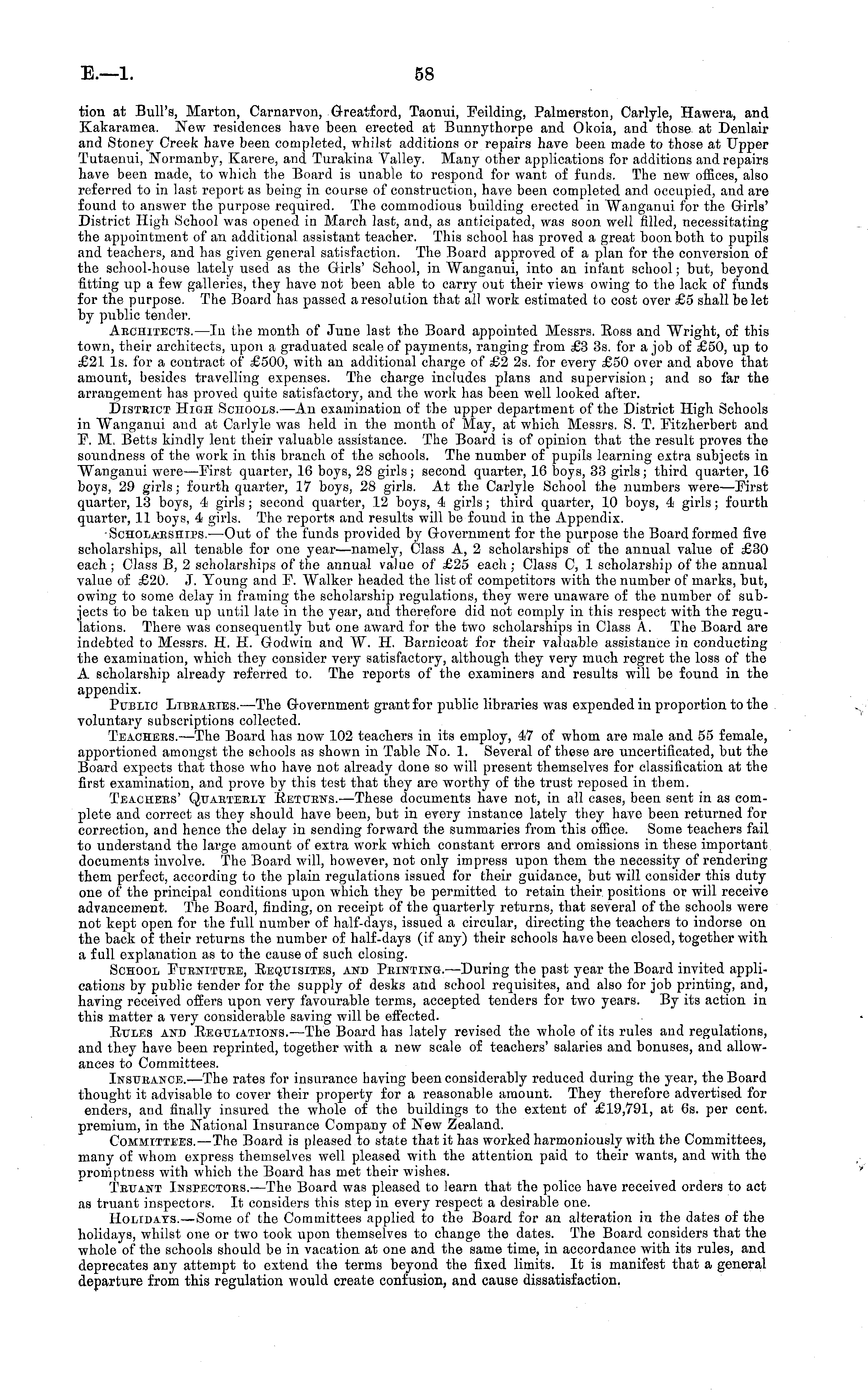 tion at Bull's, Marton, Carnarvon, Greatford, Taonui, Eeilding, Palmerston, Carlyle, Hawera, and Kakaramea. New residences have been erected at Bunnythorpe and Okoia, and those at Denlair and Stoney Creek have been completed, whilst additions or repairs have been made to those at Upper Tutaenui, Normanby, Karere, and Turakina Valley. Many other applications for additions and repairs have been made, to which the Board is unable to respond for want of funds. The new offices, also referred to in last report as being in course of construction, have been completed and occupied, and are found to answer the purpose required. The commodious building erected in Wanganui for the Girls' District High School was opened in March last, and, as anticipated, was soon well filled, necessitating the appointment of an additional assistant teacher. This school has proved a great boon both to pupils and teachers, and has given general satisfaction. The Board approved of a plan for the conversion of the school-house lately used as the Girls' School, in Wanganui, into an infant school; but, beyond fitting up a few galleries, they have not been able to carry out their views owing to the lack of funds for the purpose. The Board has passed a resolution that all work estimated to cost over £5 shall be let by public tender. Architects. —In the month of June last the Board appointed Messrs. Ross and Wright, of this town, their architects, upon a graduated scale of payments, ranging from £3 3s. for a job of £50, up to £21 Is. for a contract of £500, with an additional charge of £2 2s. for every £50 over and above that amount, besides travelling expenses. The charge includes plans and supervision; and so far the arrangement has proved quite satisfactory, and the work has been well looked after. District High Schools. —An examination of the upper department of the District High Schools in Wanganui and at Carlyle was held in the month of May, at which Messrs. S. T. Eitzherbert and E. M. Betts kindly lent their valuable assistance. The Board is of opinion that the result proves the soundness of the work in this branch of the schools. The number of pupils learning extra subjects in Wanganui were —First quarter, 16 boys, 28 girls; second quarter, 16 boys, 33 girls; third quarter, 16 boys, 29 girls; fourth quarter, 17 boys, 28 girls. At the Carlyle School the numbers were —Eirst quarter, 13 boys, 4 girls; second quarter, 12 boys, 4 girls; third quarter, 10 boys, 4 girls; fourth quarter, 11 boys, 4 girls. The reports and results will be found in the Appendix. Scholarships.—Out of the funds provided by Government for the purpose the Board formed five scholarships, all tenable for one year—namely, Class A, 2 scholarships of the annual value of £30 each; Class B, 2 scholarships of the annual value of £25 each; Class C, 1 scholarship of the annual value of £20. J. Young and E. Walker headed the list of competitors with the number of marks, but, owing to some delay in framing the scholarship regulations, they were unaware of the number of subjects to be taken up until late in the year, and therefore did not comply in this respect with the regulations. There was consequently but one award for the two scholarships in Class A. The Board are indebted to Messrs. H. H. Godwin and W. H. Barnicoat for their valuable assistance in conducting the examination, which they consider very satisfactory, although they very much regret the loss of the A scholarship already referred to. The reports of the examiners and results will be found in the appendix. Public Libeaeies. —The Government grant for public libraries was expended in proportion to the voluntary subscriptions collected. Teachers. —The Board has now 102 teachers in its employ, 47 of whom are male and 55 female, apportioned amongst the schools as shown in Table No. 1. Several of these are uncertificated, but the Board expects that those who have not already done so will present themselves for classification at the first examination, and prove by this test that they are worthy of the trust reposed in them. Teachees' Quaeteely Returns.—These documents have not, in all cases, been sent in as complete and correct as they should have been, but in every instance lately they have been returned for correction, and hence the delay in sending forward the summaries from this office. Some teachers fail to understand the large amount of extra work which constant errors and omissions in these important documents involve. The Board will, however, not only impress upon them the necessity of rendering them perfect, according to the plain regulations issued for their guidance, but will consider this duty one of the principal conditions upon which they be permitted to retain their positions or will receive advancement. The Board, finding, on receipt of the quarterly returns, that several of the schools were not kept open for the full number of half-days, issued a circular, directing the teachers to indorse on the back of their returns the number of half-days (if any) their schools have been closed, together with a full explanation as to the cause of such closing. School Eurnituee, Requisites, and Printing.—During the past year the Board invited applications by public tender for the supply of desks and school requisites, and also for job printing, and, having received offers upon very favourable terms, accepted tenders for two years. By its action in this matter a very considerable saving will be effected. Rules and Begulations.—The Board has lately revised the whole of its rules and regulations, and they have been reprinted, together with a new scale of teachers' salaries and bonuses, and allowances to Committees. Insurance. —The rates for insurance having been considerably reduced during the year, the Board thought it advisable to cover their property for a reasonable amount. They therefore advertised for enders, and finally insured the whole of the buildings to the ext