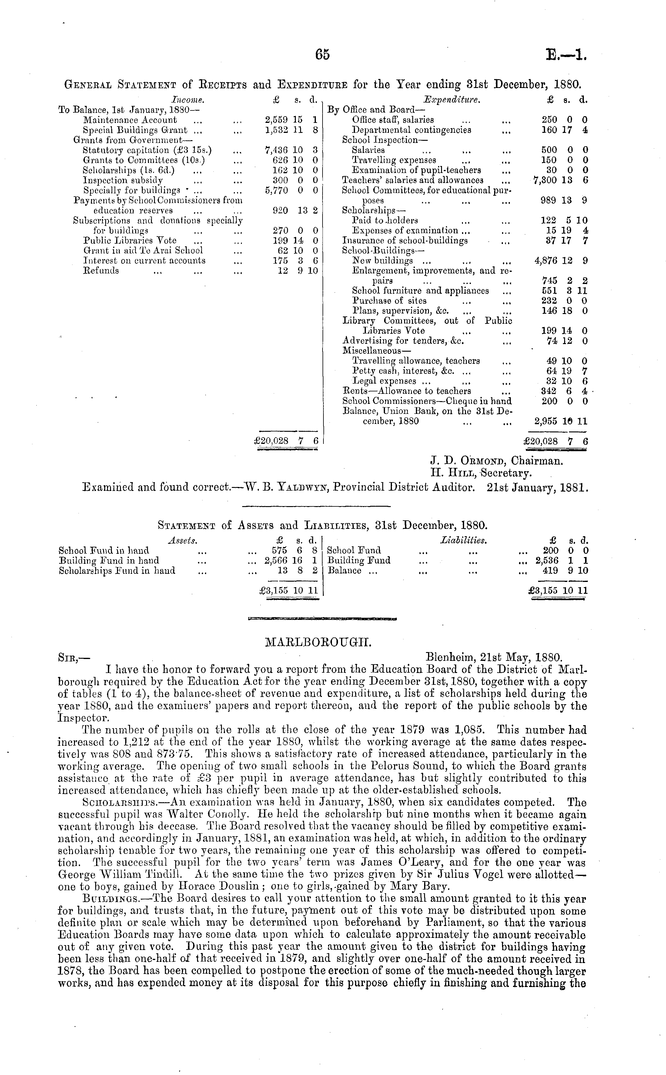 MARLBOROUGH. Sir,— Blenheim, 21st May, 1880. I have the honor to forward you a report from the Education Board of the District of Marlborough required by the Education Act for the year ending December 31st, 1880, together with a copy of tables (1 to 4), the balance-sheet of revenue and expenditure, a list of scholarships held during the year 1880, and the examiners' papers and report thereon, and the report of the public schools by the Inspector. The number of pupils on the rolls at the close of the year 1879 was 1,085. This number had increased to 1,212 at the end of the year 1880, whilst the working average at the same dates respectively was 808 and 87375. This shows a satisfactory rate of increased attendance, particularly in the working average. The opening of two small schools in the Pelorus Sound, to which the Board grants assistance at the rate of £3 per pupil in average attendance, has but slightly contributed to this increased attendance, which has chiefly been made up at the older-established schools. Scholarships.—An examination was held in January, 1880, when six candidates competed. The successful pupil was Walter Conolly. He held the scholarship but nine months when it became again vacant through his decease. The Board resolved that the vacancy should be filled by competitive examination, and accordingly in January, 1881, an examination was held, at which, in addition to the ordinary scholarship tenable for two years, the remaining one year of this scholarship was offered to competition. The successful pupil for the two years' term was James O'Leary, and for the one year was George William Tindill. At the same time the two prizes given by Sir Julius Vogel were allotted— one to boys, gained by Horace Douslin; one to girls,-gained by Mary Bary. Buildings.— The Board desires to call your attention to the small amount granted to it this year for buildings, and trusts that, in the future, payment out of this vote may be distributed upon some definite plan or scale which may be determined upon beforehand by Parliament, so that the various Education Boards may have some data upon which to calculate approximately the amount receivable out of any given vote. During this past year the amount given to the district for buildings having been less than one-half of that received in 1879, and slightly over one-half of the amount received in 1878, the Board has been compelled to postpone the erection of some of the much-needed though larger works, and has expended money at its disposal for this purpose chiefly in finishing and furnishing the