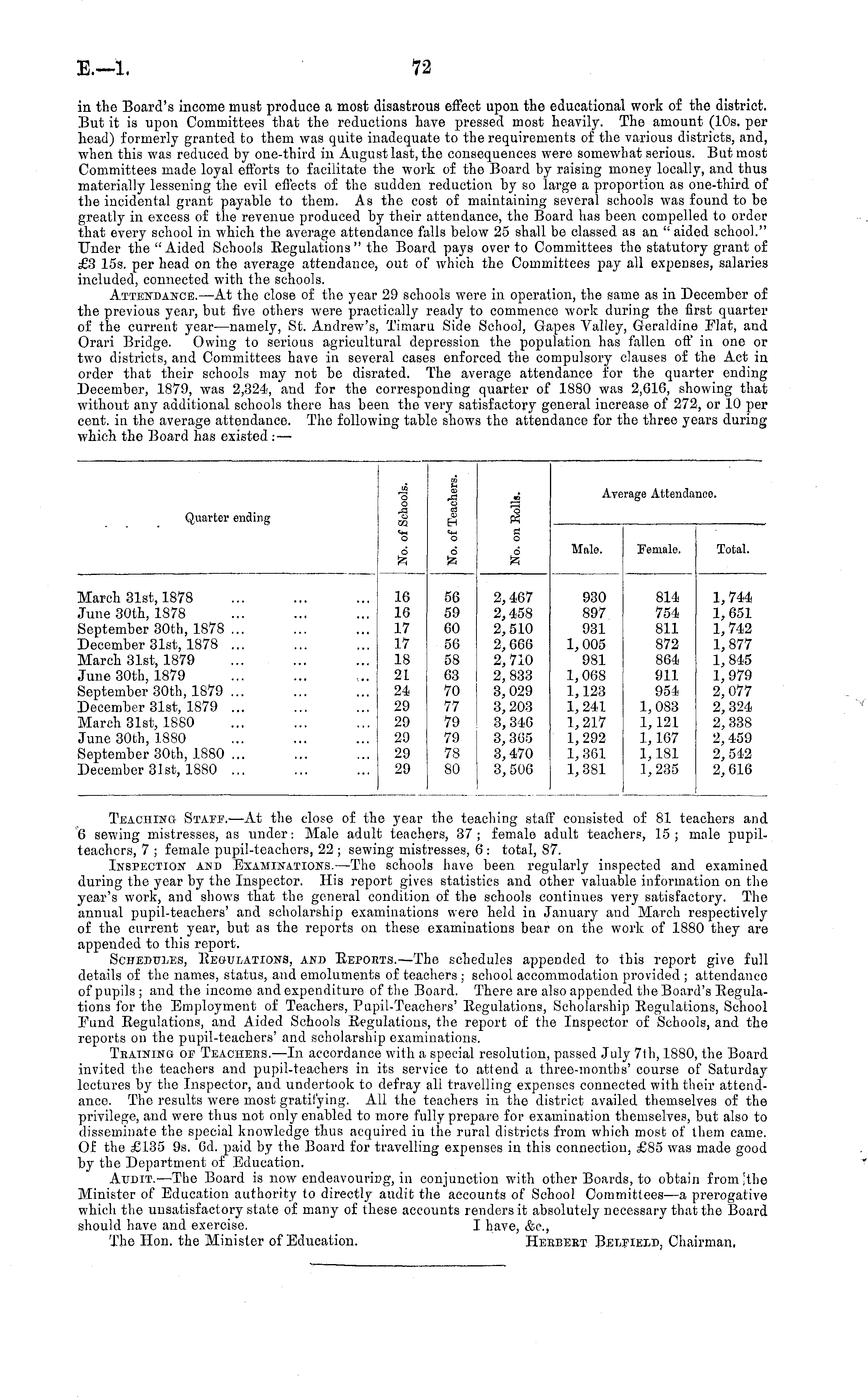 Teaching Staff.—At the close of the year the teaching staff consisted of 81 teachers and 6 sewdng mistresses, as under: Male adult teachers, 37; female adult teachers, 15; male pupilteachers, 7 ; female pupil-teachers, 22 ; sewing mistresses, 6 : total, 87. Inspection and Examinations.—The schools have been regularly inspected and examined during the year by the Inspector. His report gives statistics and other valuable information on the year's work, and shows that the general condition of the schools continues very satisfactory. The annual pupil-teachers' and scholarship examinations were held in January and March respectively of the current year, but as the reports on these examinations bear on the work of 1880 they are appended to this report. Schedules, Regulations, and Repoets.—The schedules appended to this report give full details of the names, status, and emoluments of teachers ; school accommodation provided ; attendance of pupils ; and the income and expenditure of the Board. There are also appended the Board's Begulations for the Employment of Teachers, Pupil-Teachers' Regulations, Scholarship Regulations, School Fund Regulations, and Aided Schools Regulations, the report of the Inspector of Schools, and the reports on the pupil-teachers' and scholarship examinations. Teaining of Teachers. —In accordance with a special resolution, passed July 7th, 1880, the Board invited the teachers and pupil-teachers in its service to attend a three-months' course of Saturday lectures by the Inspector, and undertook to defray all travelling expenses connected with their attendance. The results were most gratifying. All the teachers in the district availed themselves of the privilege, and were thus not only enabled to more fully prepare for examination themselves, but also to disseminate the special knowledge thus acquired in the rural districts from which most of them came. Of the £135 9s. 6d. paid by the Board for travelling expenses in this connection, £85 was made good by the Department of Education. Audit. —The Board is now endeavouring, in conjunction with other Boards, to obtain from Jthe Minister of Education authority to directly audit the accounts of School Committees—a prerogative which the unsatisfactory state of many of these accounts renders it absolutely necessary that the Board should have and exercise. I have, &c, The Hon. the Minister of Education. Herbert Belfield, Chairman.