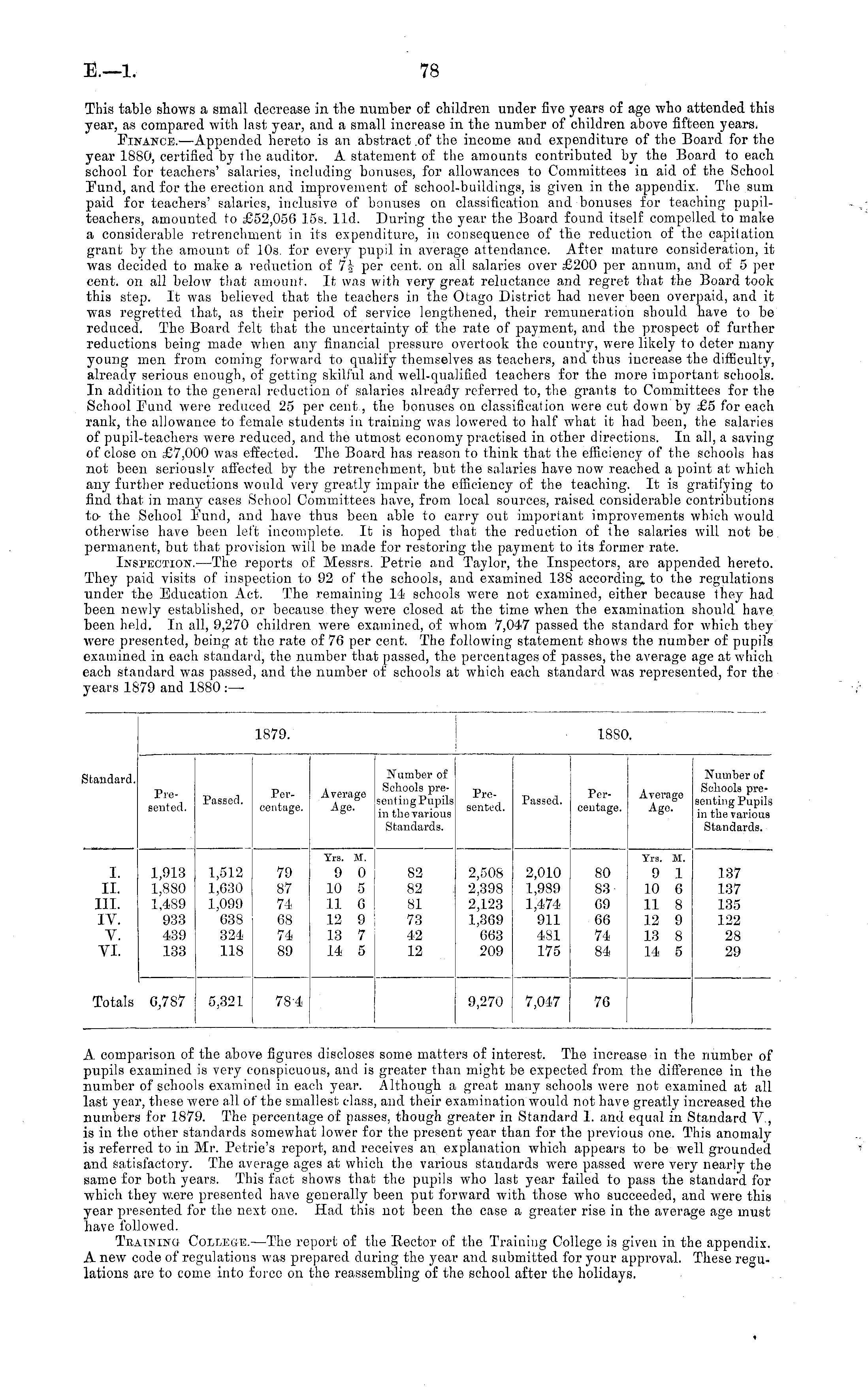 A comparison of the above figures discloses some matters of interest. The increase in the number of pupils examined is very conspicuous, and is greater than might bo expected from the difference in the number of schools examined in each year. Although a great many schools were not examined at all last year, these were all of the smallest class, and their examination would not have greatly increased the numbers for 1879. The percentage of passes, though greater in Standard I. and equal in Standard V, is in the other standards somewhat lower for the present year than for the previous one. This anomaly is referred to in Mr. Petrie's report, and receives an explanation which appears to be well grounded and satisfactory. The average ages at which the various standards were passed were very nearly the same for both years. This fact shows that the pupils who last year failed to pass the standard for which they were presented have generally been put forward with those who succeeded, and were this year presented for the next one. Had this not been the case a greater rise in the average age must have followed. Training College.—The report of the Rector of the Training College is given in the appendix. A new code of regulations was prepared during the year and submitted for your approval. These regulations are to come into force on the reassembling of the school after the holidays.