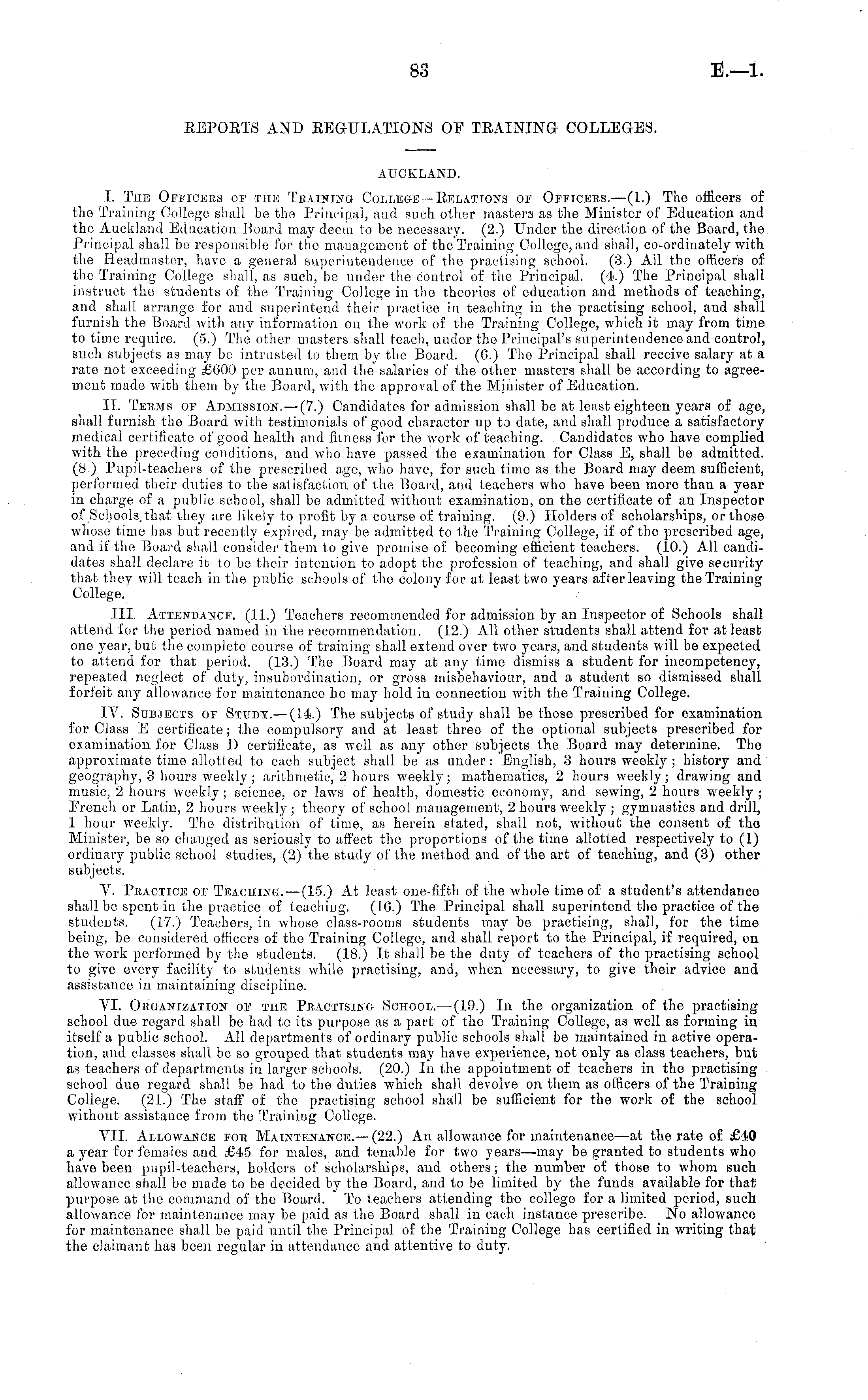 AUCKLAND. I. The Officers of the Training College—Relations of Officers. —(1.) The officers of the Training College shall be the Principal, and such other masters as the Minister of Education and the Auckland Education Board may deem to be necessary. (2.) Under the direction of the Board, the Principal shall bo responsible for the management of the Training College, and shall, co-ordinately with the Headmaster, have a general superintendence of the practising school. (3.) All the officers of the Training College shall, as such, be under the control of the Principal. (4.) The Principal shall instruct the students of the Training College in the theories of education and methods of teaching, and shall arrange for and superintend their practice in teaching in the practising school, and shall furnish the Board with any information on the work of the Training College, which it may from time to time require. (5.) The other masters shall teach, under the Principal's superintendence and control, such subjects as may be intrusted to them by the Board. (6.) The Principal shall receive salary at a rate not exceeding £600 per annum, and the salaries of the other masters shall be according to agreement made with them by the Board, with the approval of the Minister of Education. 11. Teems of Admission.—'(7.) Candidates for admission shall be at least eighteen years of age, shall furnish the Board with testimonials of good character up to date, and shall produce a satisfactory medical certificate of good health and fitness for the work of teaching. Candidates who have complied with the preceding conditions, and who have passed the examination for Class E, shall be admitted. (8.) Pupil-teachers of the prescribed age, who have, for such time as the Board may deem sufficient, performed their duties to the satisfaction of the Board, and teachers who have been more thau a year in charge of a public school, shall be admitted without examination, on the certificate of an Inspector of Schools, that they are likely to profit by a course of training. (9.) Holders of scholarships, or those whoso time has but recently expired, may be admitted to the Training College, if of the prescribed age, and if the Board shall consider them to give promise of becoming efficient teachers. (10.) All candidates shall declare it to bo their intention to adopt the profession of teaching, and shall give security that they will teach in the public schools of the colony for at least two years after leaving the Training College. 111. Attendance. (11.) Teachers recommended for admission by an Inspector of Schools shall attend for the period named in the recommendation. (12.) All other students shall attend for at least one year, but the complete course of training shall extend over two years, and students will be expected to attend for that period. (13.) The Board may at any time dismiss a student for incompetency, repeated neglect of duty, insubordination, or gross misbehaviour, and a student so dismissed shall forfeit any allowance for maintenance he may hold in connection wdth the Training College. IV. Subjects of Study.—(l 4.) The subjects of study shall be those prescribed for examination for Class E certificate; the compulsory and at least three of the optional subjects prescribed for examination for Class D certificate, as well as any other subjects the Board may determine. The approximate time allotted to each subject shall be as under : English, 3 hours weekly ; history and geography, 3 hours weekly; arithmetic, 2 hours weekly; mathematics, 2 hours weekly; drawing and music, 2 hours weekly ; science, or laws of health, domestic economy, and sewing, 2 hours weekly ; French or Latin, 2 hours weekly; theory of school management, 2 hours weekly ; gymnastics and drill, 1 hour weekly. The distribution of time, as herein stated, shall not, without the consent of the Minister, be so changed as seriously to affect the proportions of the time allotted respectively to (1) ordinary public school studies, (2) the study of the method and of the art of teaching, and (3) other subjects. V. Practice of Teaching.—(ls.) At least one-fifth of the whole time of a student's attendance shall be spent in the practice of teaching. (16.) The Principal shall superintend the practice of the students. (17.) Teachers, in whose class-rooms students may be practising, shall, for the time being, be considered officers of the Training College, and shall report to the Principal, if required, on the work performed by the students. (18.) It shall be the duty of teachers of the practising school to give every facility to students while practising, and, when necessary, to give their advice and assistance in maintaining discipline. VI. Organization of the Practising School. — (19.) In the organization of the practising school due regard shall be had to its purpose as a part of the Training College, as well as forming in itself a public school. All departments of ordinary public schools shall be maintained in active operation, and classes shall be so grouped that students may have experience, not only as class teachers, but as teachers of departments in larger schools. (20.) In the appointment of teachers in the practising school due regard shall be had to the duties which shall devolve on them as officers of the Training College. (21.) The staff of the practising school shall be sufficient for the work of the school without assistance from the Training College. VII. Allowance for Maintenance. — (22.) An allowance for maintenance —at the rate of £40 a year for females and £45 for males, and. tenable for two years—may be granted to students who have been pupil-teachers, holders of scholarships, and others; the number of those to whom such allowance shall be made to be decided by the Board, and to be limited by the funds available for that purpose at the command of the Board. To teachers attending the college for a limited period, such allowance for